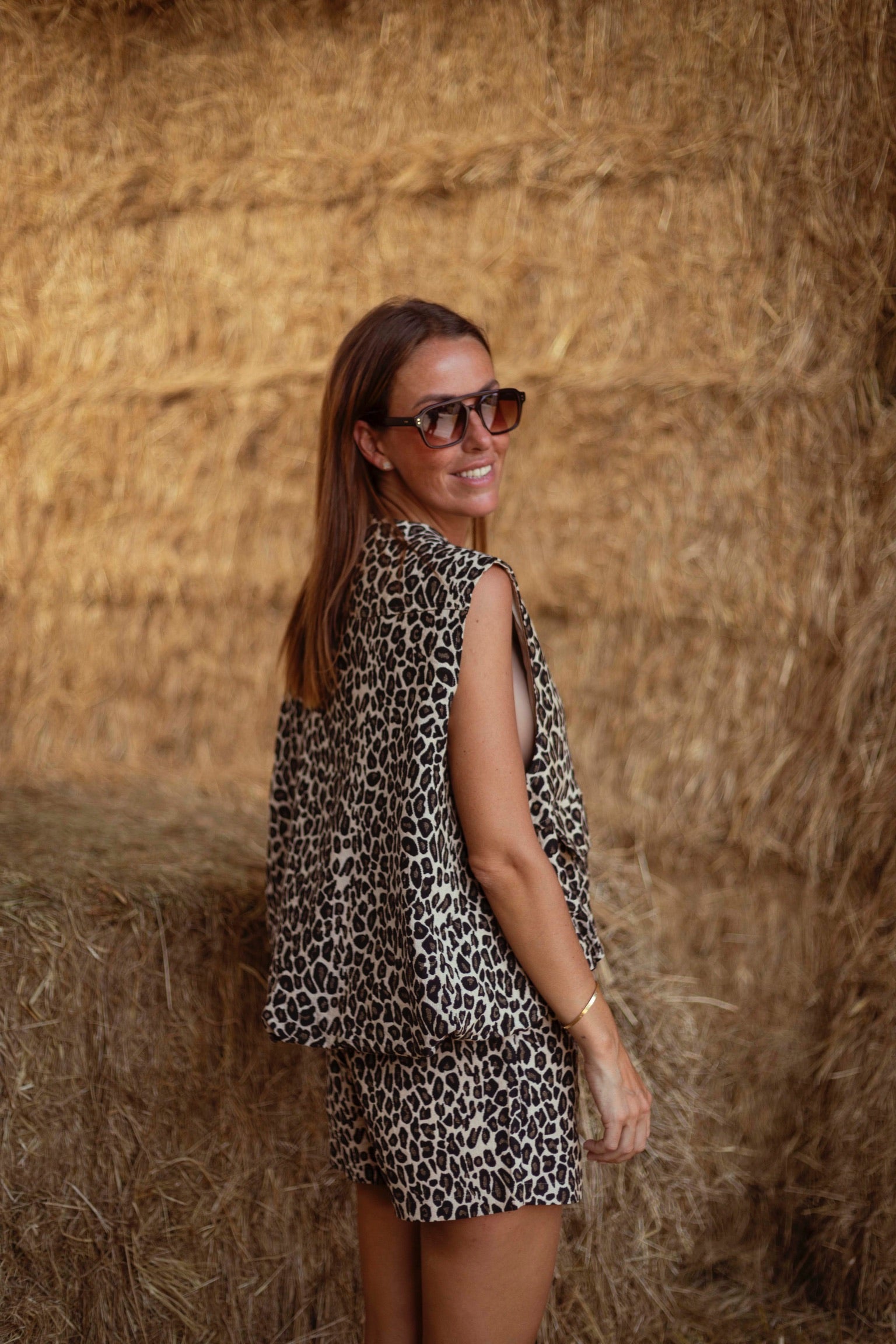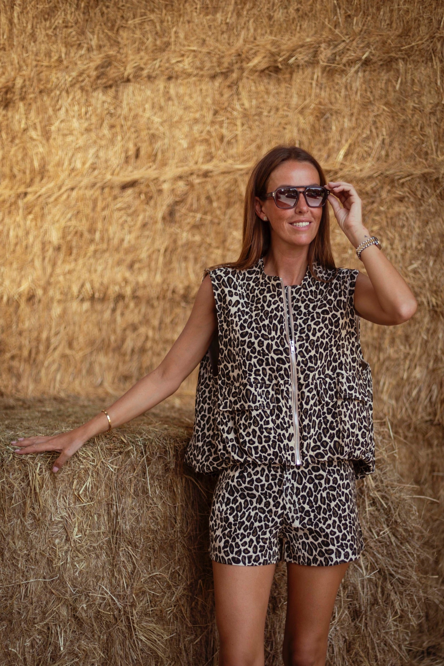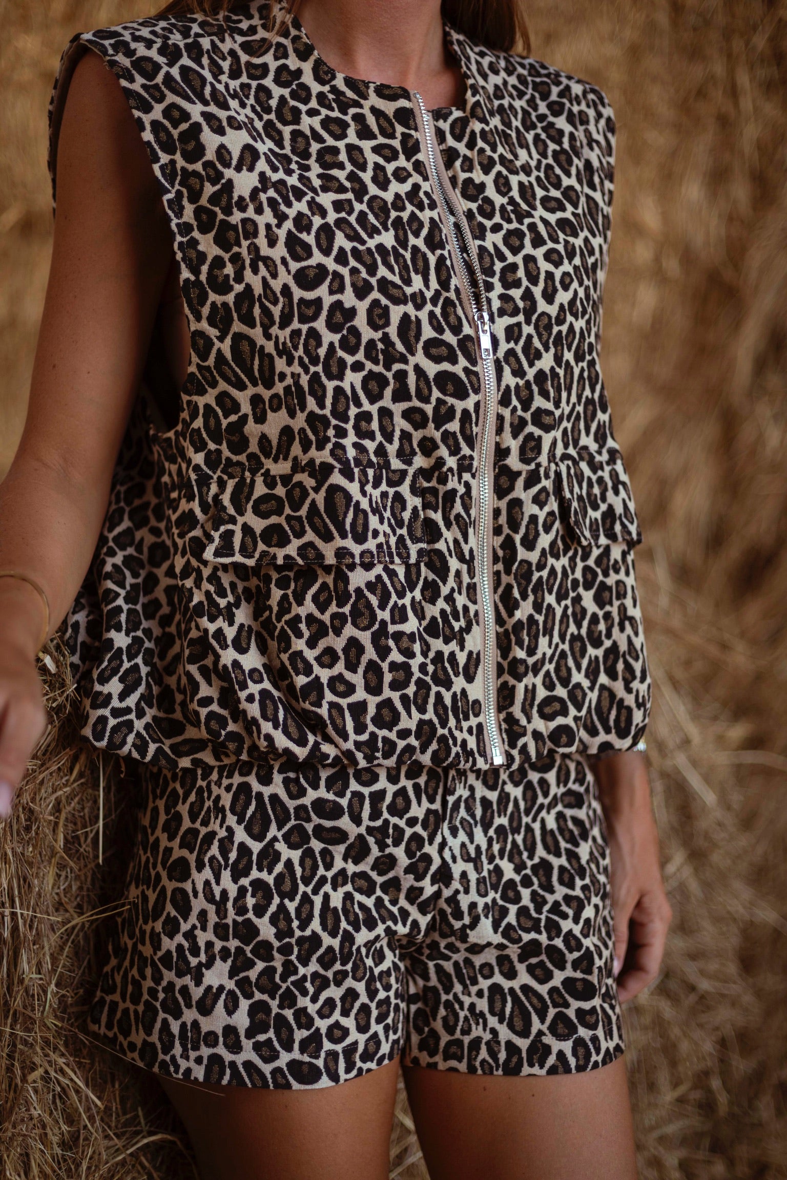 Een mouwloos jasje in warme beige tint met een subtiele luipaardprint die zorgt voor een stijlvolle en gedurfde herfstlook. Het lichte, zachte materiaal maakt het perfect om over een trui of blouse te dragen tijdens koelere dagen. Combineer het met de bijpassende short voor een moeiteloze en trendy outfit.