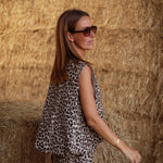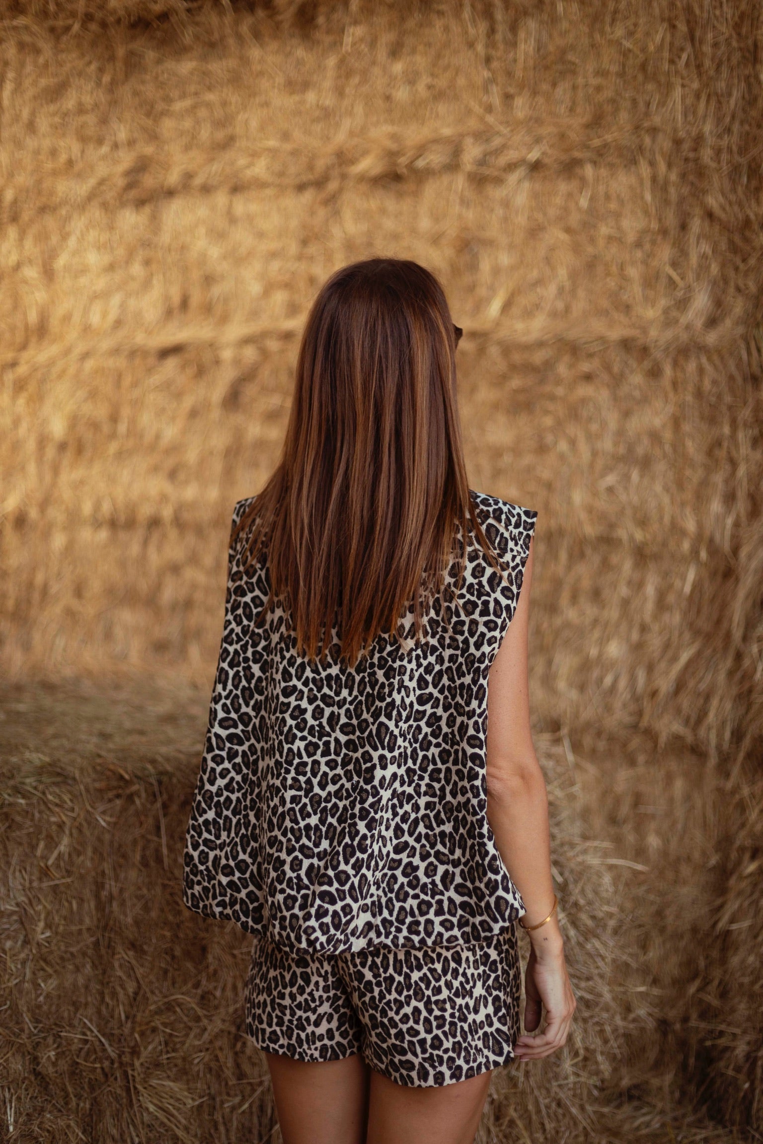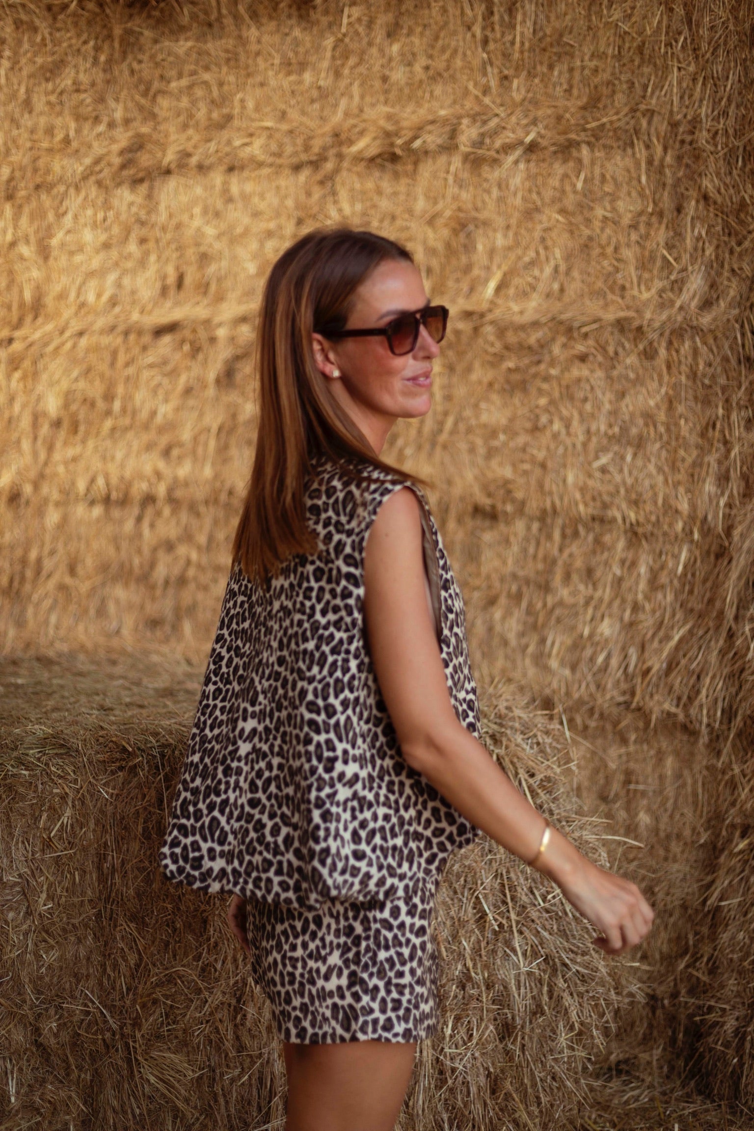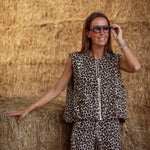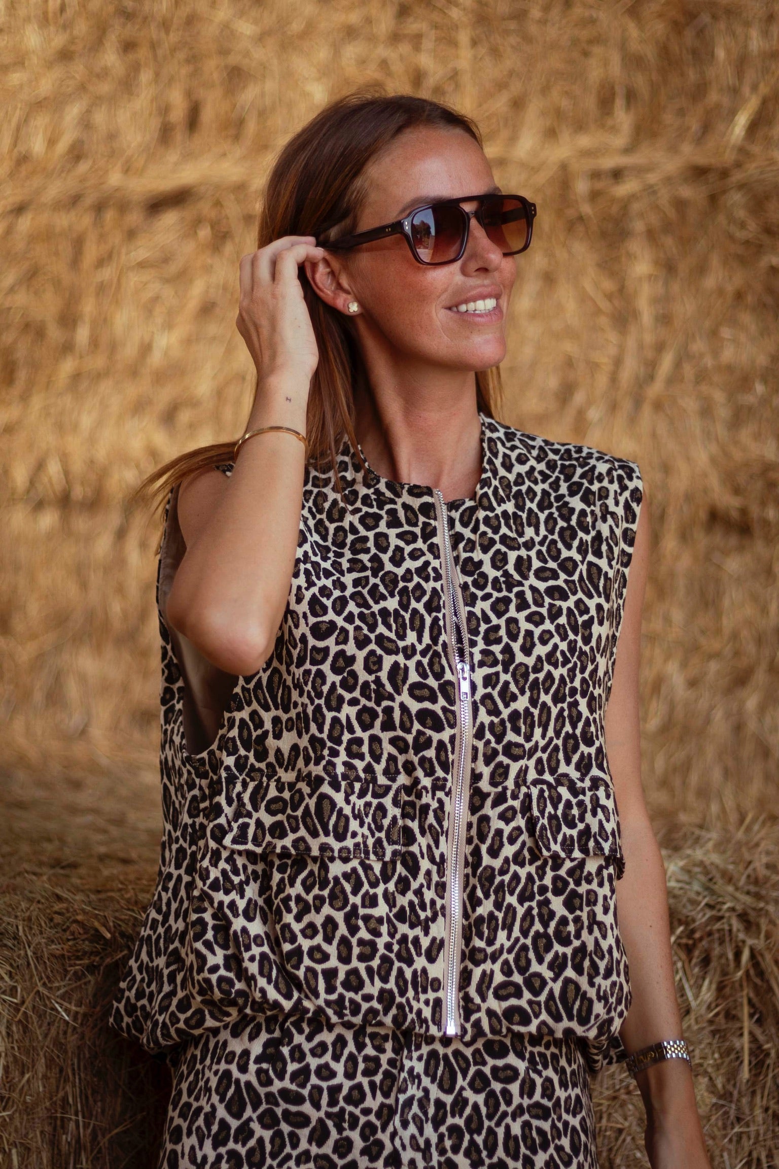 Een mouwloos jasje in warme beige tint met een subtiele luipaardprint die zorgt voor een stijlvolle en gedurfde herfstlook. Het lichte, zachte materiaal maakt het perfect om over een trui of blouse te dragen tijdens koelere dagen. Combineer het met de bijpassende short voor een moeiteloze en trendy outfit.