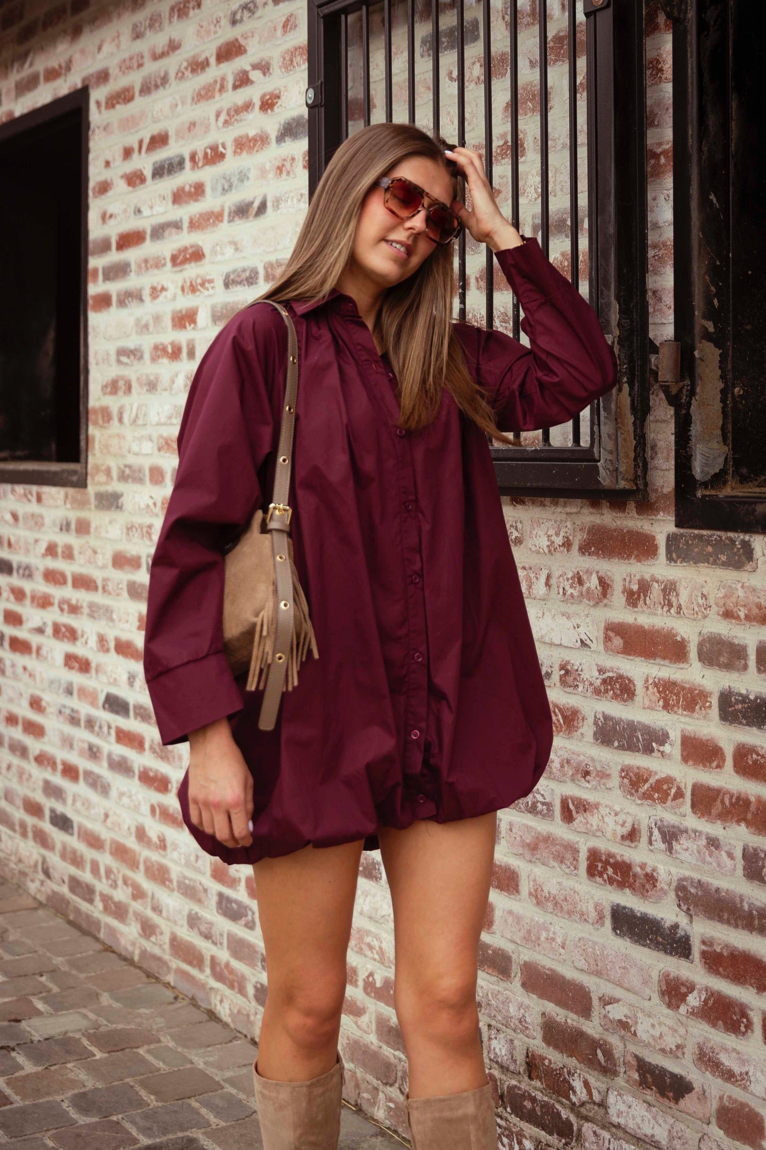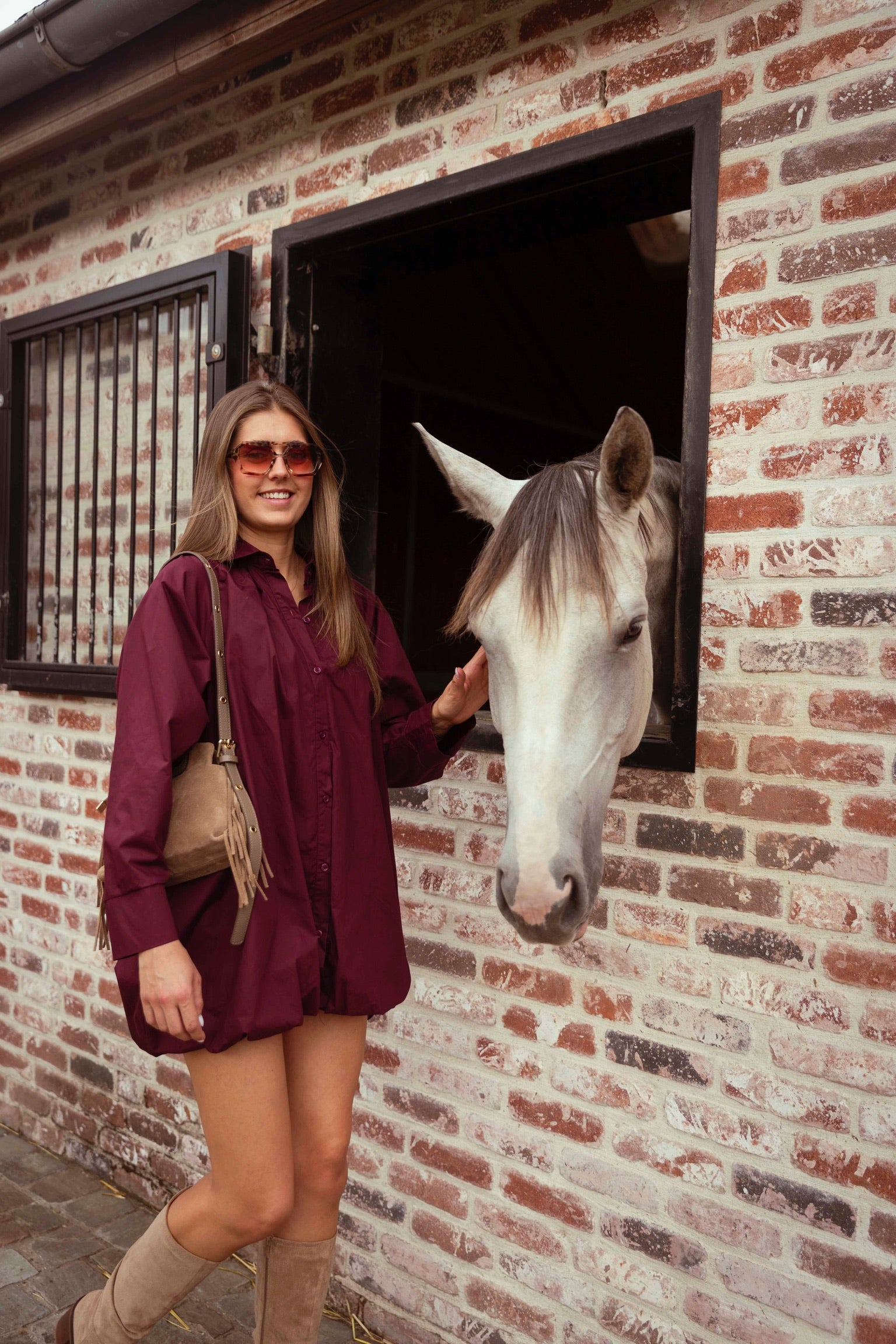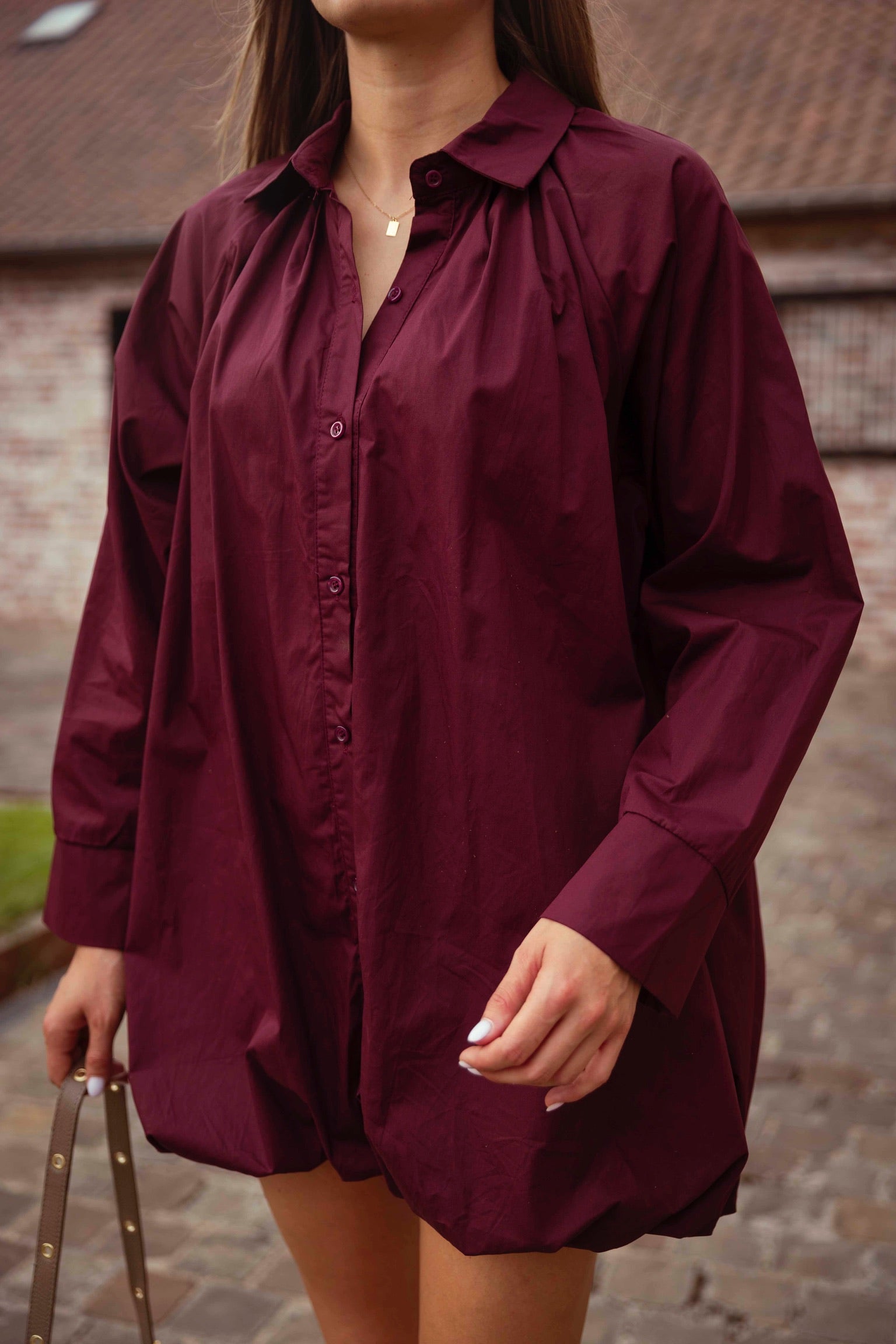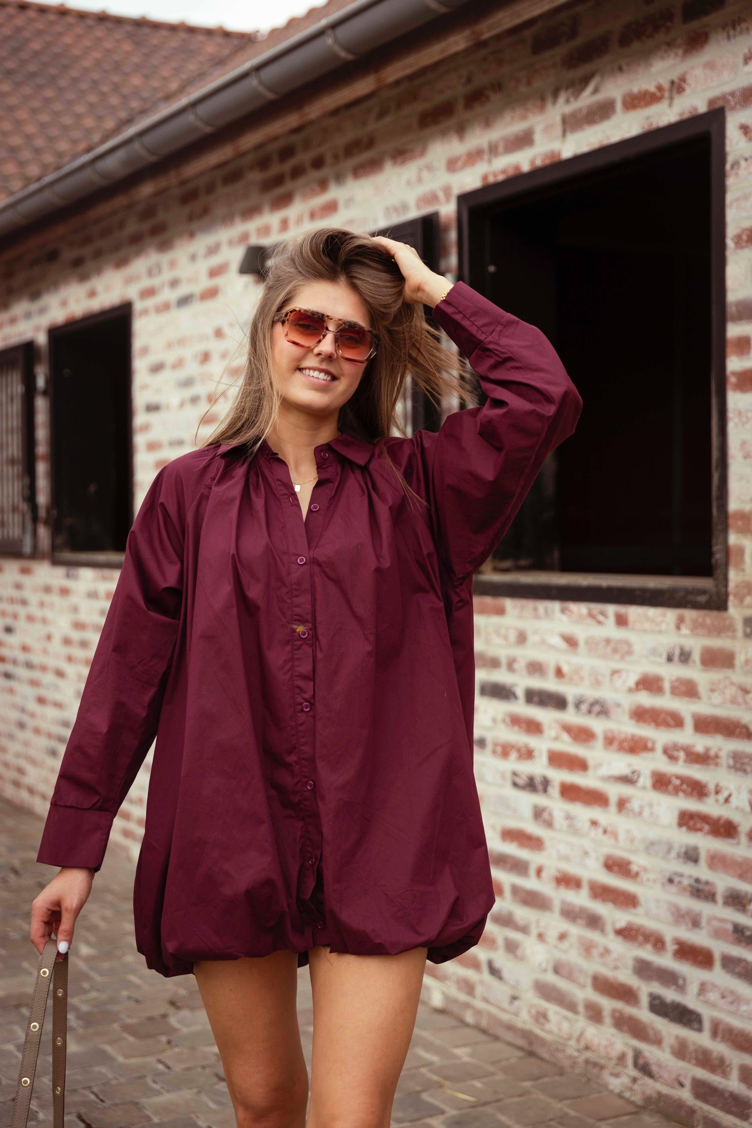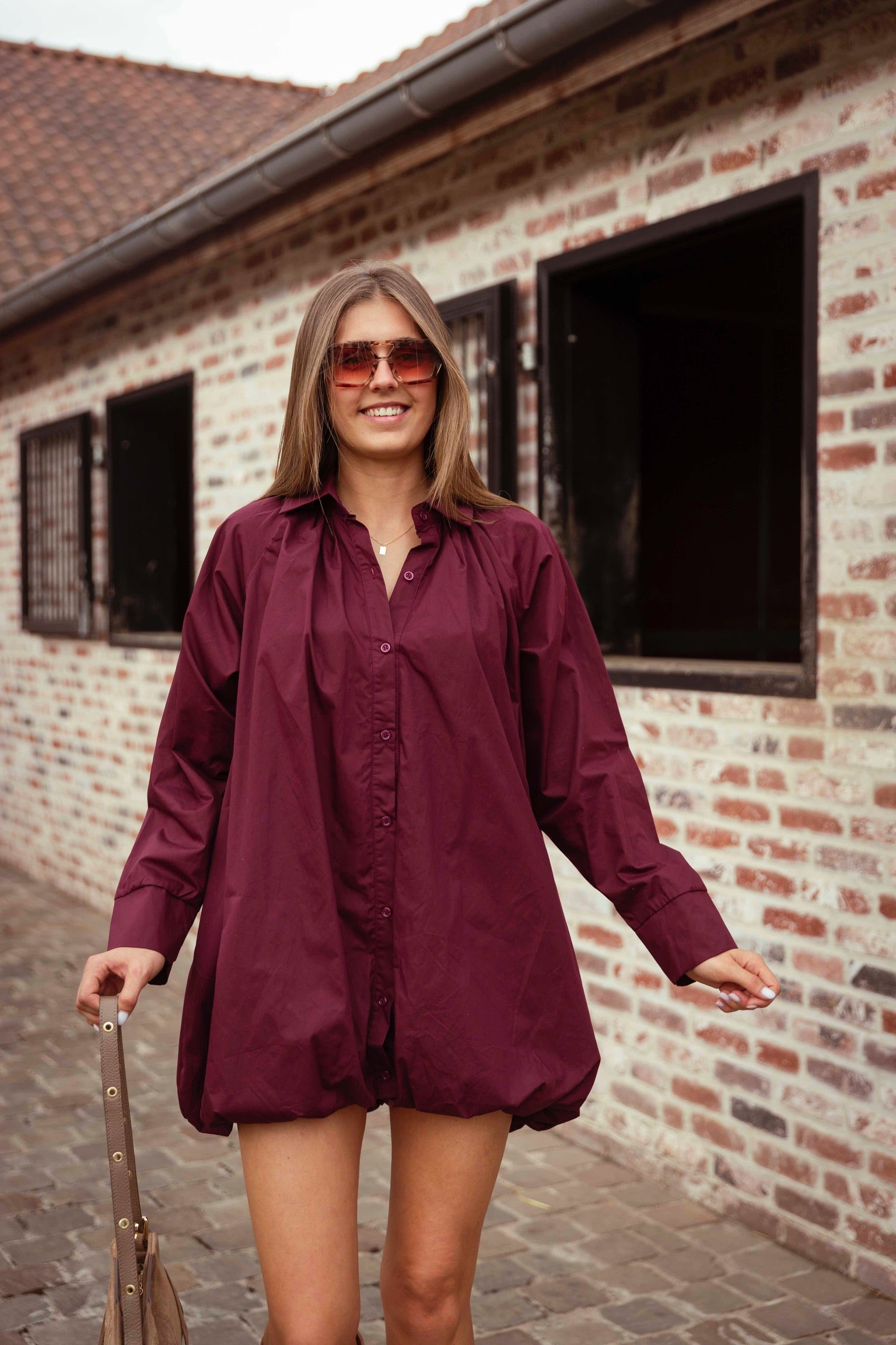 Deze korte jurk in warm bordeauxrood heeft een speels, puffy effect aan de onderkant voor een extra vrouwelijke en trendy touch. Perfect te combineren met dikke panty’s en stoere boots voor een knusse en stijlvolle herfstlook.