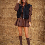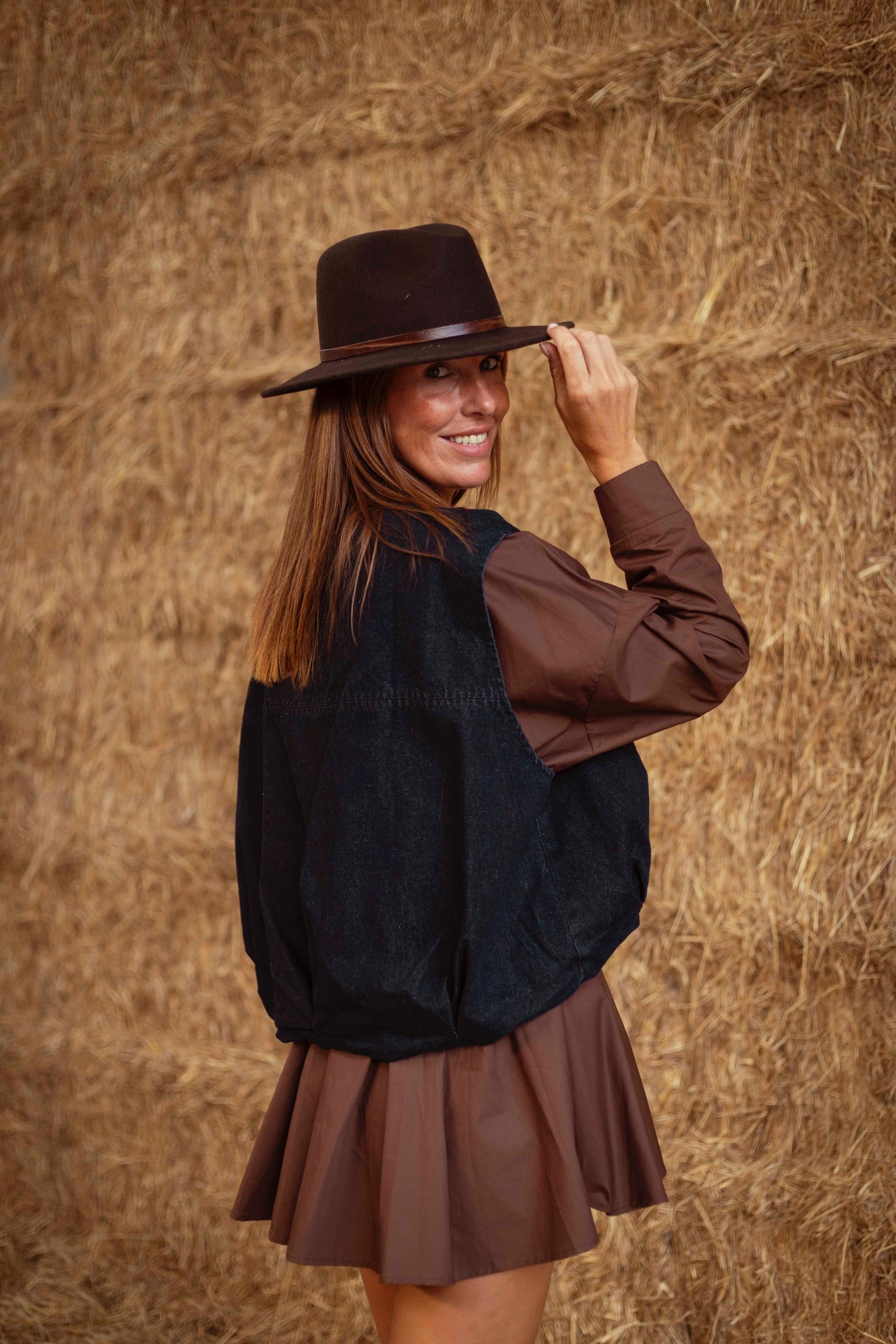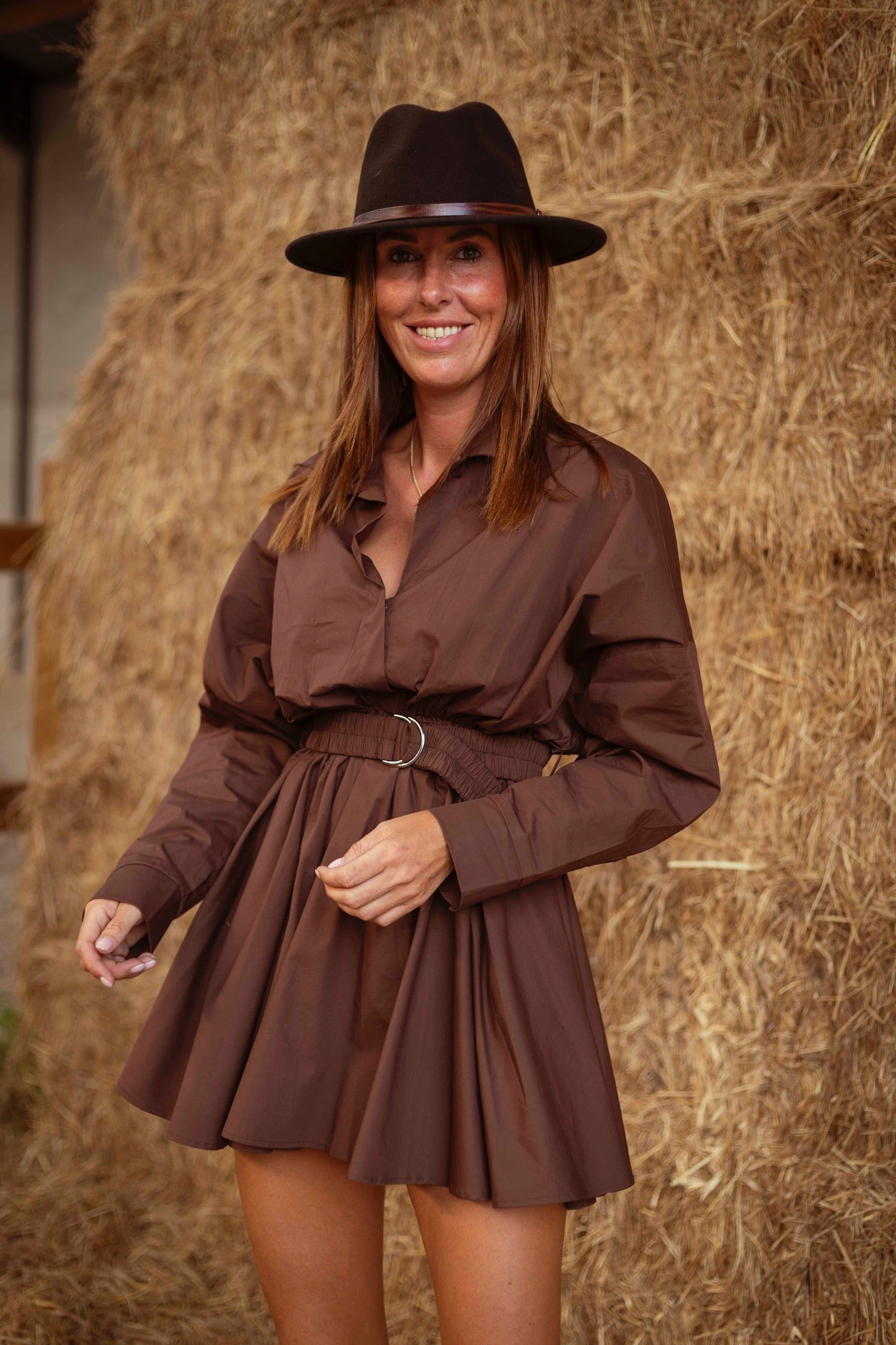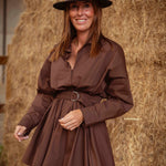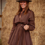 Met zijn warme bruine tint en bijpassende ceintuur ademt deze jurk pure western-elegantie. De soepele stof valt moeiteloos, terwijl de tailleband je silhouet mooi accentueert, perfect voor een zonnige herfstdag met laarzen en een hoed.