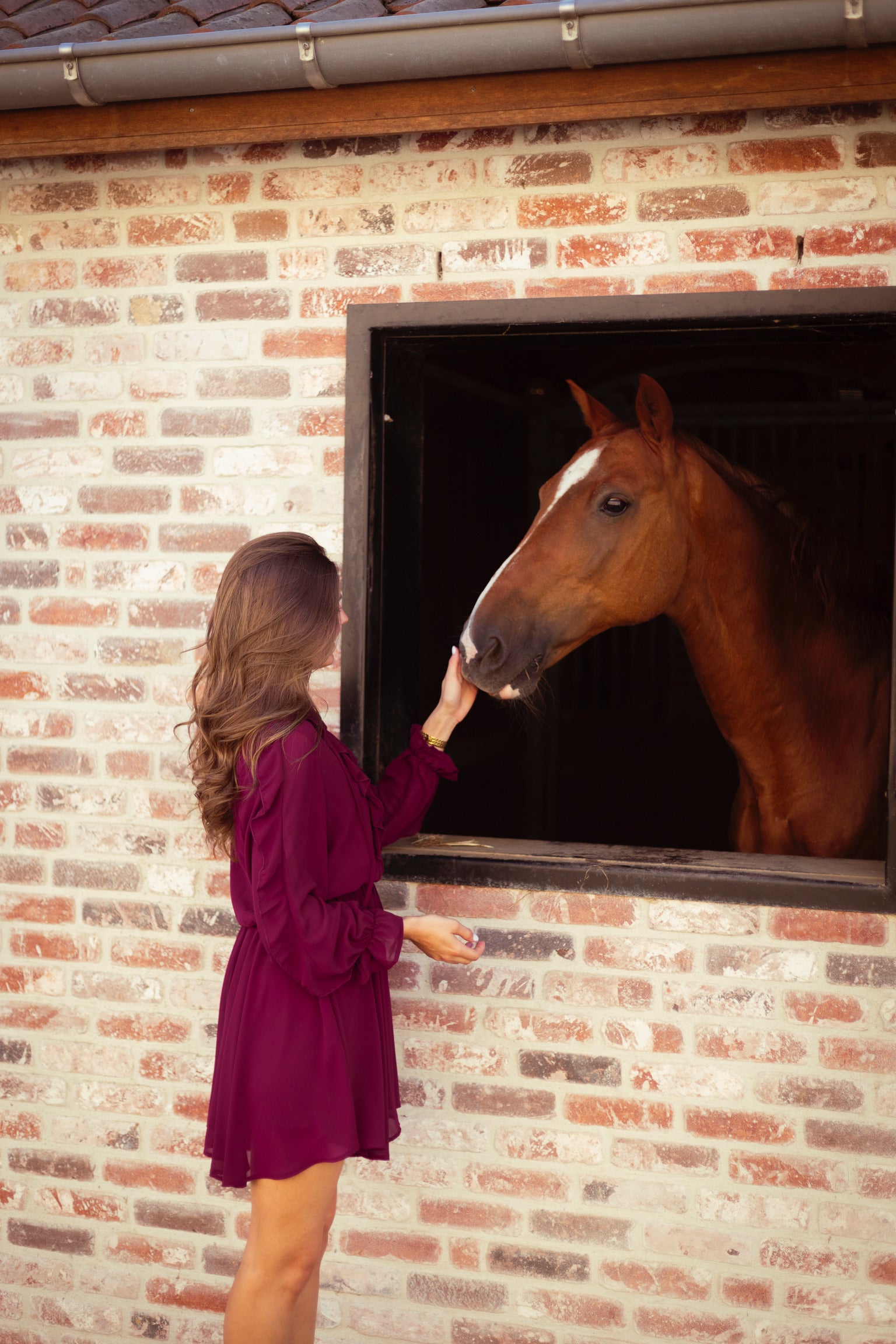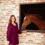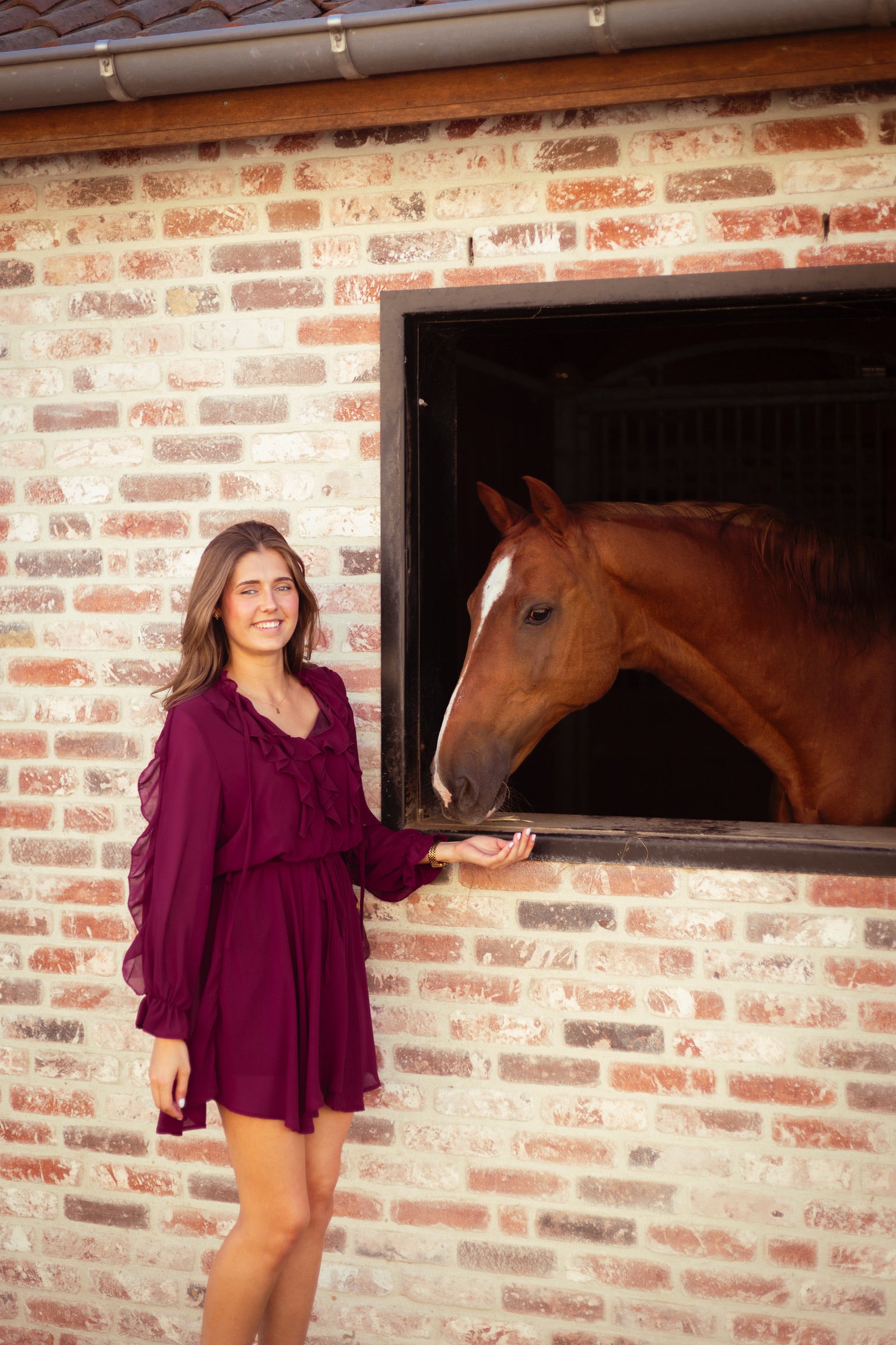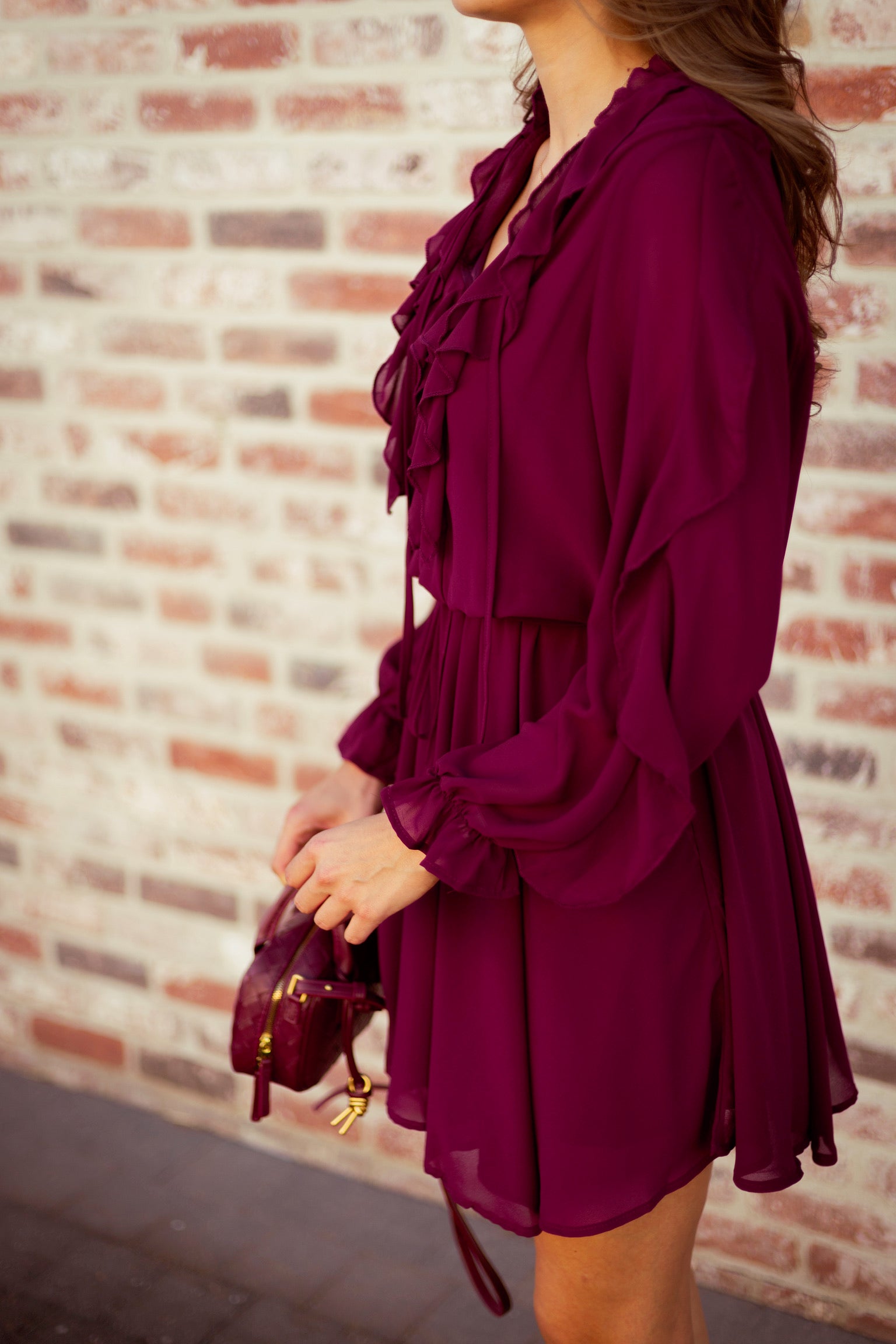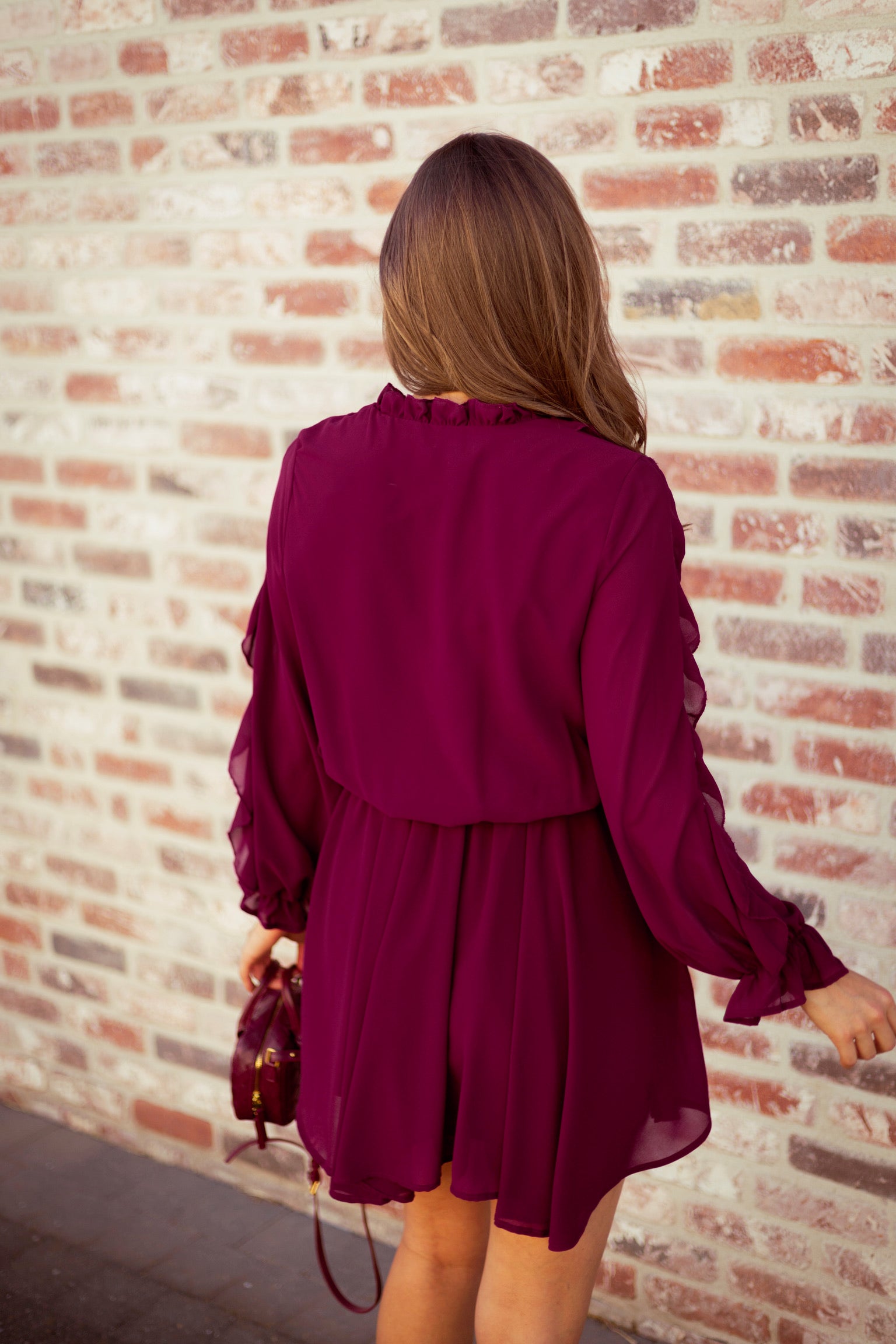 Een romantisch jurkje met speelse ruches en lange mouwen, ideaal voor het najaar. De diepe tint en zwierige snit maken het perfect voor zowel een avondje uit als een geklede daglook met boots of hakjes.