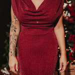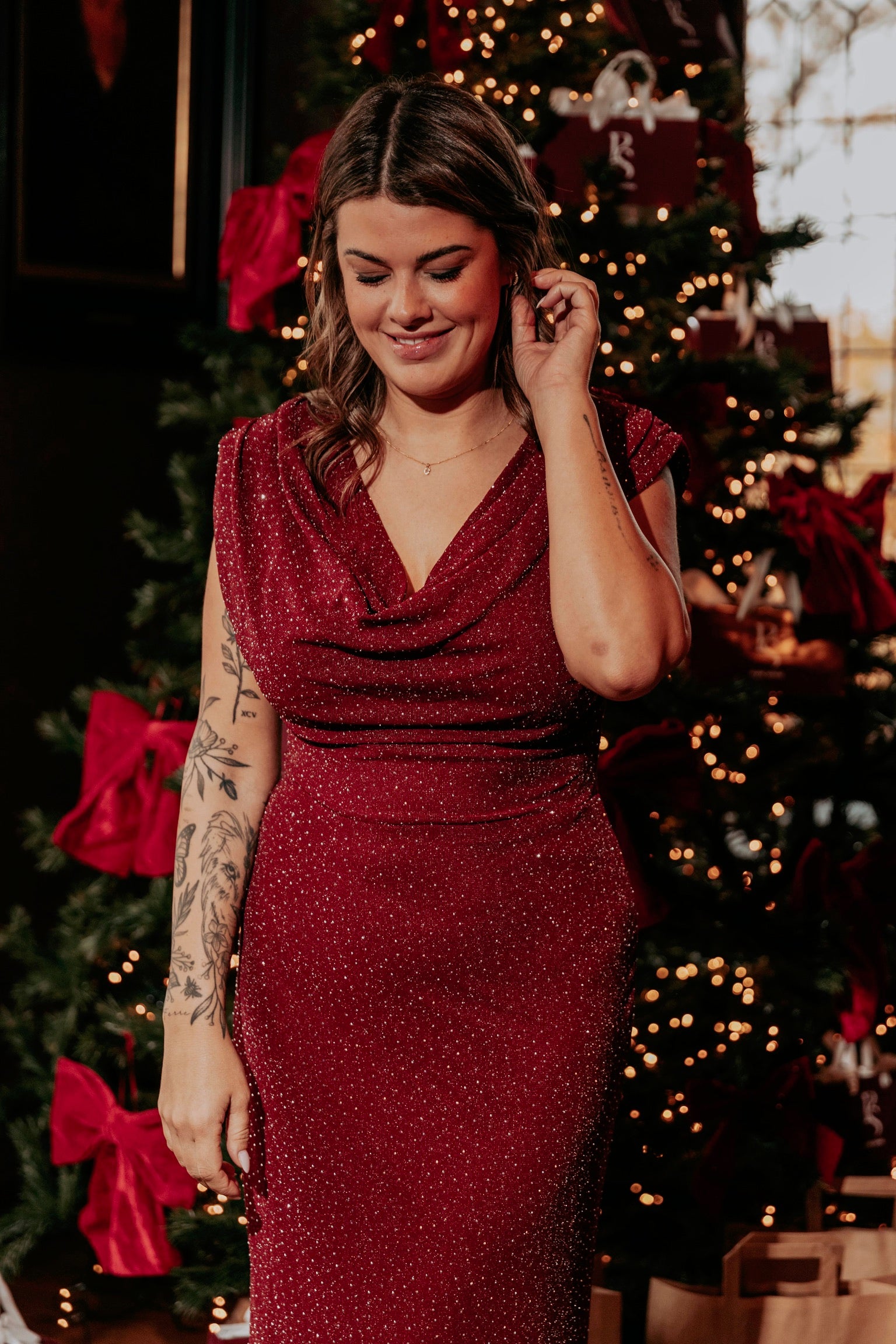Een lange, speels gedrapeerde creatie die door de fijne steentjes bij elke beweging fonkelt alsof je in het middelpunt van het feest staat. De sprankeling geeft een vrolijke, levendige uitstraling die meteen sfeer brengt. Ideaal voor feestdagen vol plezier, muziek en mooie momenten.