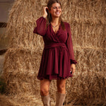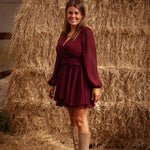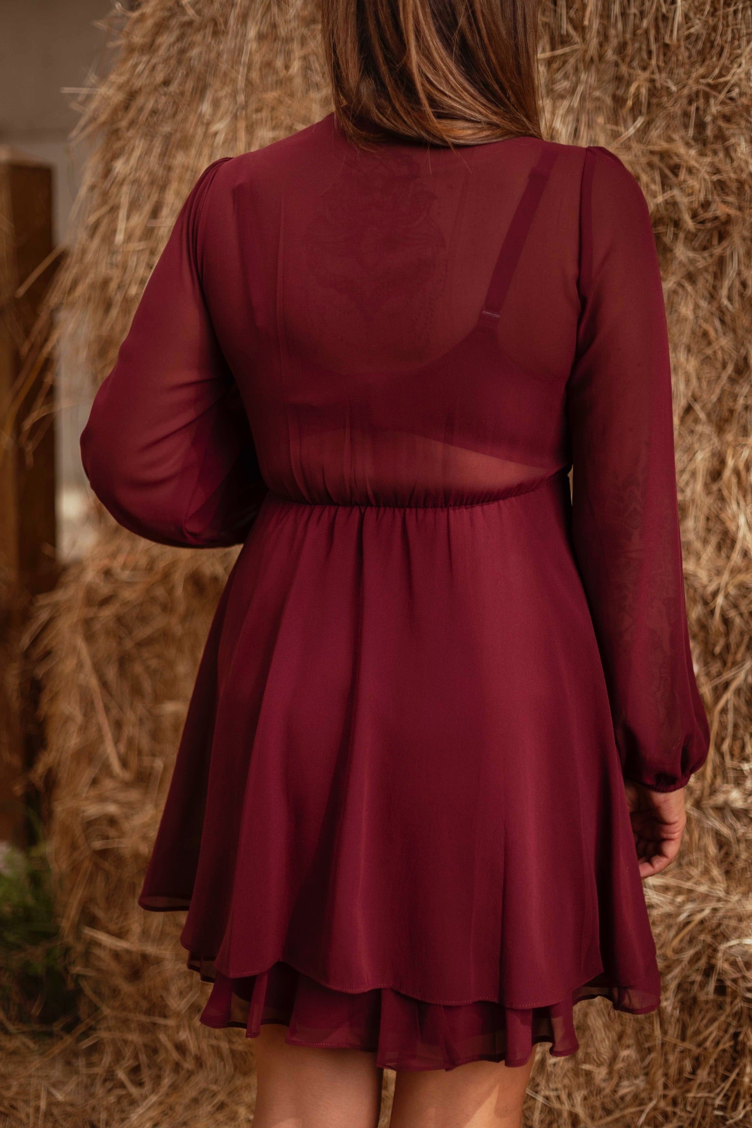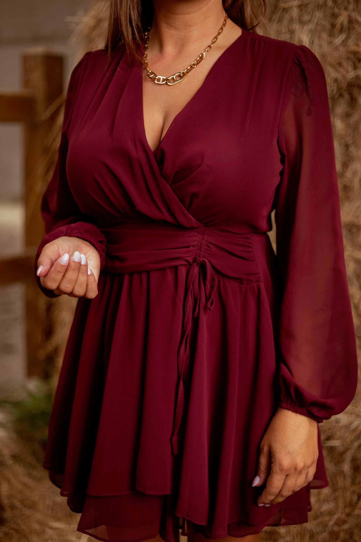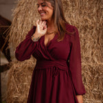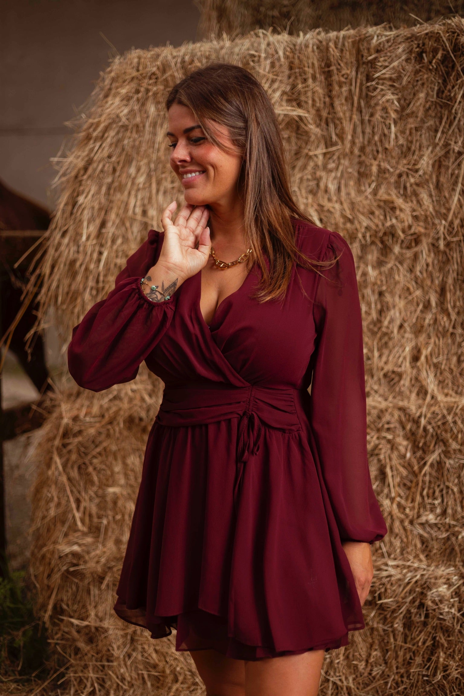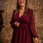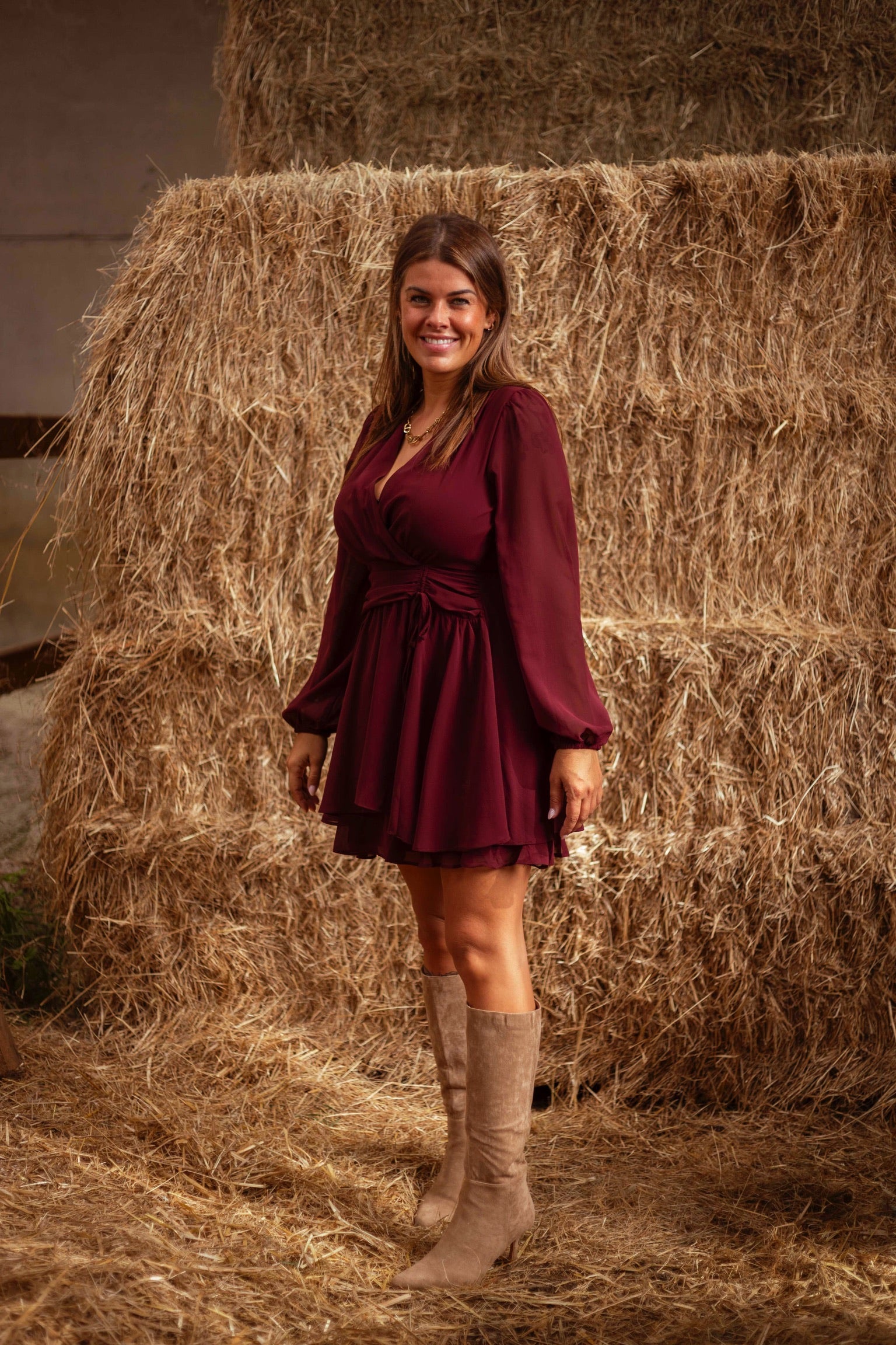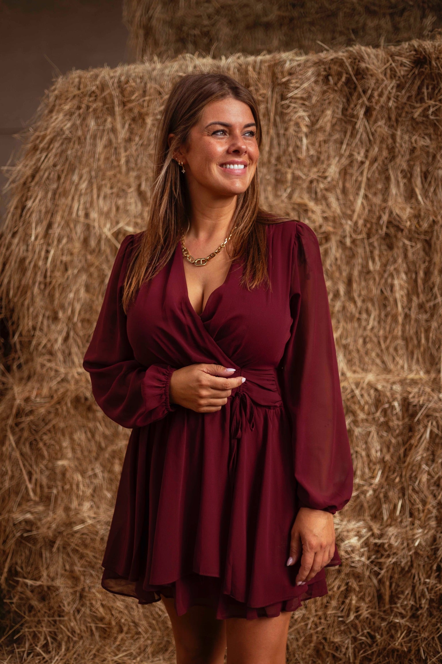 Deze jurk combineert een flatterende snit met een diepe, warme kleur die perfect past bij het seizoen. De lange mouwen en elegante halslijn geven het stuk een vrouwelijke maar krachtige uitstraling. Ideaal voor zowel overdag als avondplannen.