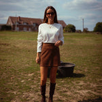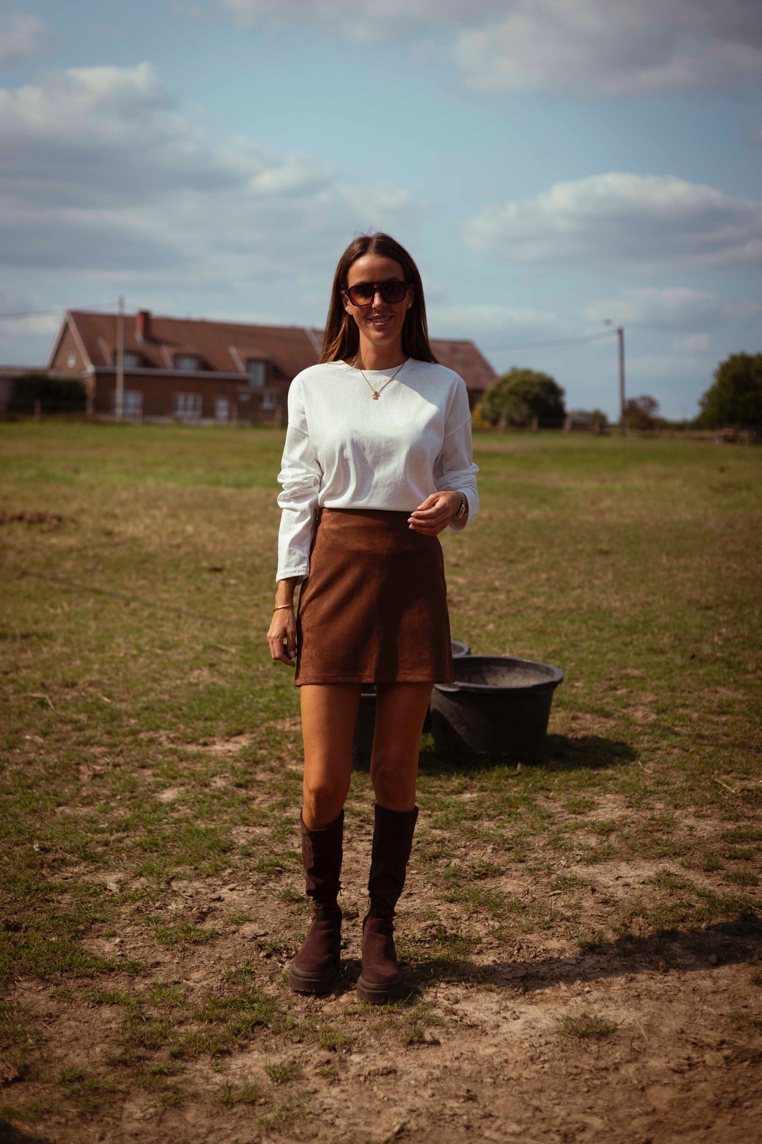 Met zijn zachte suède textuur en warme cameltint doet deze rok denken aan een zonsondergang boven gouden herfstvelden. Het flatterende model laat zich moeiteloos stylen met een chunky trui en hoge laarzen voor een knusse, elegante look.