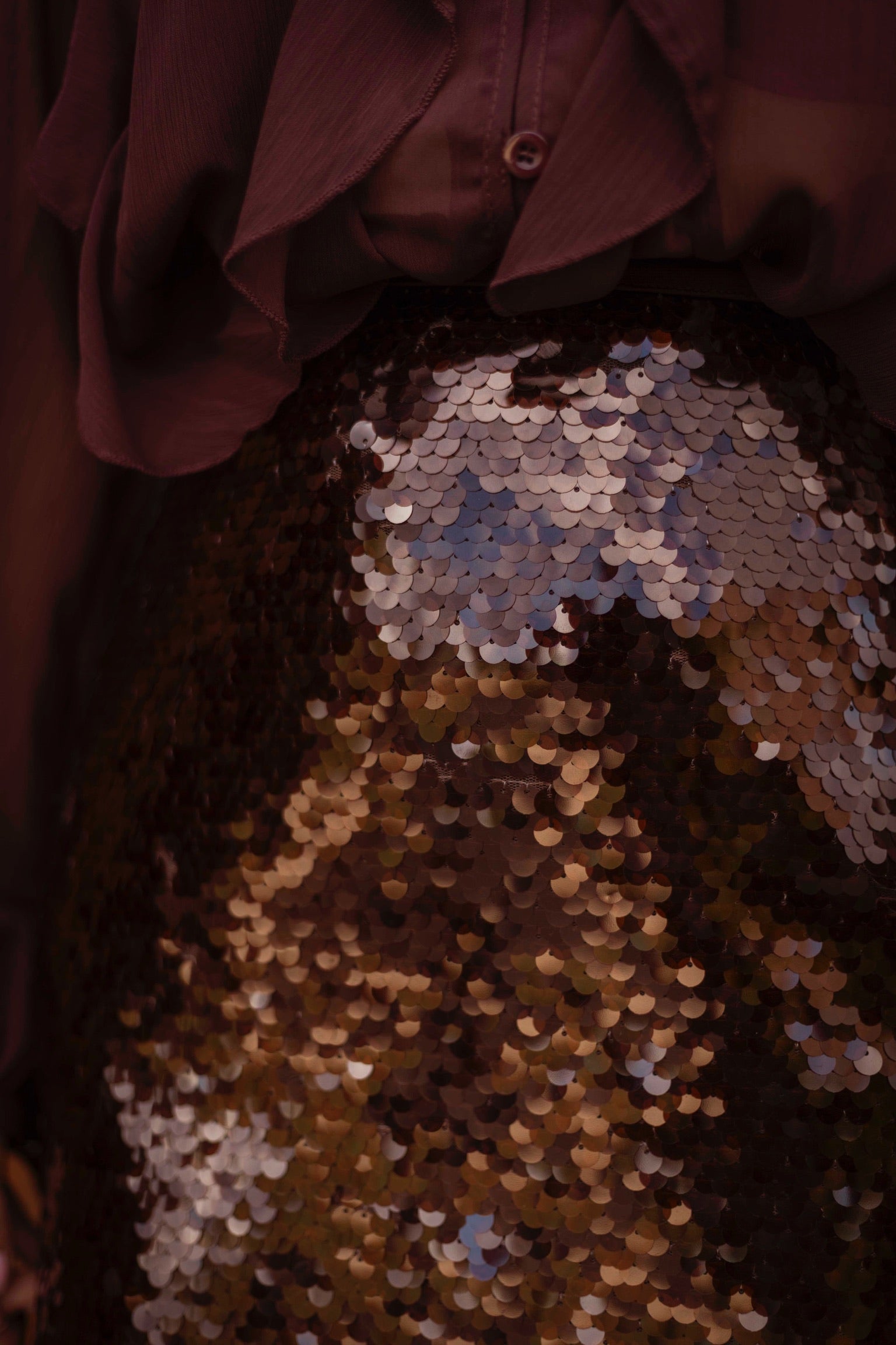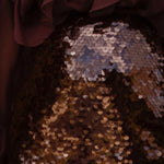 Deze bruine paillettenrok vangt het warme licht van de herfst en laat het subtiel glinsteren bij elke stap. De combinatie van een rijke kleur en sprankelende details maakt haar perfect voor zowel feestelijke avonden als een gedurfde daglook met een grove trui.