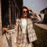 Een zachte beige geruite skort die stijl en comfort moeiteloos combineert. Draag hem met de bijpassende blazer voor een complete set of mix & match met andere herfstfavorieten.