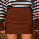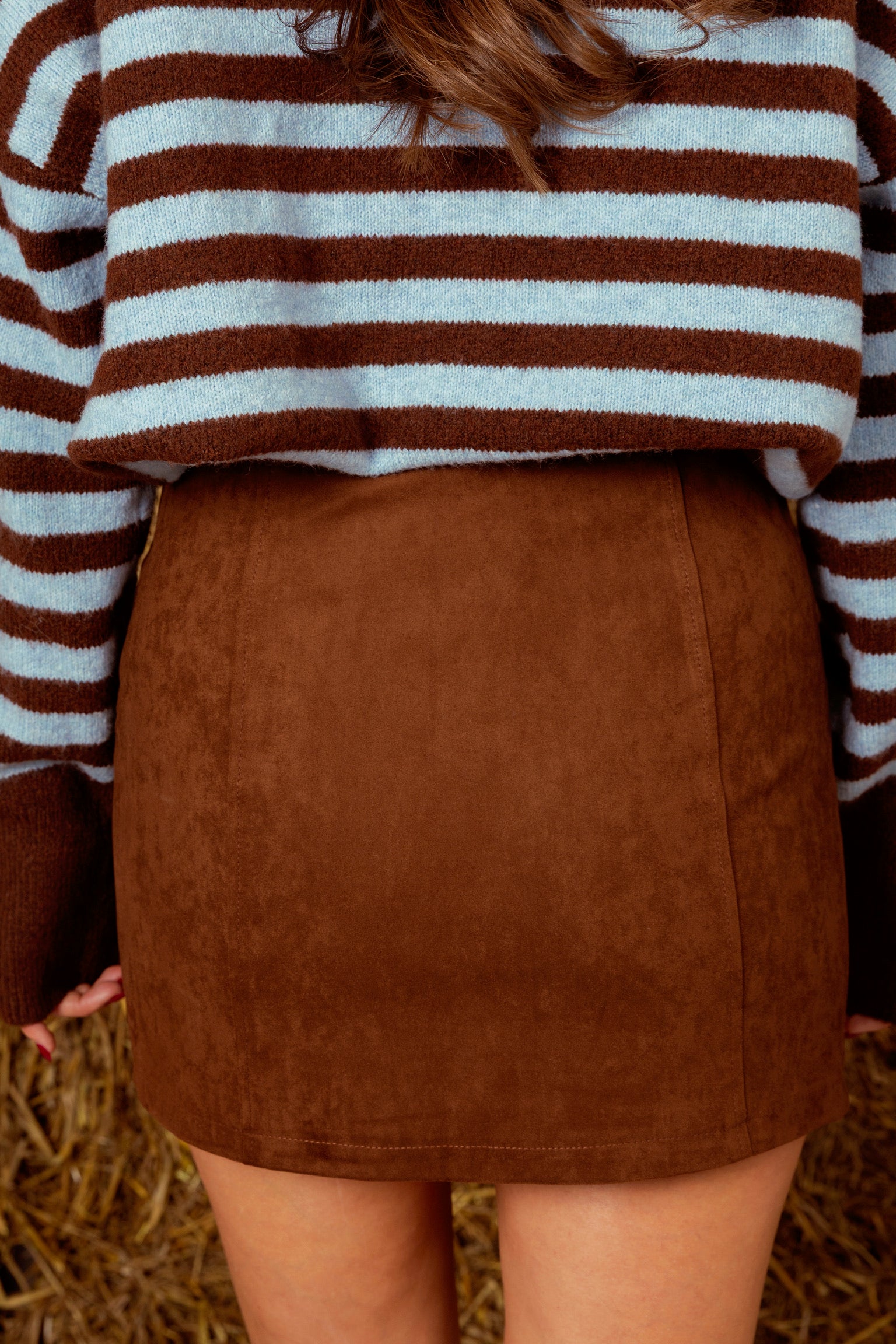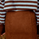 Een tijdloos silhouet in zachte suède die moeiteloos meebeweegt met het seizoen. De warme bruine tint maakt het een ideale match voor chunky truien en hoge laarzen tijdens frisse herfstdagen.