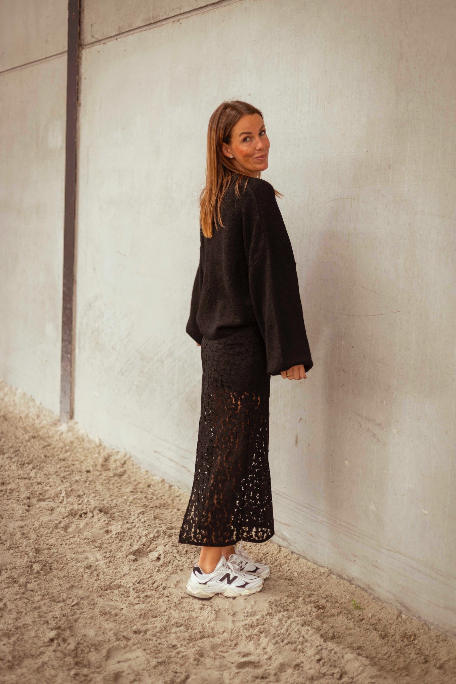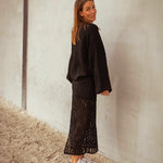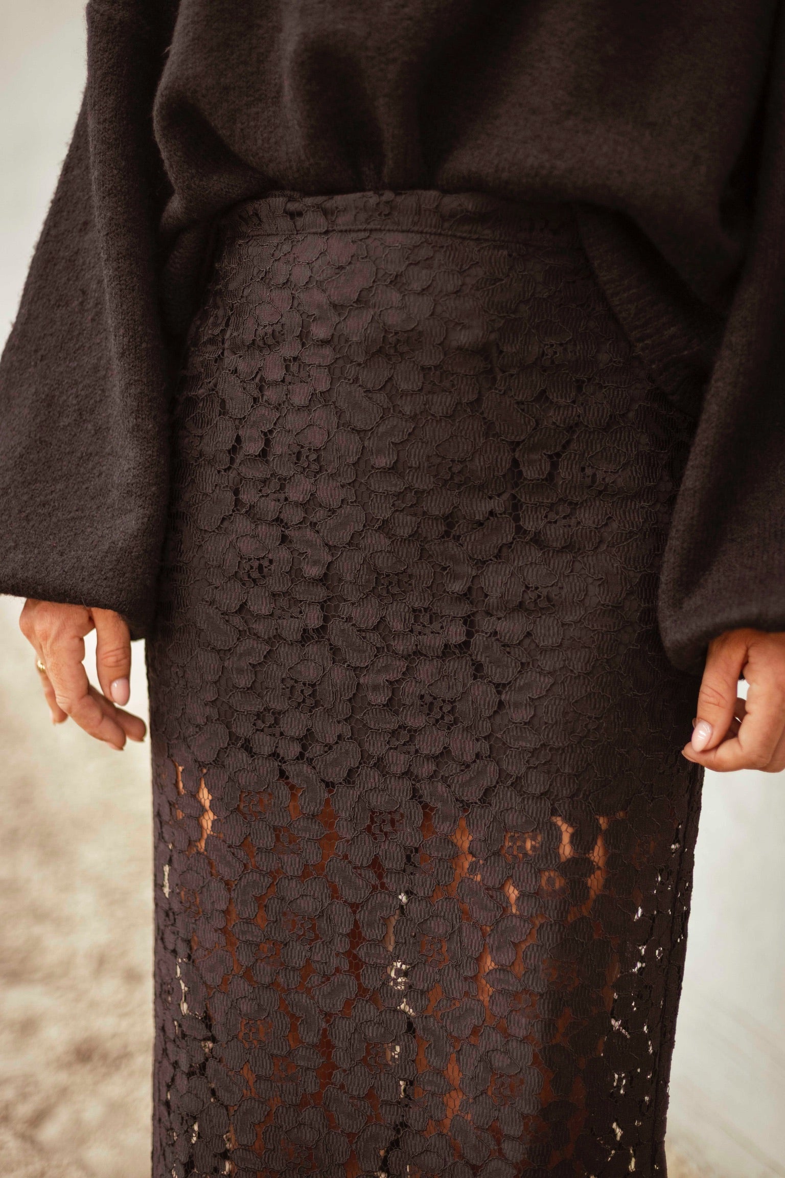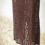 Deze zwarte kanten rok ademt elegantie met een herfstige rand, dankzij het fijne kant en de vloeiende snit die moeiteloos meebeweegt. Draag haar met een grove trui voor een spannend contrast, of kies voor een verfijnde top voor een meer geraffineerde look.