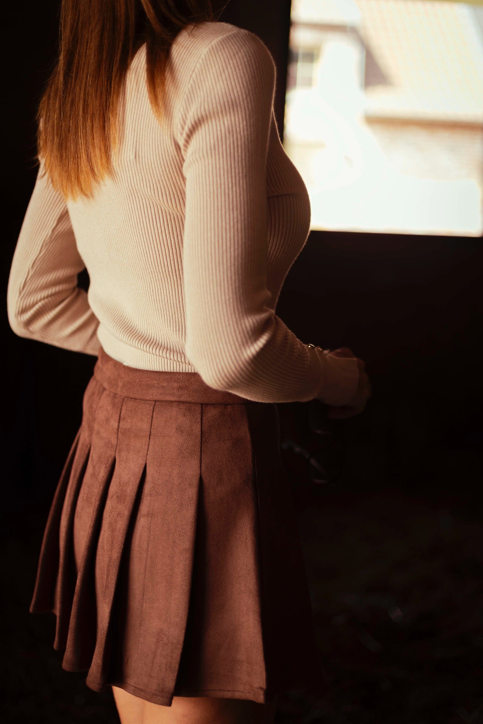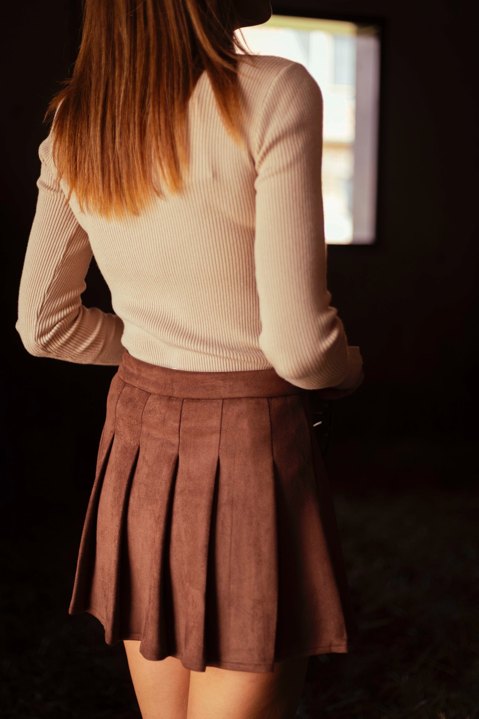 Een zachte suède plissérok in warme bruintinten die beweging en herfstvibes samenbrengt. Het luxe materiaal en het speelse model maken het een veelzijdig stuk voor zowel casual als chique outfits.