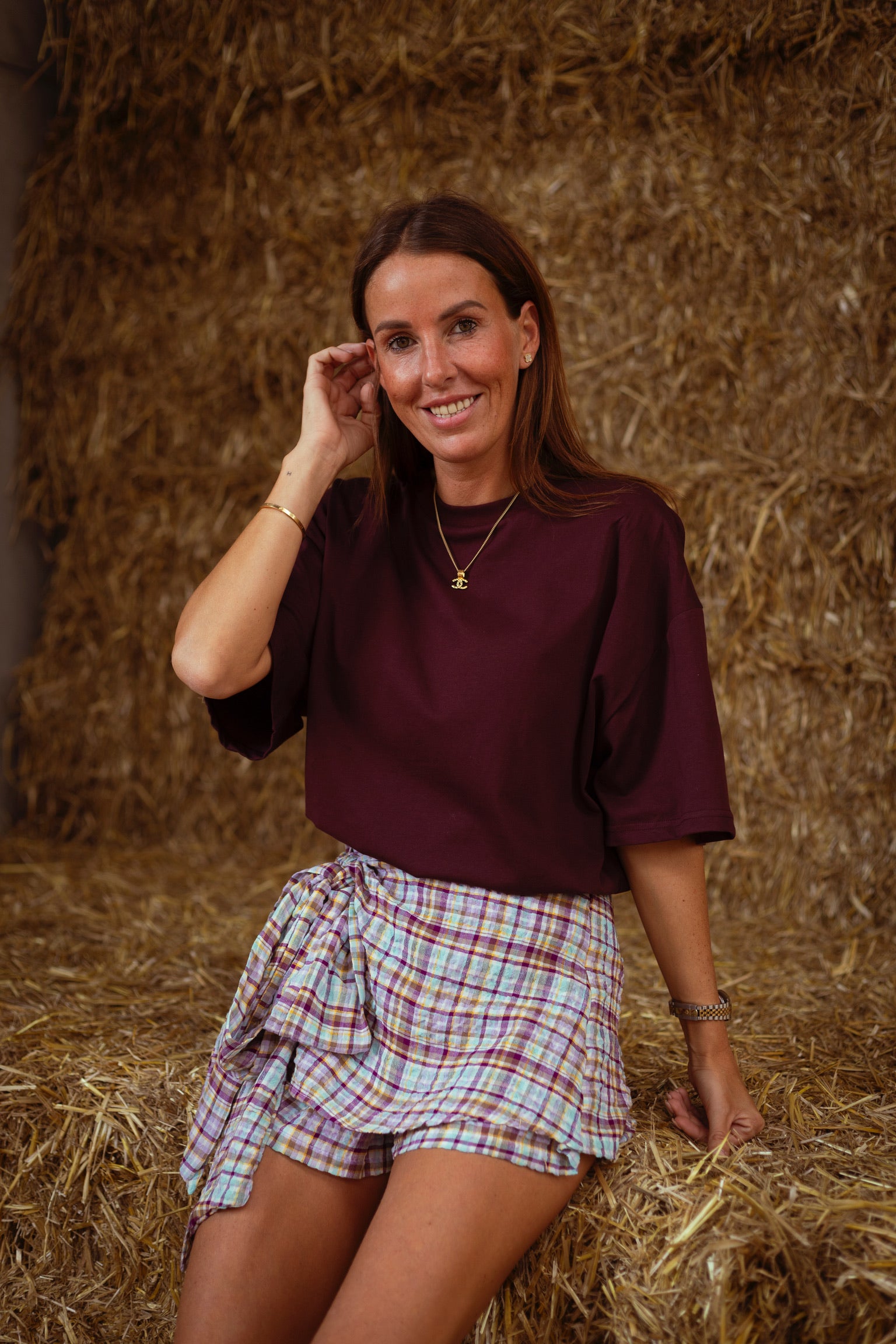 Een elegant skort in rijke herfsttinten als bordeaux en blauw, met een overslag die zorgt voor een flatterend silhouet. Combineert moeiteloos met een cozy knit of een fitted blouse. Ideaal voor wie houdt van comfort zonder in te boeten op stijl.