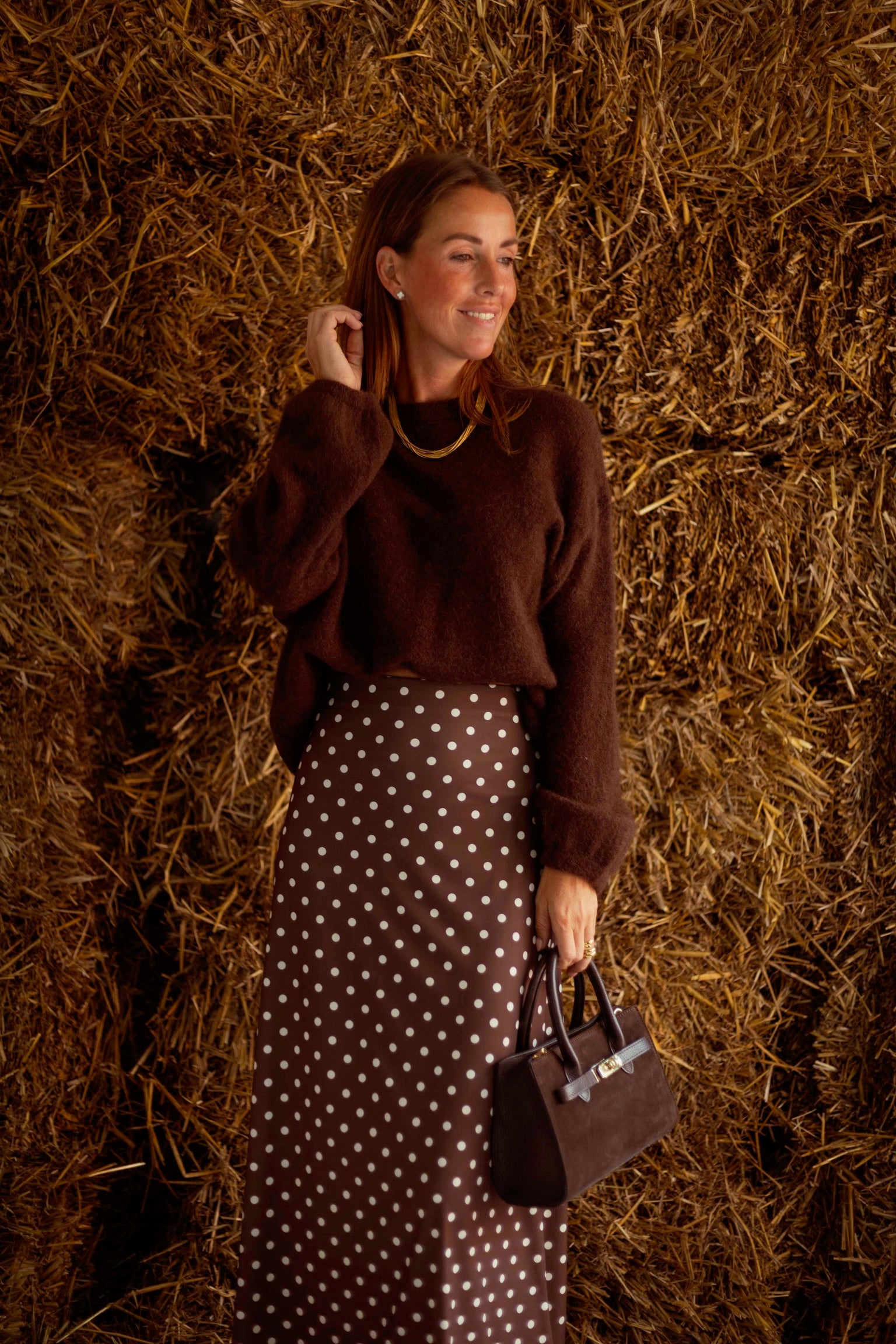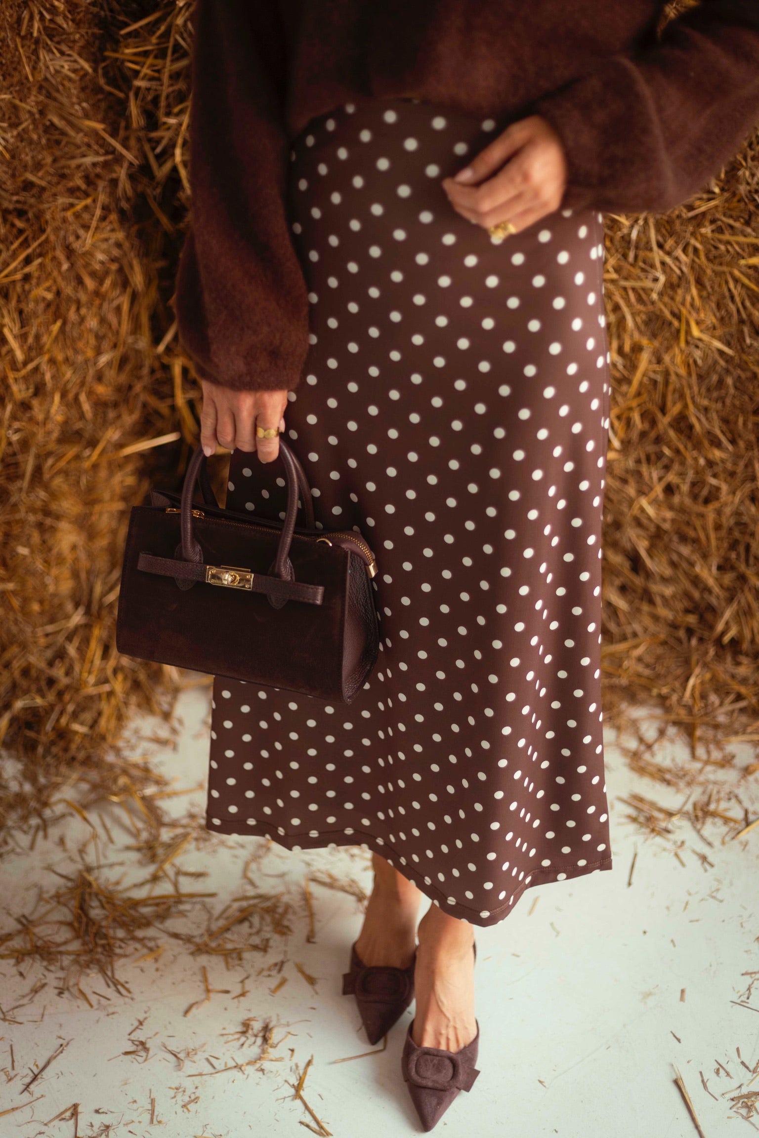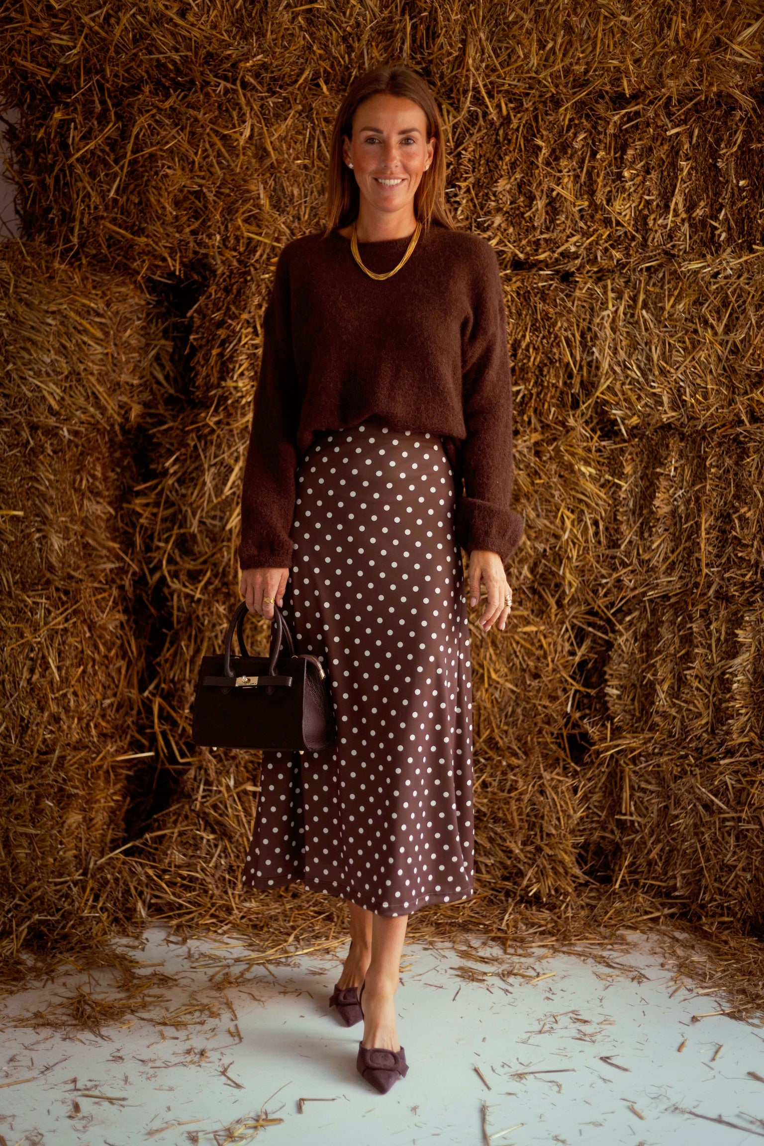 Een lange rok in warmbruin met speelse witte stippen, die soepel meebeweegt met elke stap. De luchtige stof en klassieke print maken het een veelzijdig stuk voor frisse herfstdagen. Draag met een grove trui en laarzen voor een moeiteloos stijlvolle combinatie.