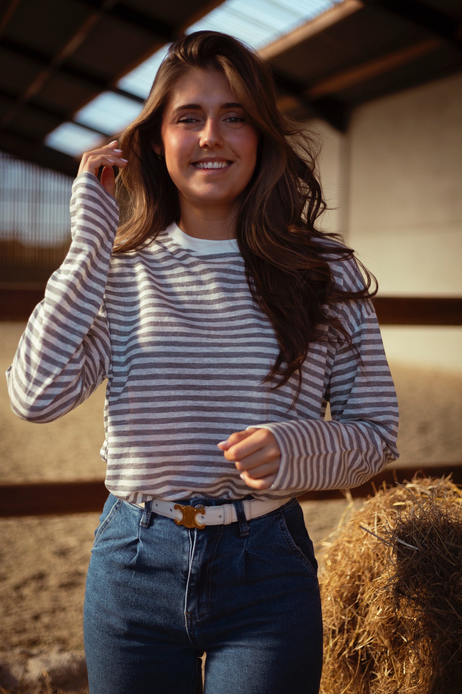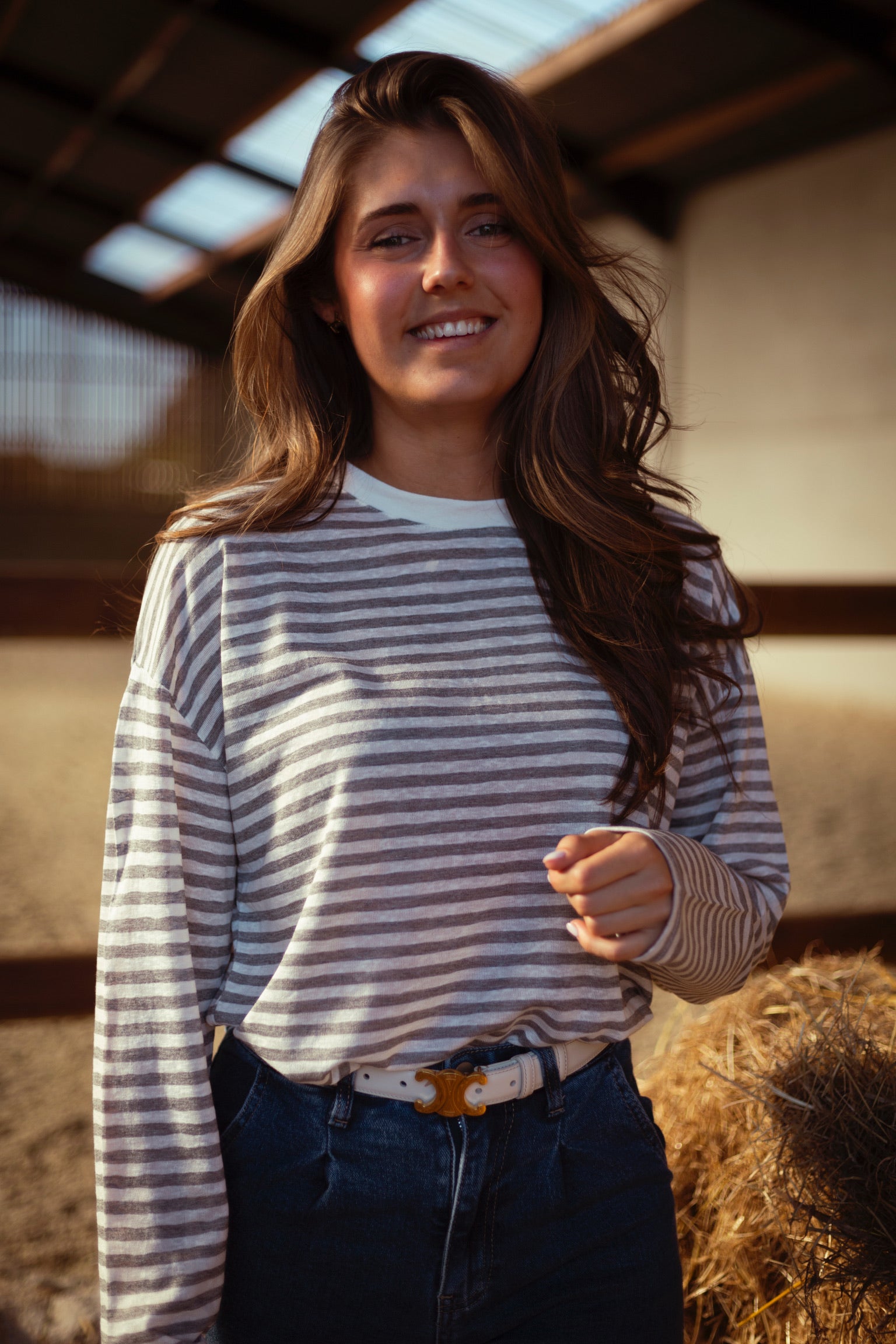 Een zachte longsleeve met strepen en een casual, iets lossere fit die makkelijk combineert. Perfect voor frisse dagen, onder een jasje of gewoon zo met je favoriete jeans en sneakers.