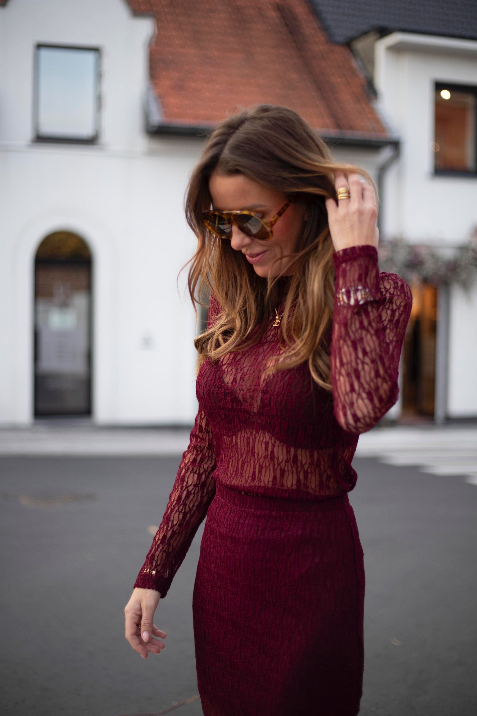 Fijn kant en diepe bordeauxrood tonen geven een elegante, warme uitstraling. Solo of gecombineerd met de bijpassende rok ontstaat een verfijnde, herfst-winterlook. Perfect te stylen met laarzen of subtiele accessoires voor een chique outfit.
