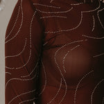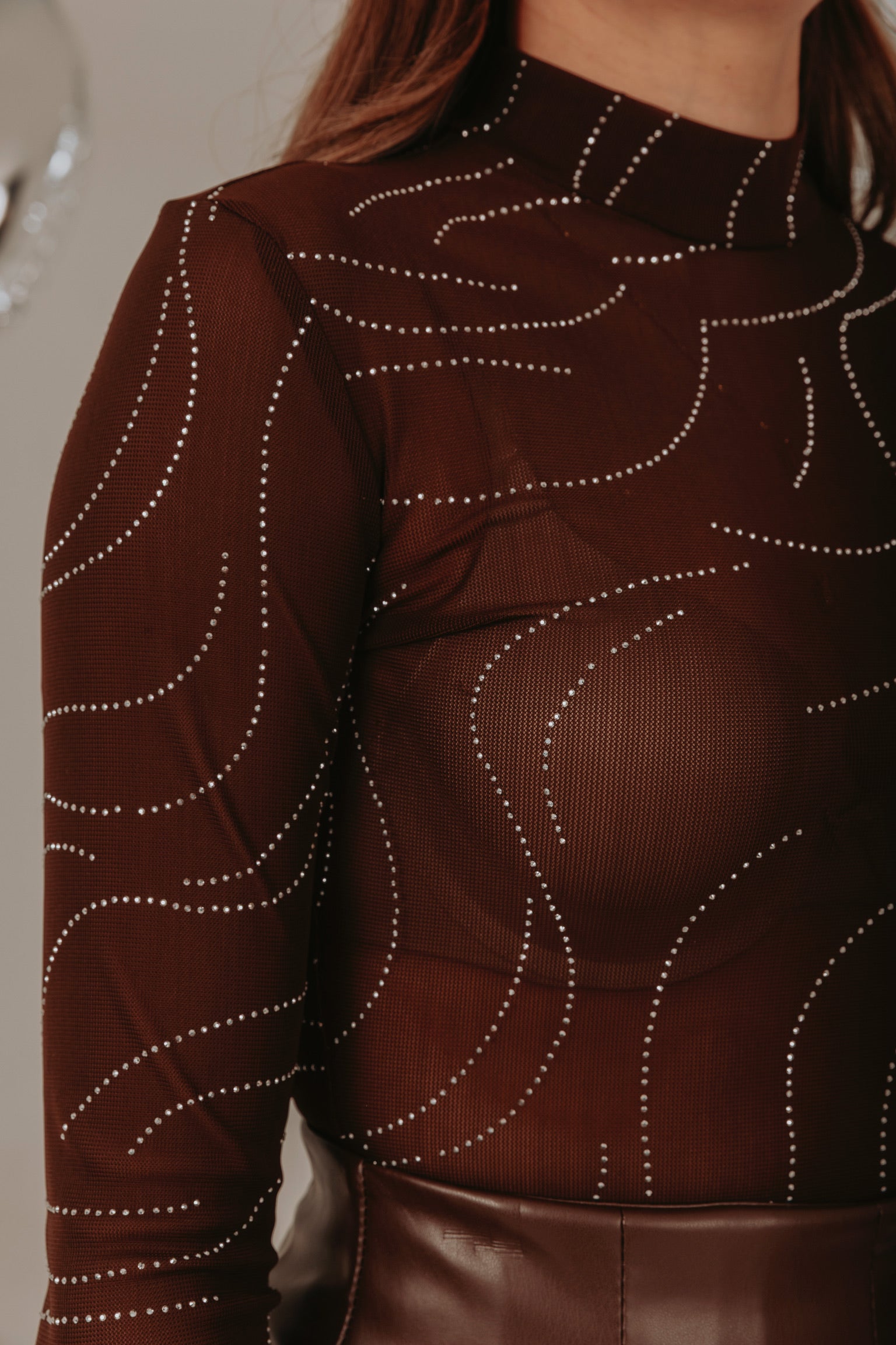 Dit bruine body met diamantdetails straalt luxe en glamour uit en accentueert elegant je silhouet. De fonkelende accenten vangen het licht bij elke beweging voor een echte party-ready look. Perfect om de spotlight te pakken en elke avond te ownen.