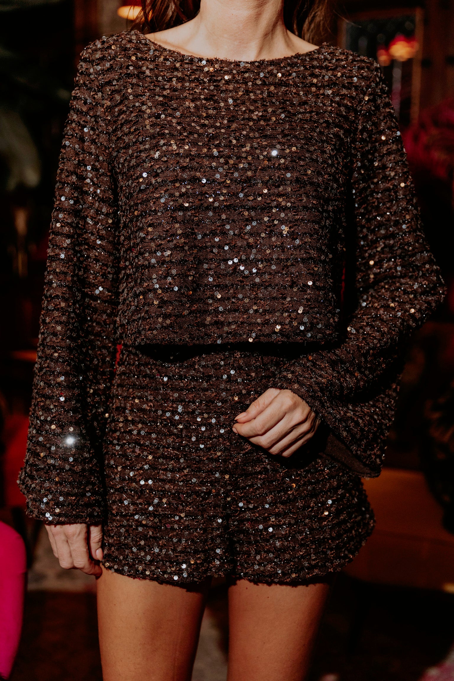 Deze bruine pailletten short straalt speelse feestelijkheid uit en is veelzijdig genoeg om los te dragen of te combineren met de bijpassende blouse voor een complete glinsterende look.