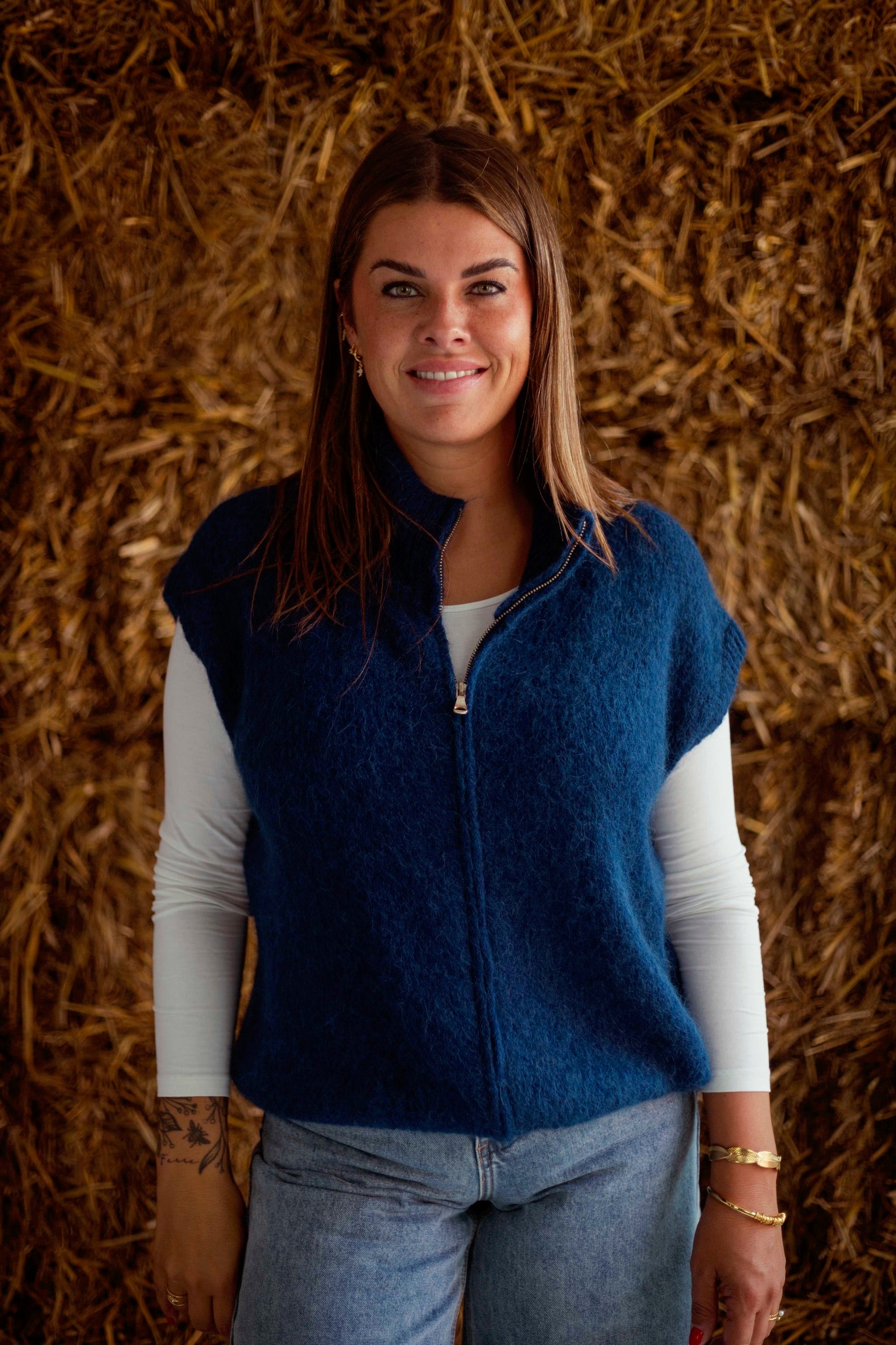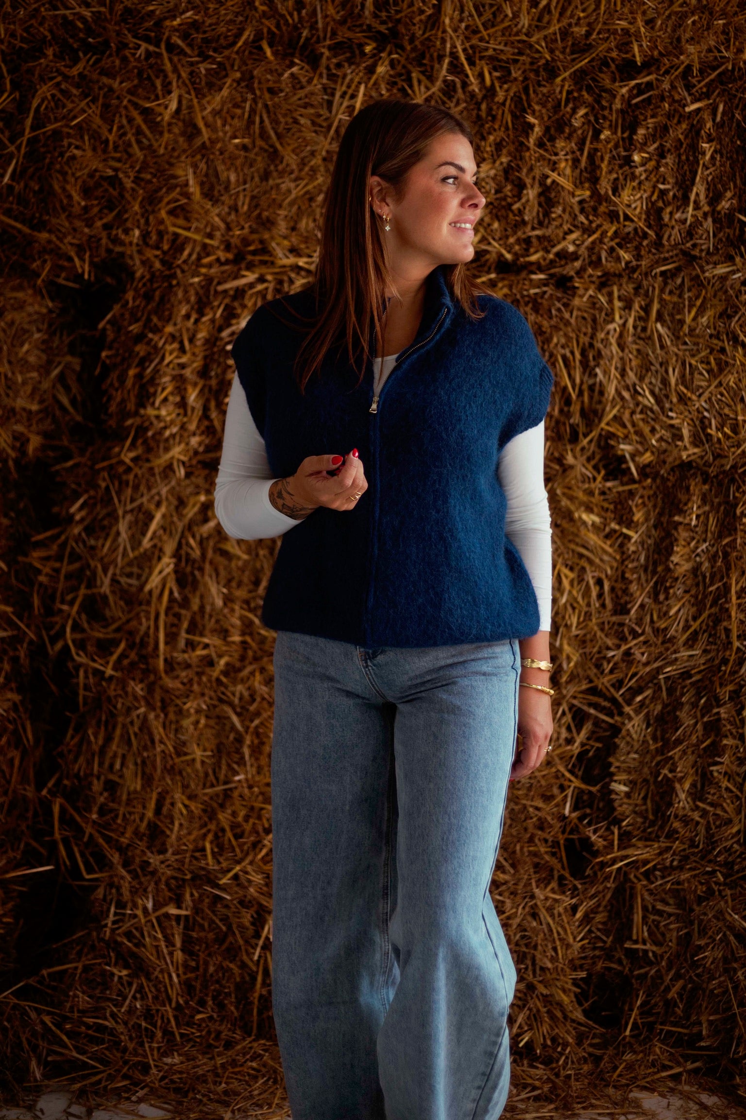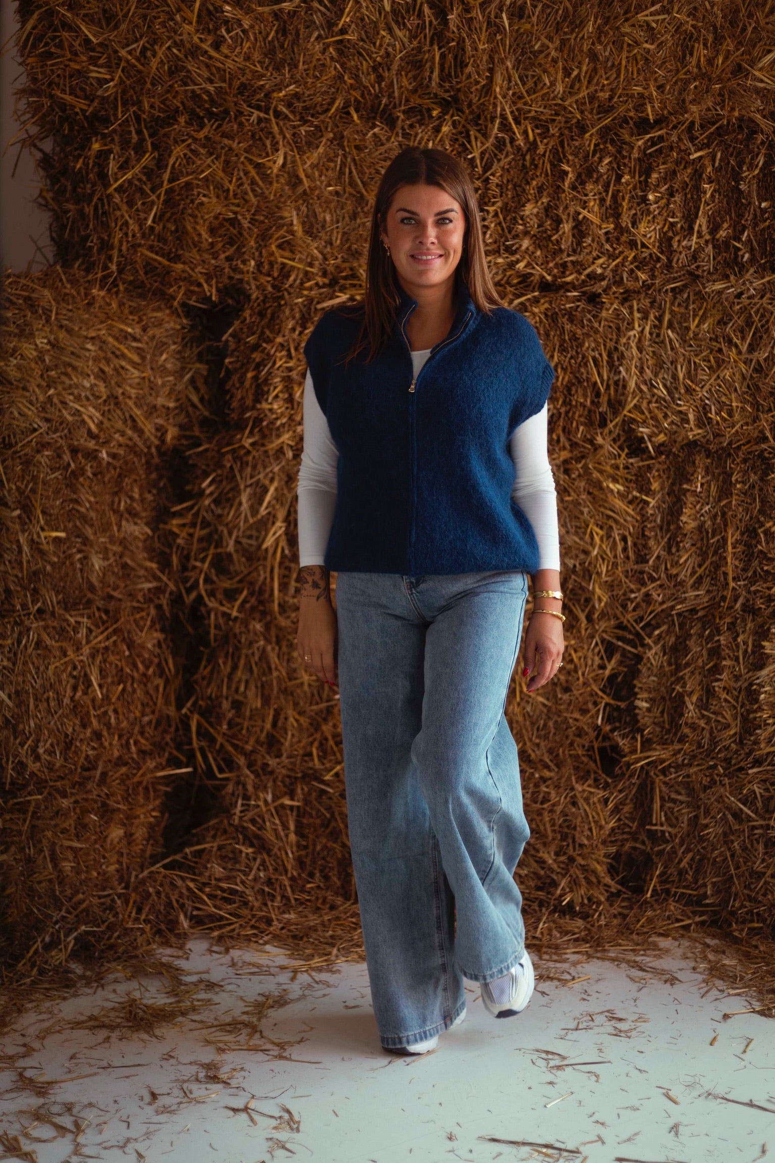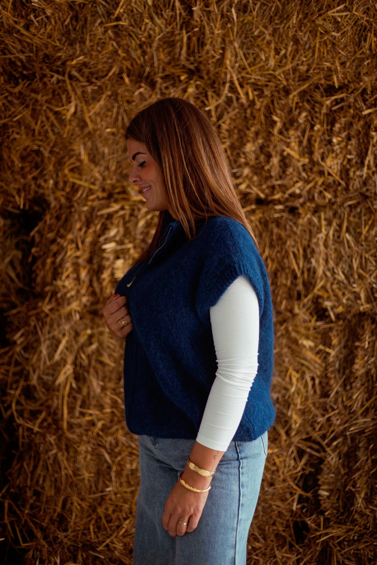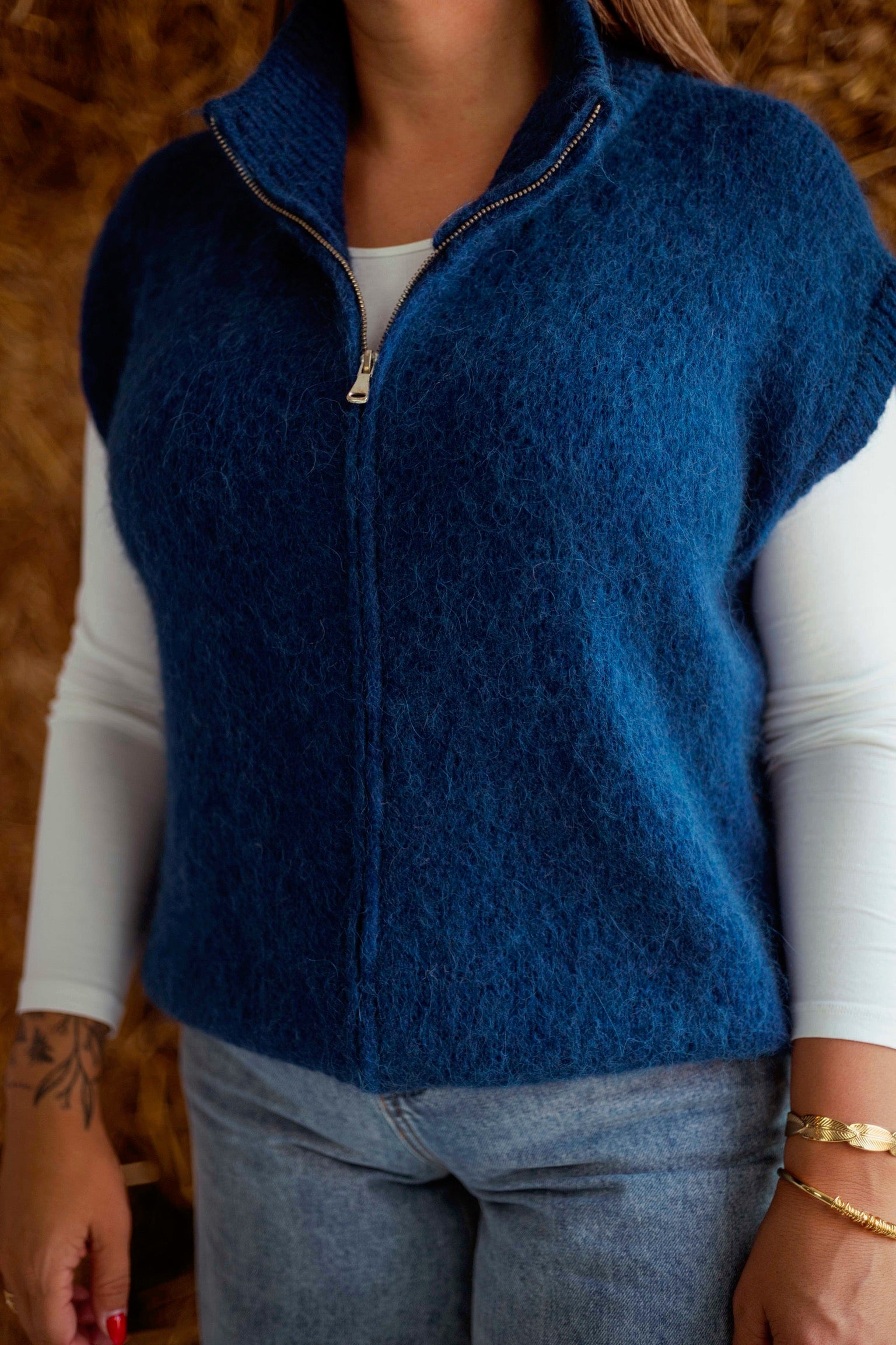 Een grove knit met rits in een koele blauwtint, ideaal voor wisselvallig herfstweer. De rechte snit en hoge kraag zorgen voor een praktische maar stijlvolle laag over elke outfit. Werkt goed met jeans of een losvallende pantalon.