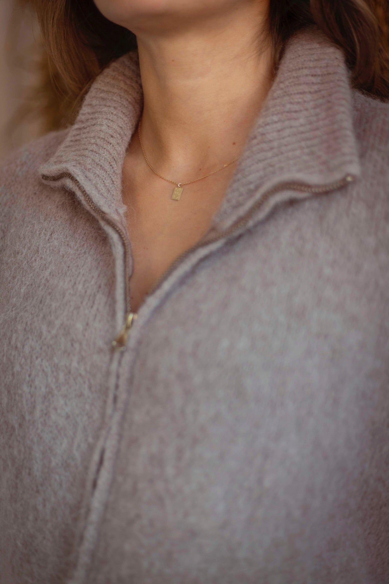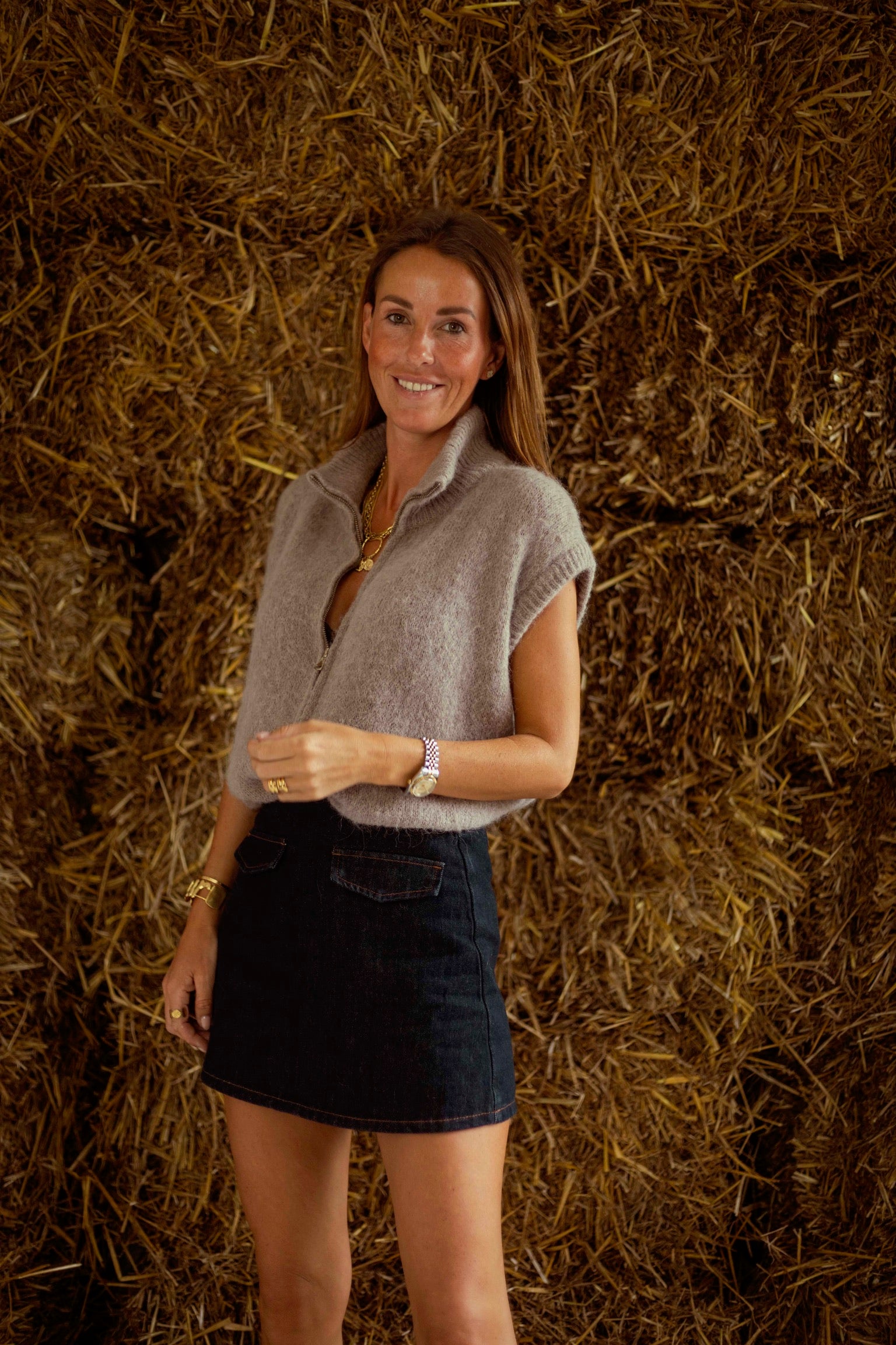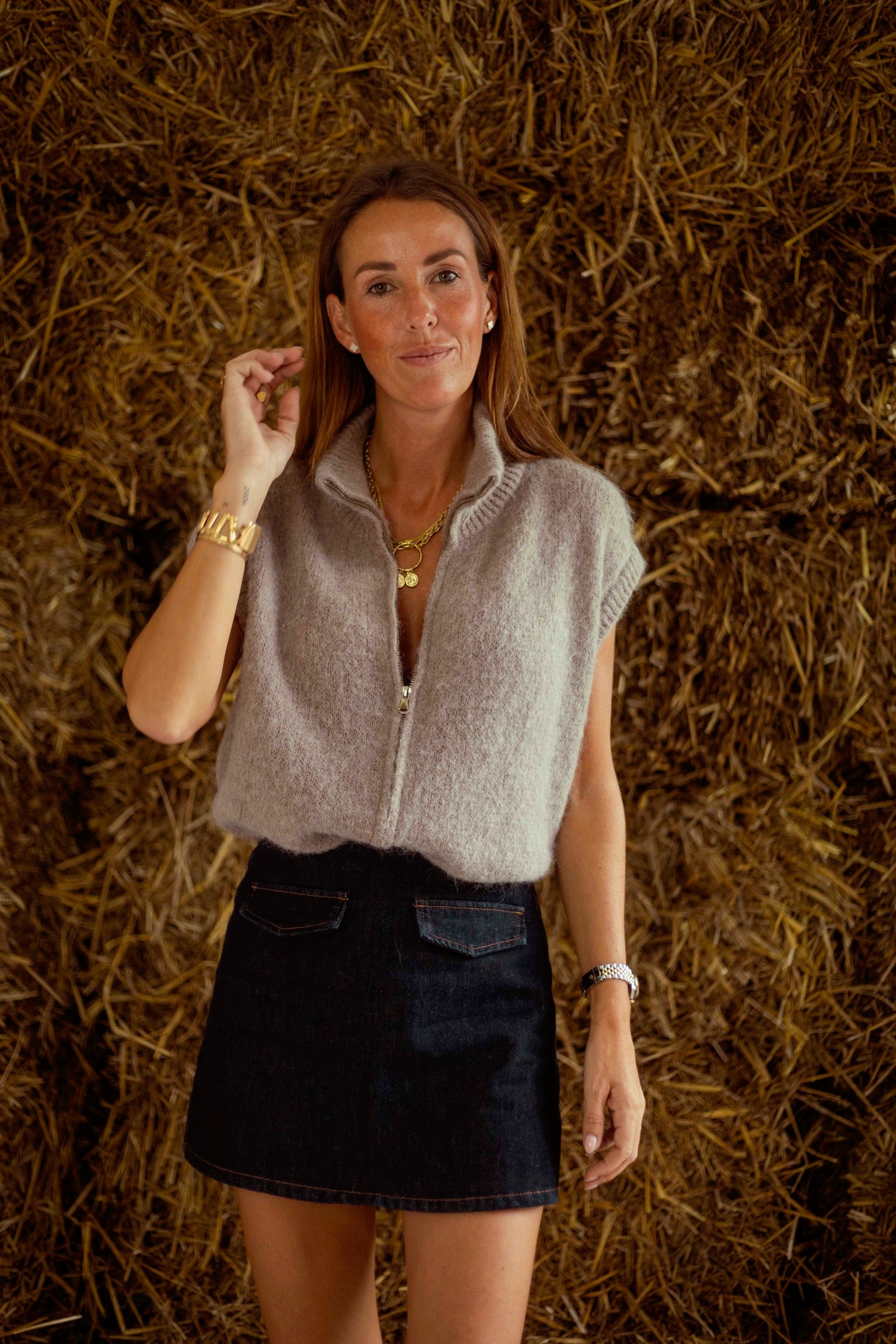 Een grove knit met rits in een warme taupetint, ideaal voor wisselvallig herfstweer. De rechte snit en hoge kraag zorgen voor een praktische maar stijlvolle laag over elke outfit. Werkt goed met jeans of een losvallende pantalon.