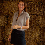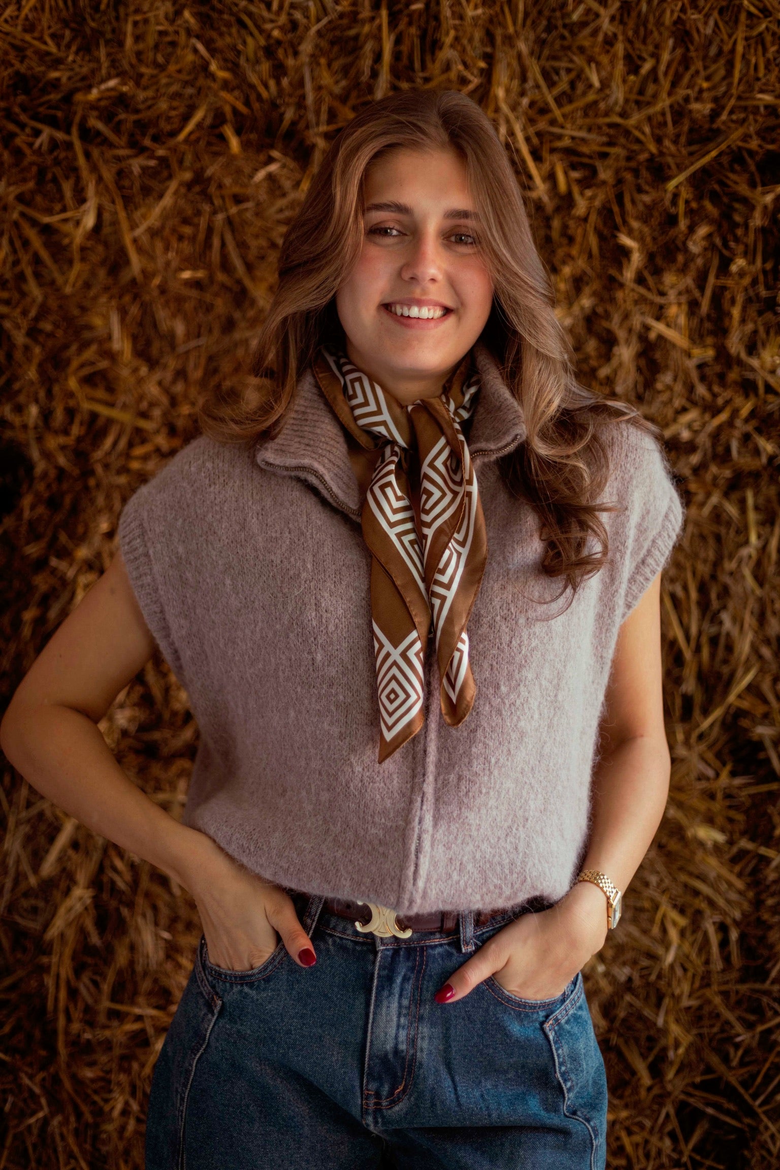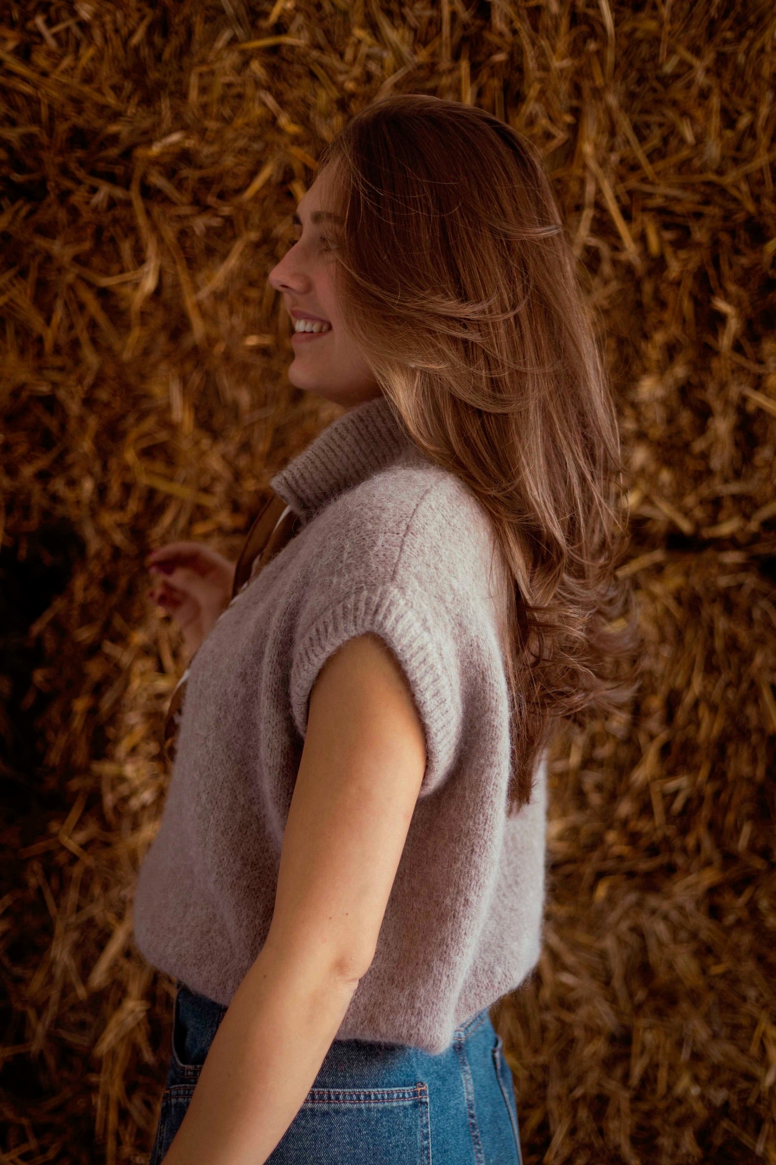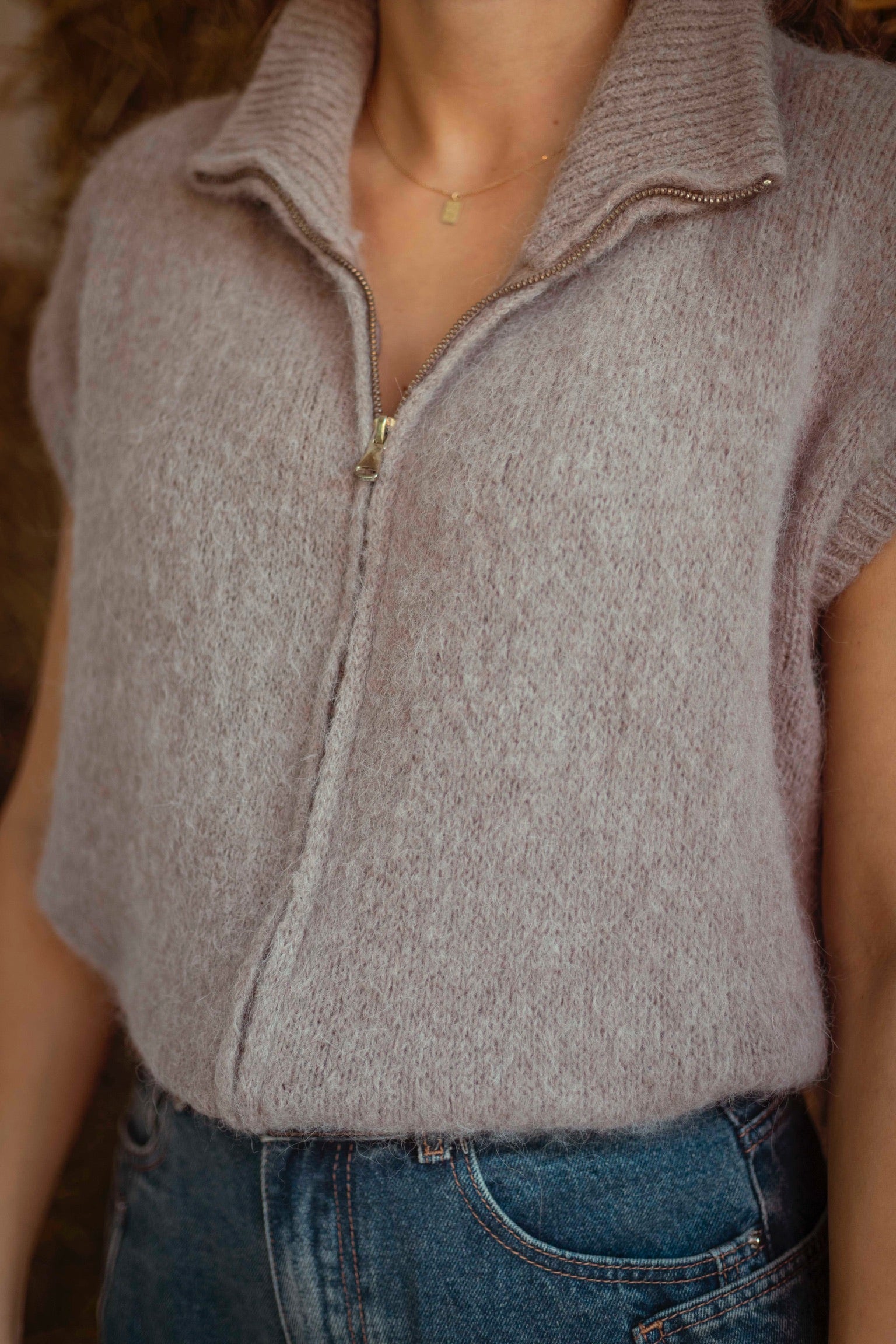 Een grove knit met rits in een warme taupetint, ideaal voor wisselvallig herfstweer. De rechte snit en hoge kraag zorgen voor een praktische maar stijlvolle laag over elke outfit. Werkt goed met jeans of een losvallende pantalon.