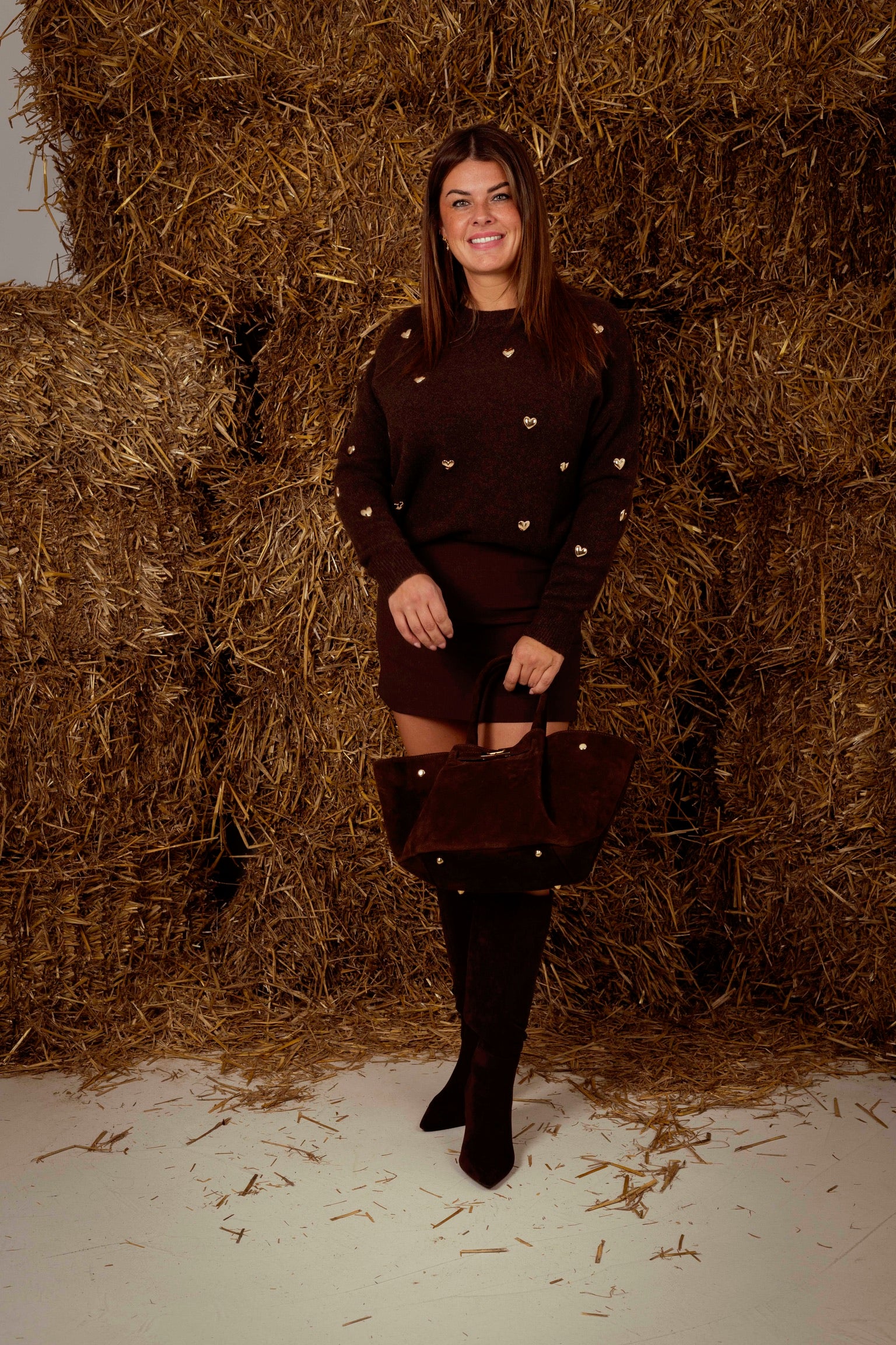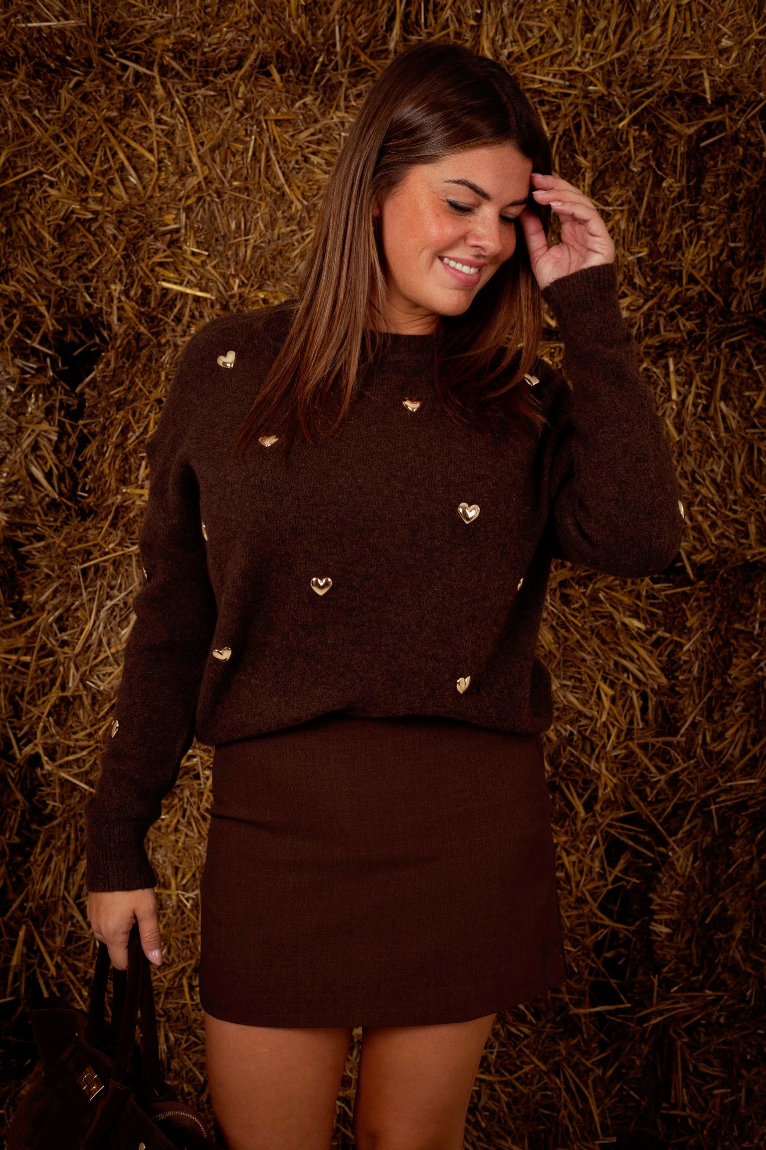 Een speels en warm gebreid stuk met zilveren hartjesstuds die subtiel oplichten in het herfstlicht. Verkrijgbaar in verschillende kleuren, perfect om elke herfstdag een vleugje zachtheid en karakter mee te geven.