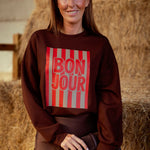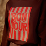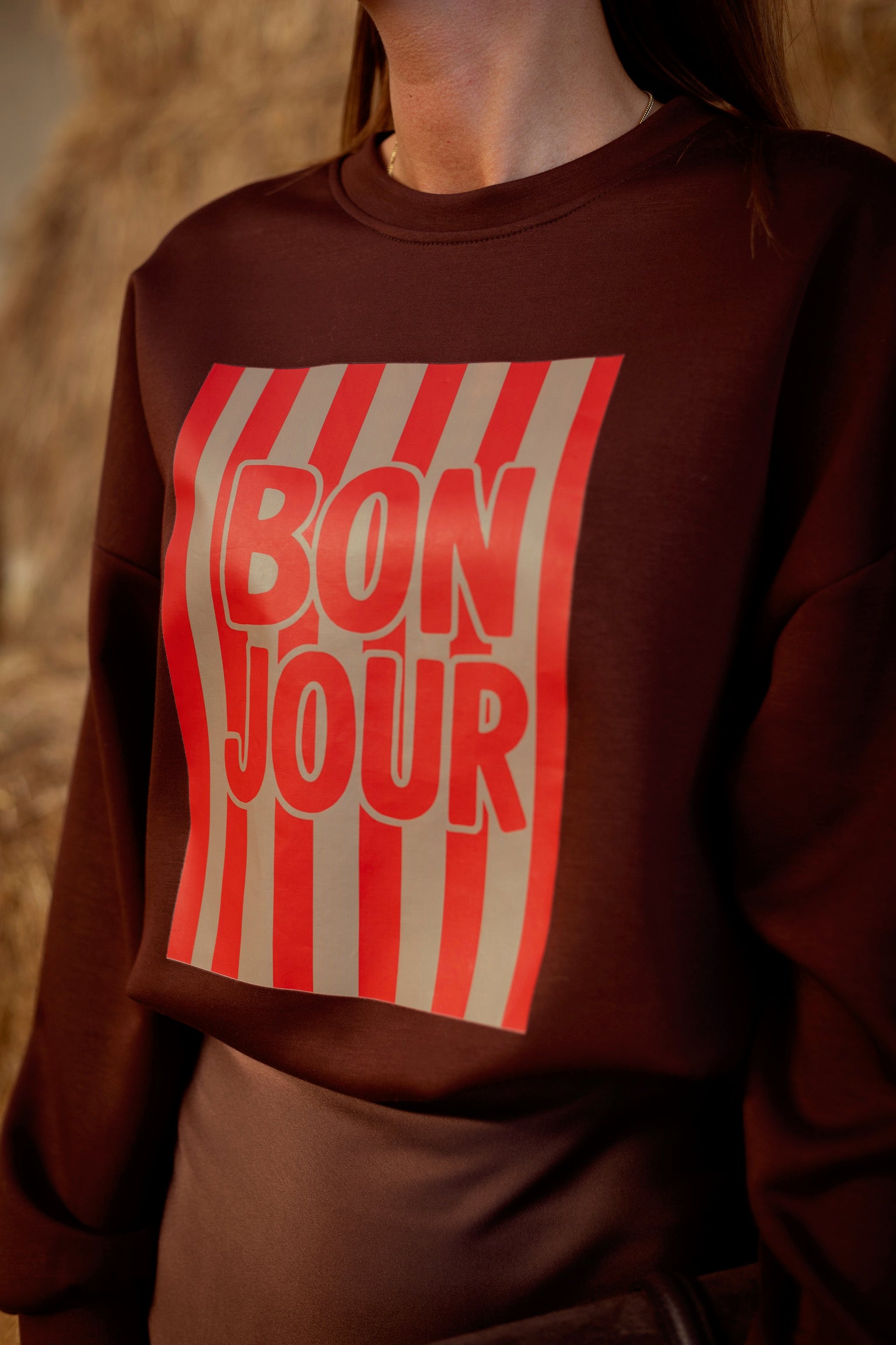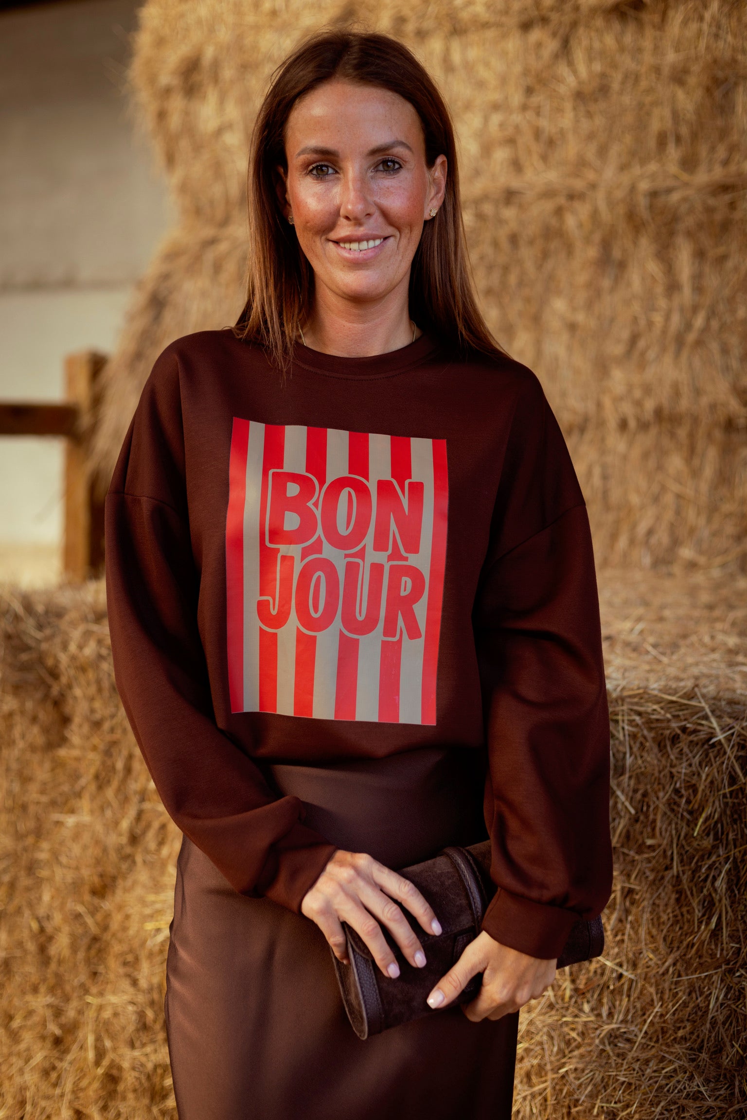 Een zachte, warme trui in herfstige bruintinten met een speelse touch dankzij de opvallende ‘Bonjour’-print. Perfect om een casual outfit wat extra vrolijkheid en karakter te geven tijdens de koelere dagen.