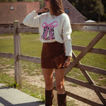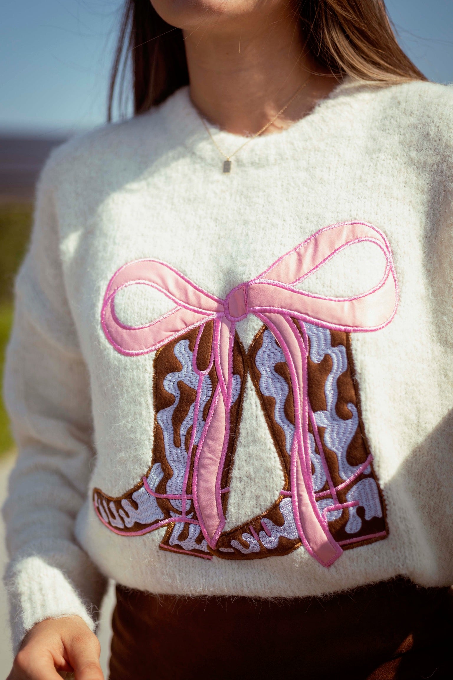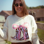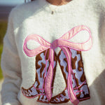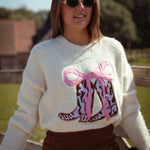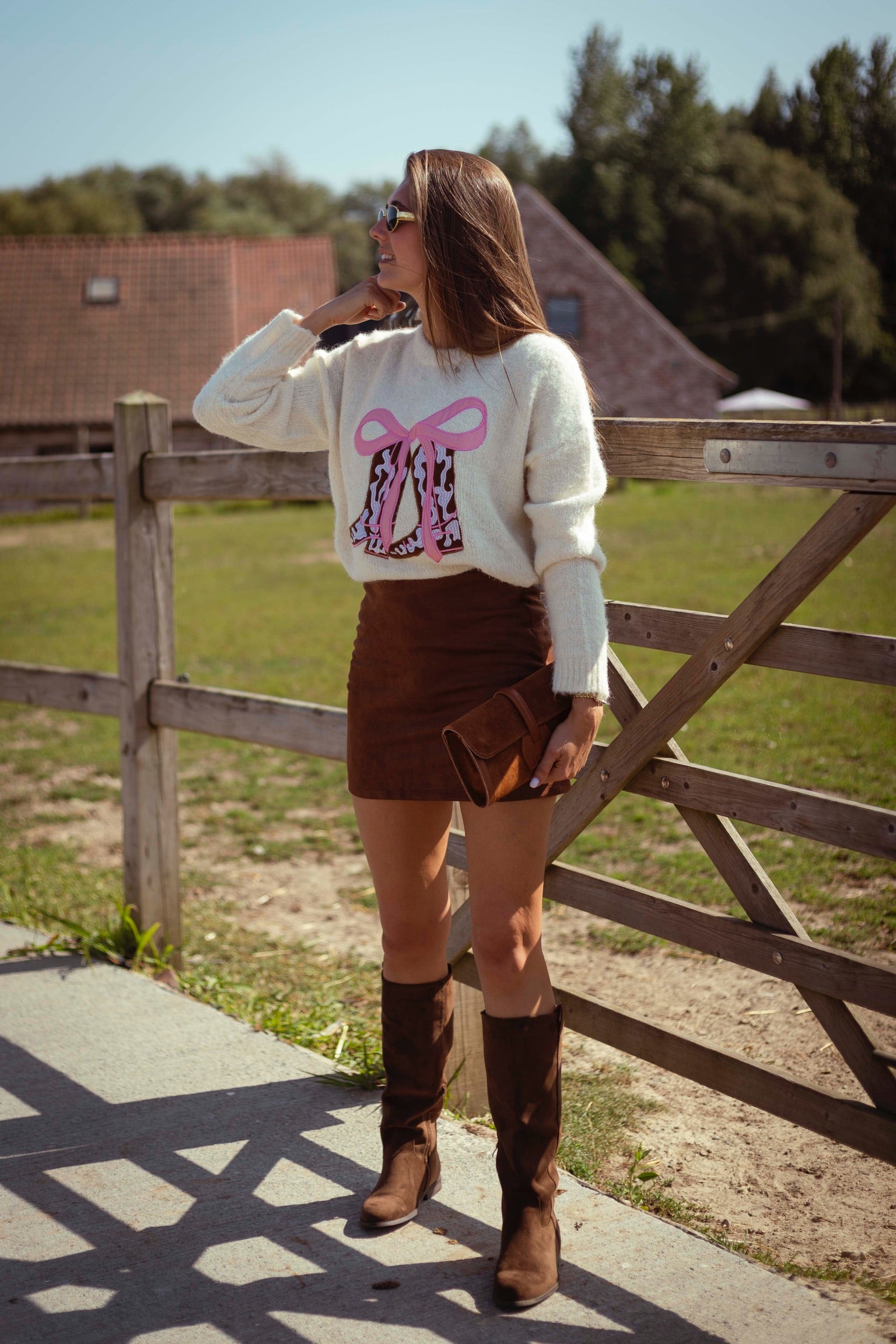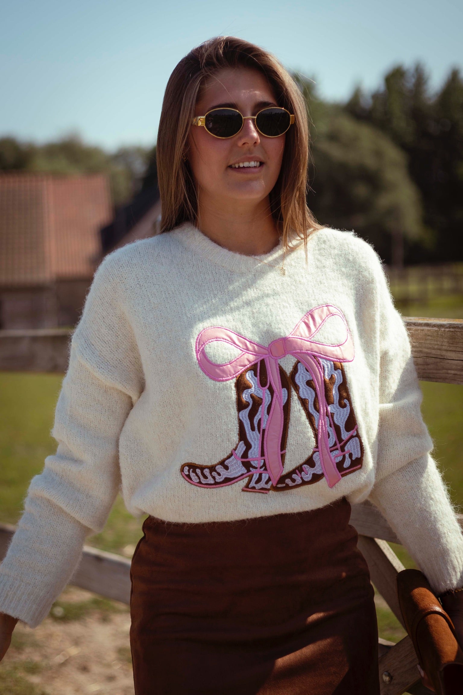 Een speelse pullover in ecru met een opvallende print van cowboylaarzen en een grote roze strik die het geheel een vrolijke, girlie twist geeft. De zachte stof en losse pasvorm maken het ideaal voor frisse herfstdagen met een knipoog naar het Wilde Westen. Combineer met een jeans of rokje voor een look vol karakter en comfort.