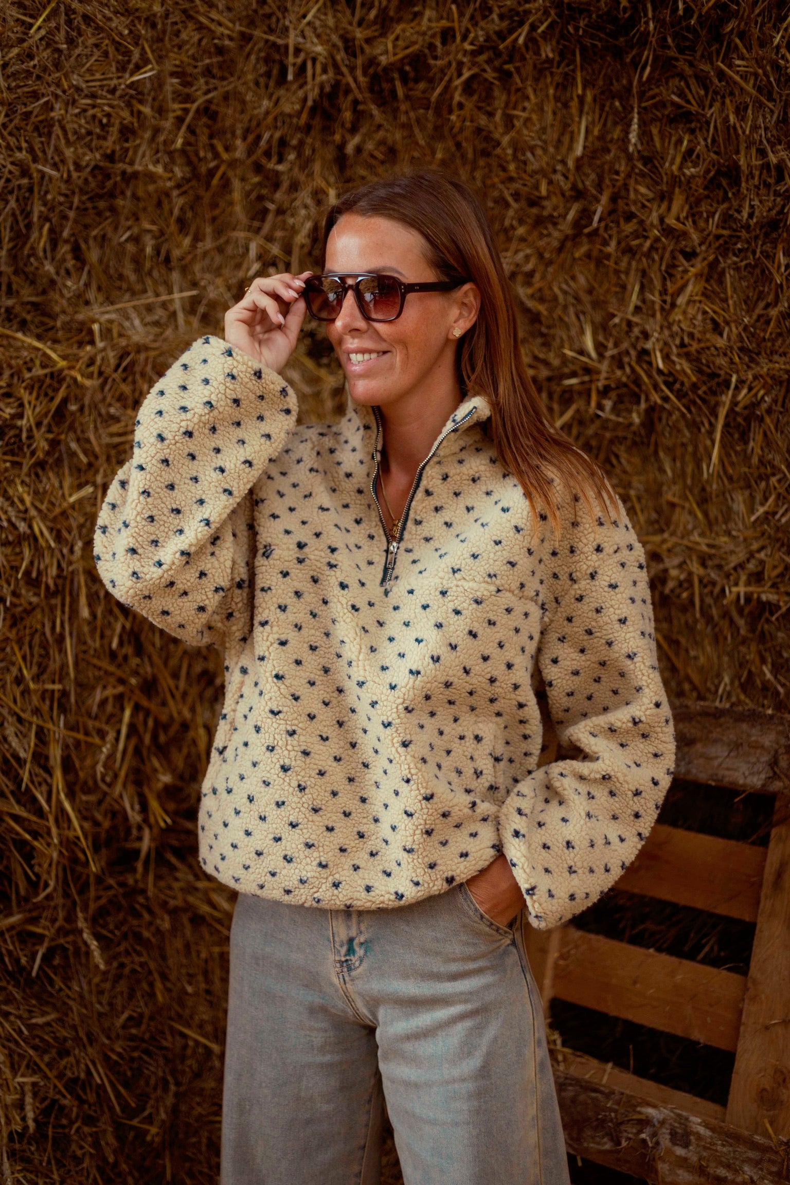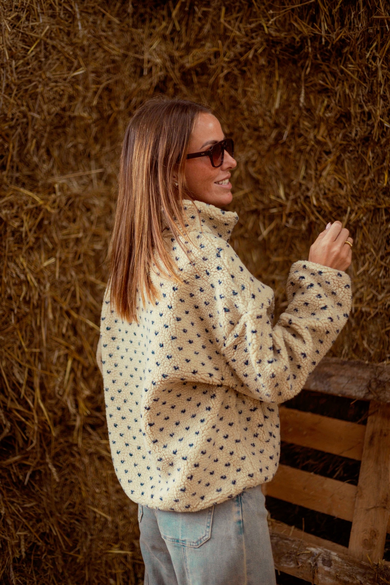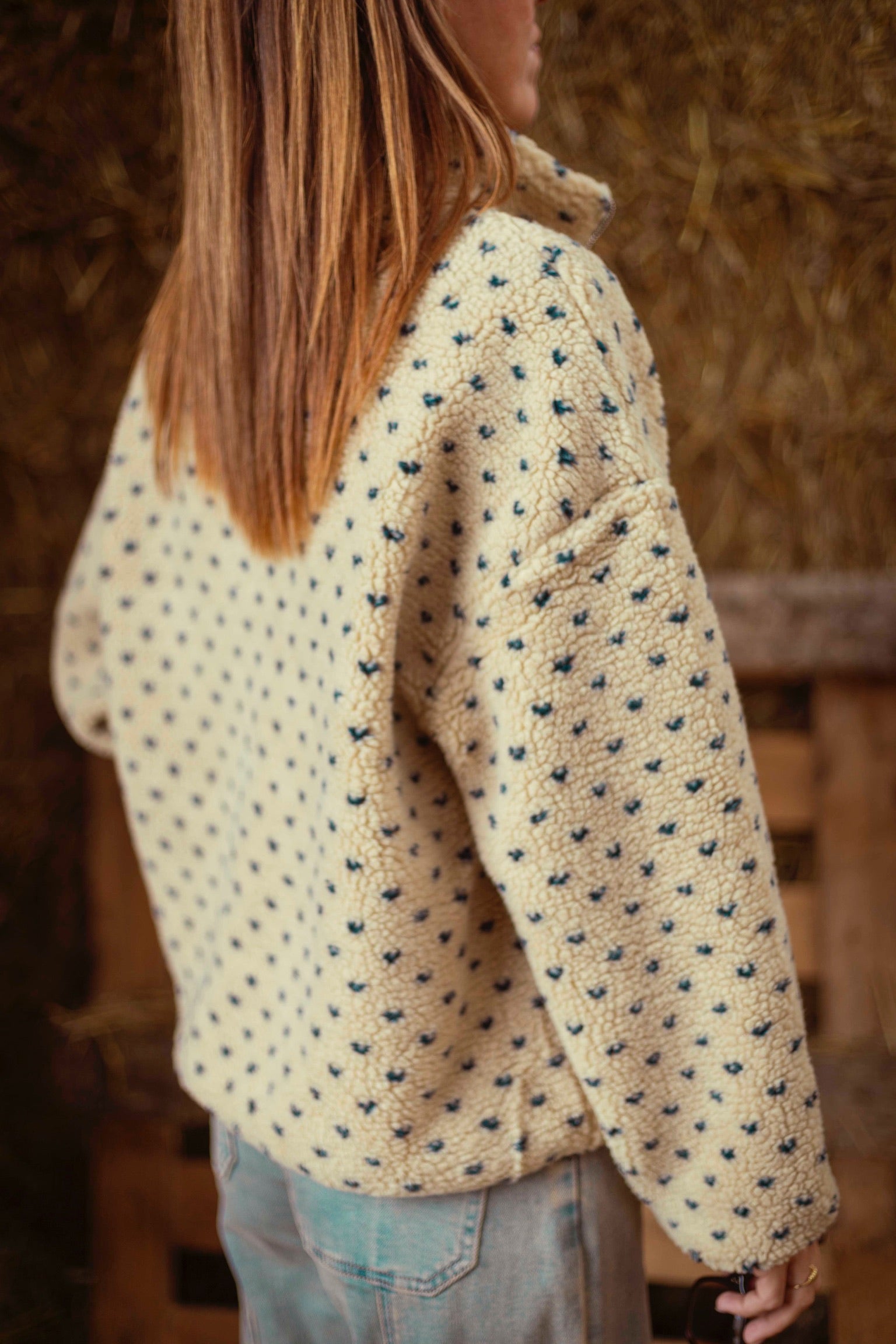 Deze zachte teddy trui met subtiele polkadots geeft je outfit meteen een gezellige, speelse twist. Perfect voor knusse herfstdagen waarop comfort en stijl samenkomen.