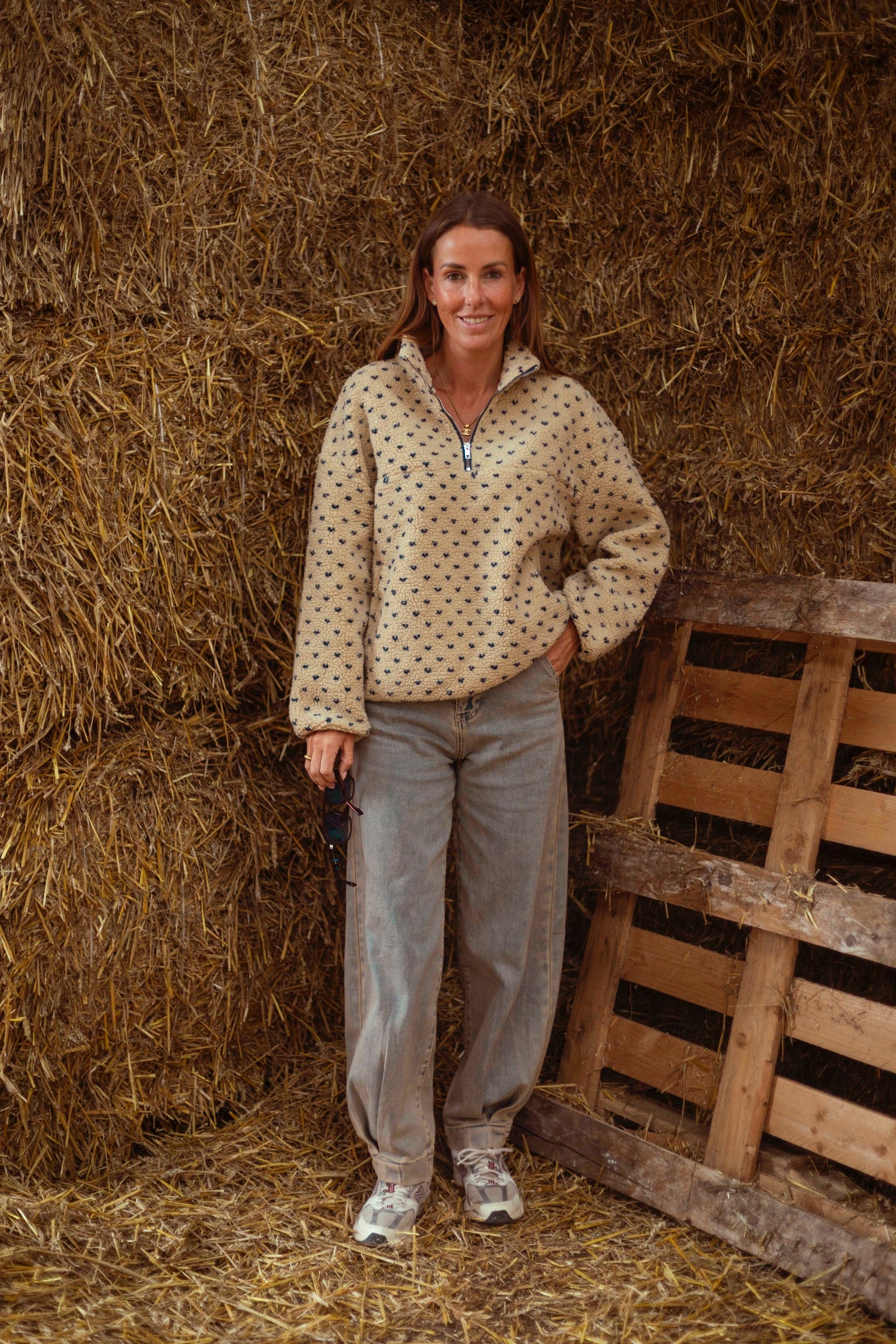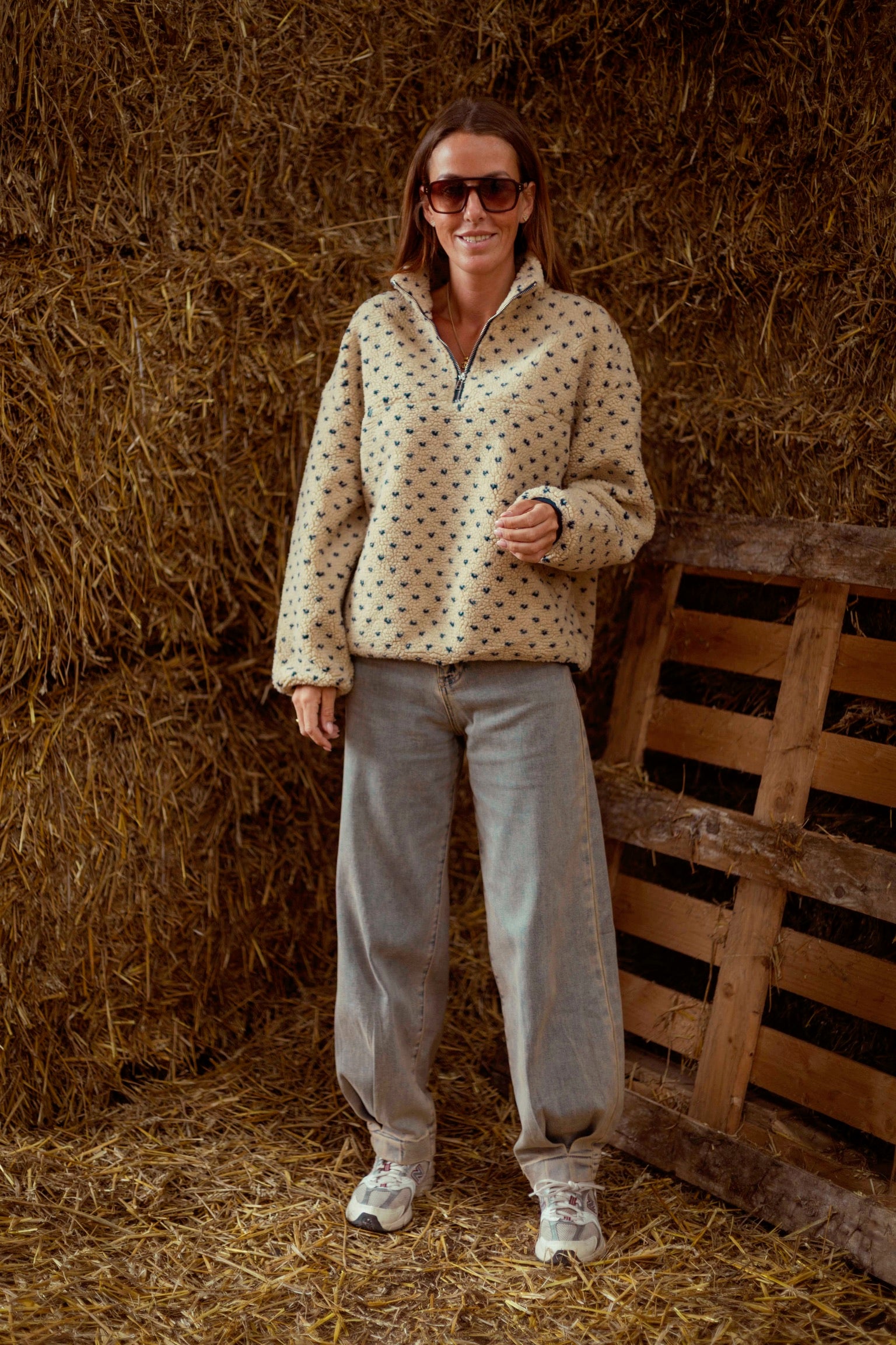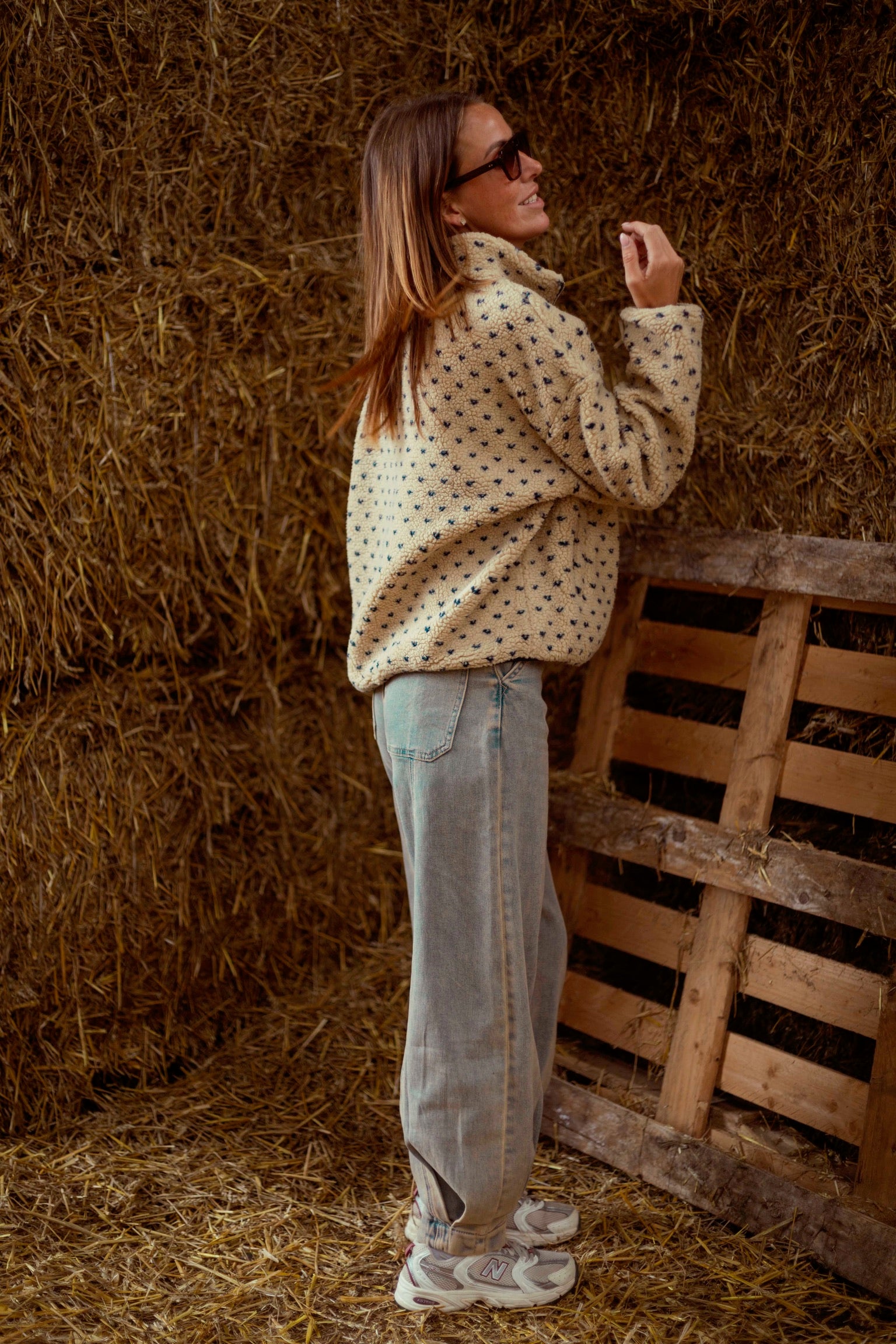 Deze zachte teddy trui met subtiele polkadots geeft je outfit meteen een gezellige, speelse twist. Perfect voor knusse herfstdagen waarop comfort en stijl samenkomen.