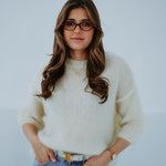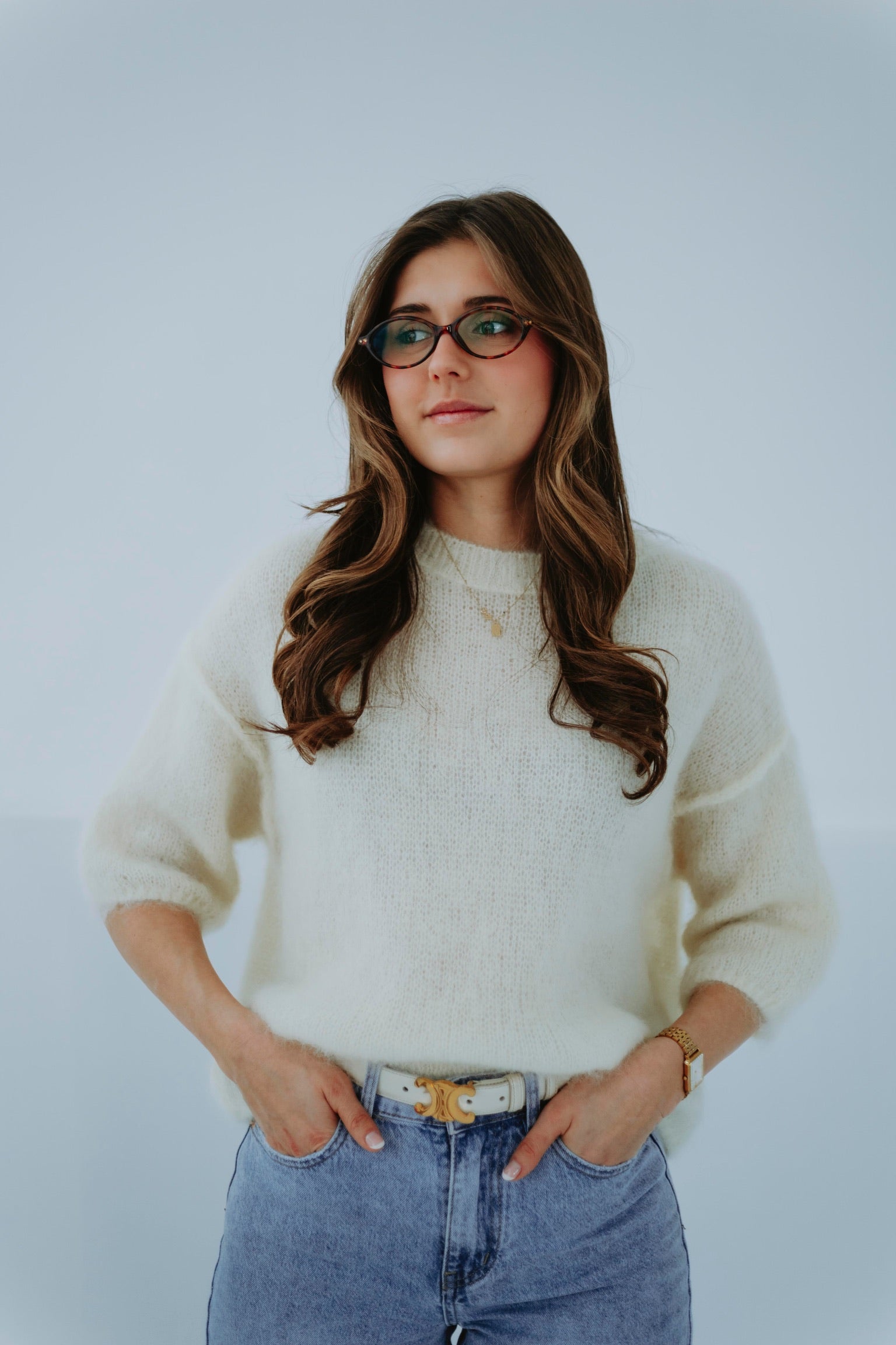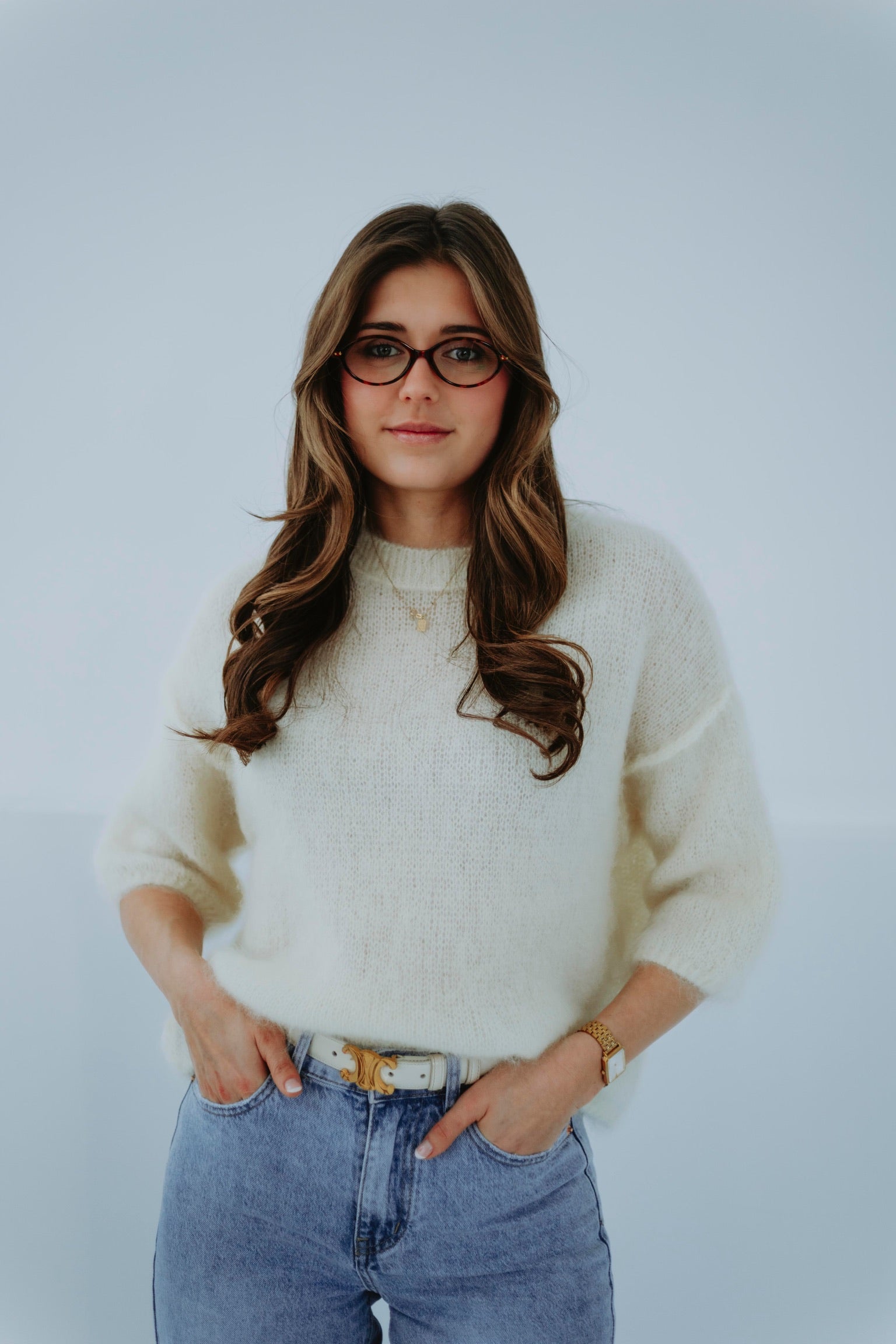 Zachte mohair in speelse pasteltinten maakt deze trui perfect voor de lente. Met driekwart mouwen voelt hij luchtig en stijlvol tegelijk, ideaal om over een simpele top te dragen. Romantisch, cozy en toch fris – een echte lentefavoriet.