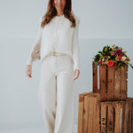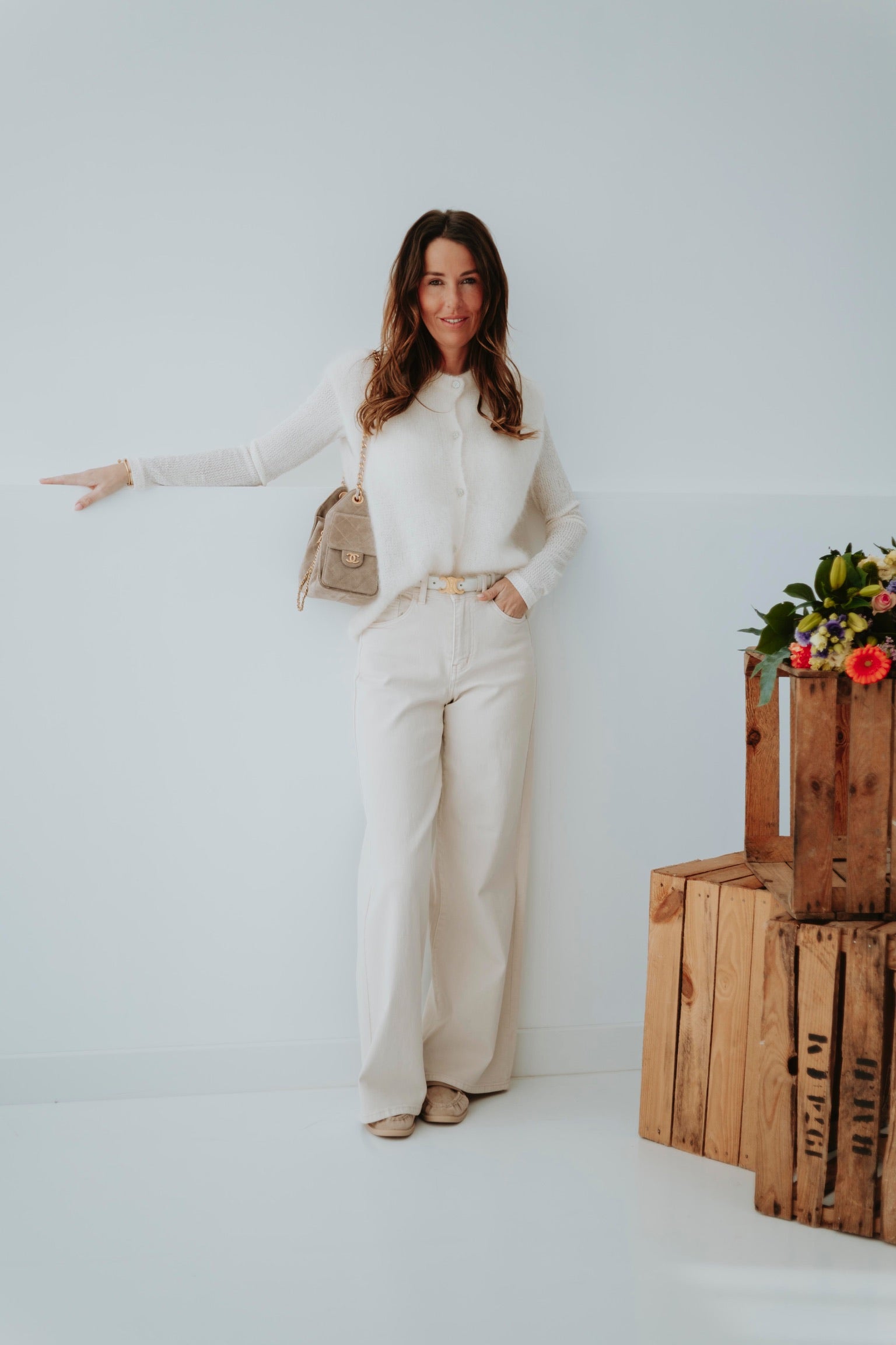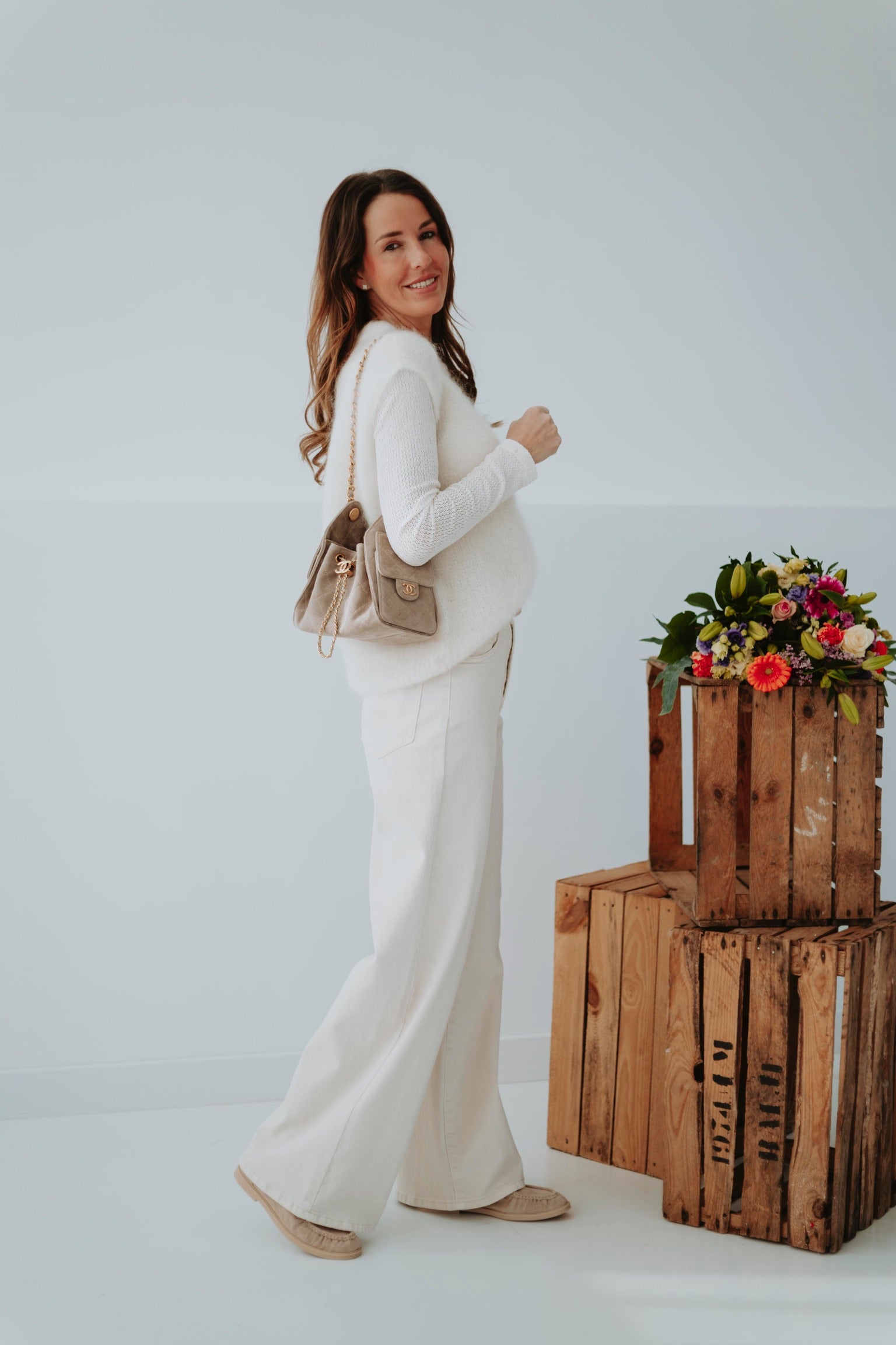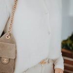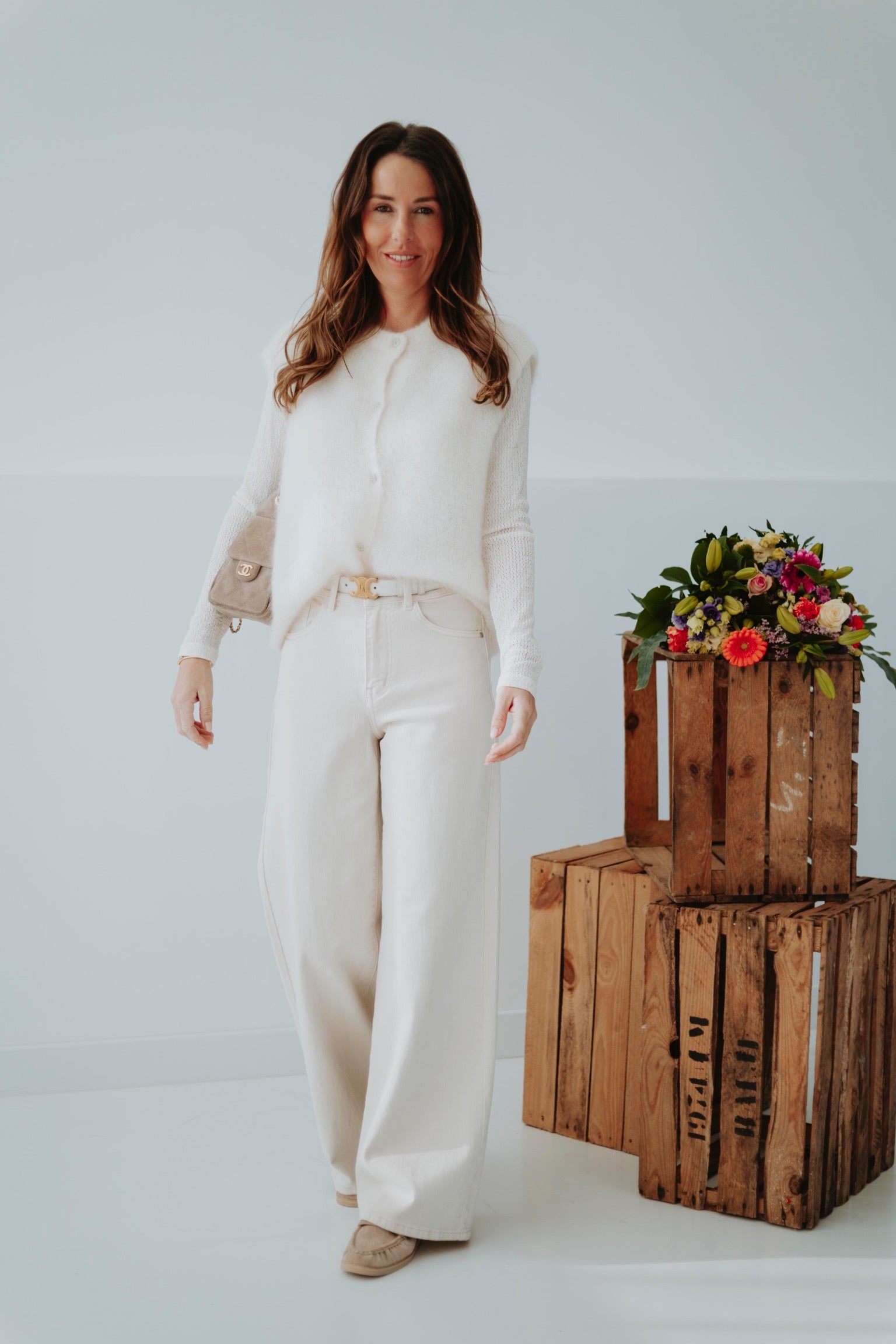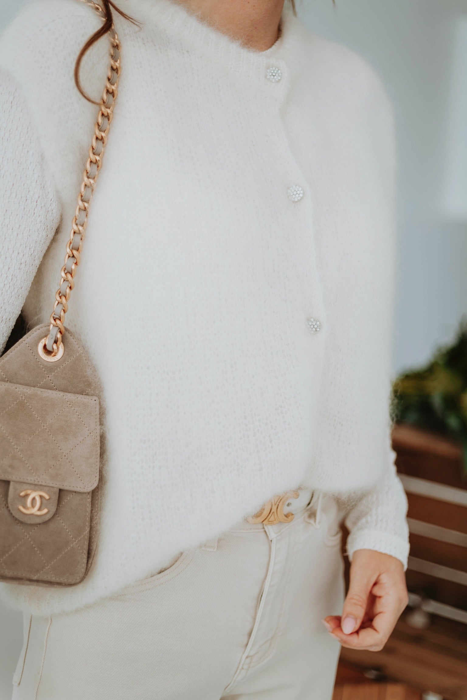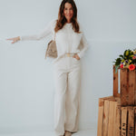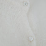 Een zachte, ecru mohair top zonder mouwen, afgewerkt met subtiele, blinkende knoopjes voor een speels detail. Licht en luchtig, perfect om over een blouse of top te dragen tijdens zonnige lentadagen. Chic en cozy tegelijk, een echte musthave voor een frisse lentegarderobe.