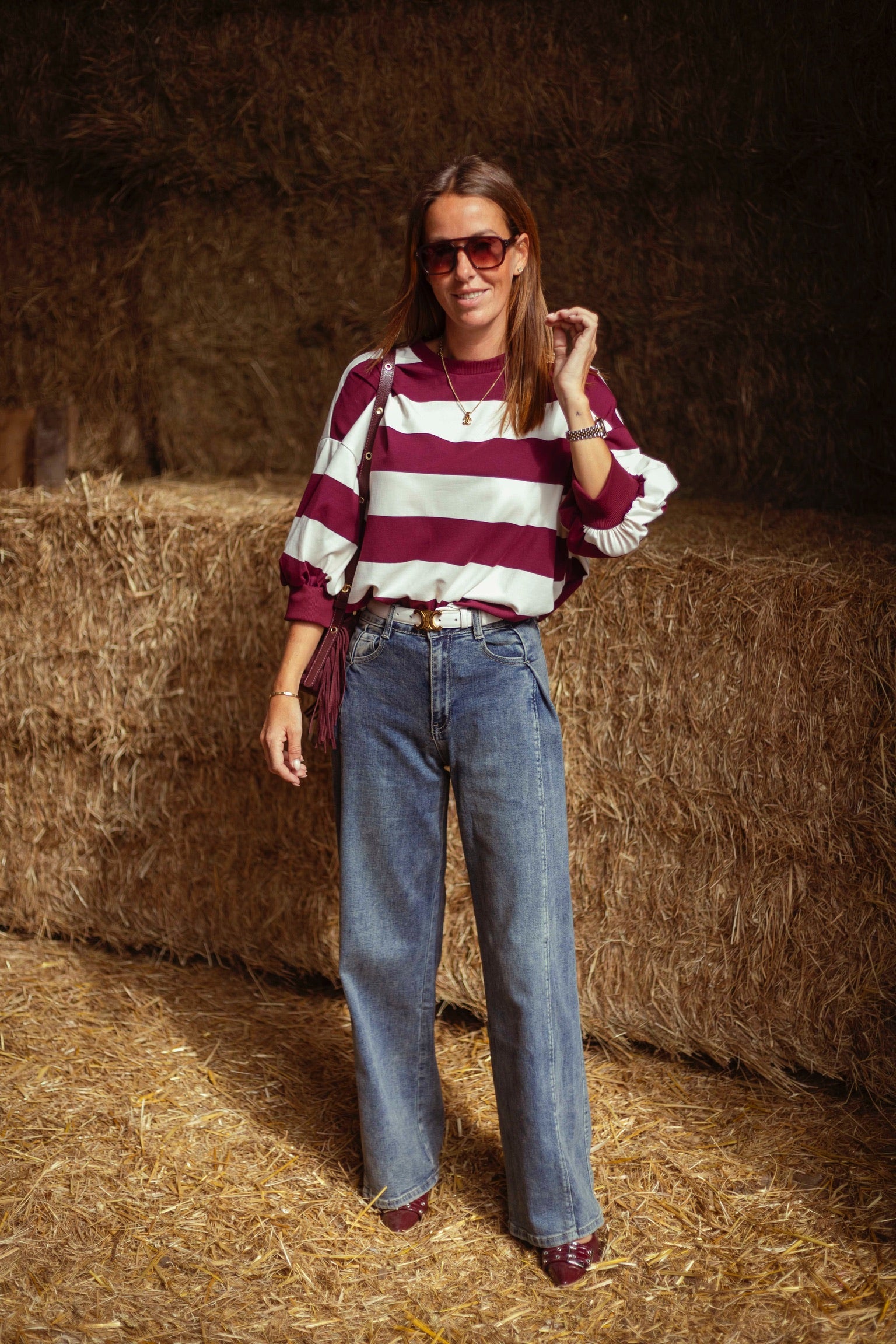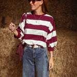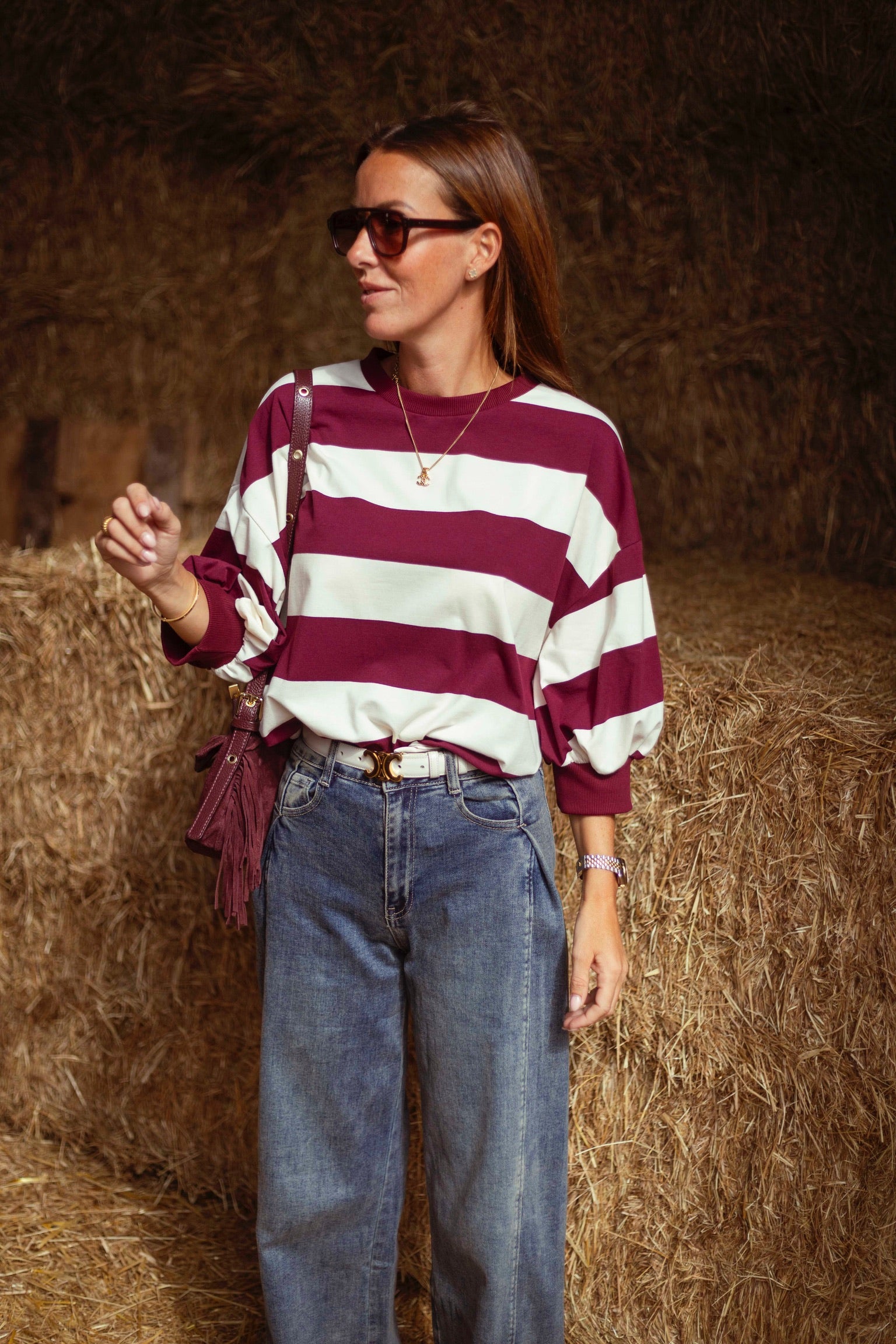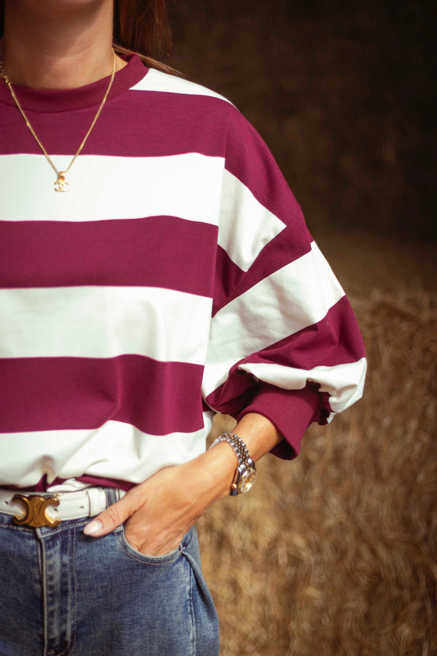 Deze trui in warme bordeauxtinten valt op door de dikke strepen en iets kortere mouwen die voor een speels effect zorgen. Comfortabel en stijlvol, perfect om te combineren met een hoge taille broek of rok voor een warme herfstlook.