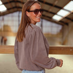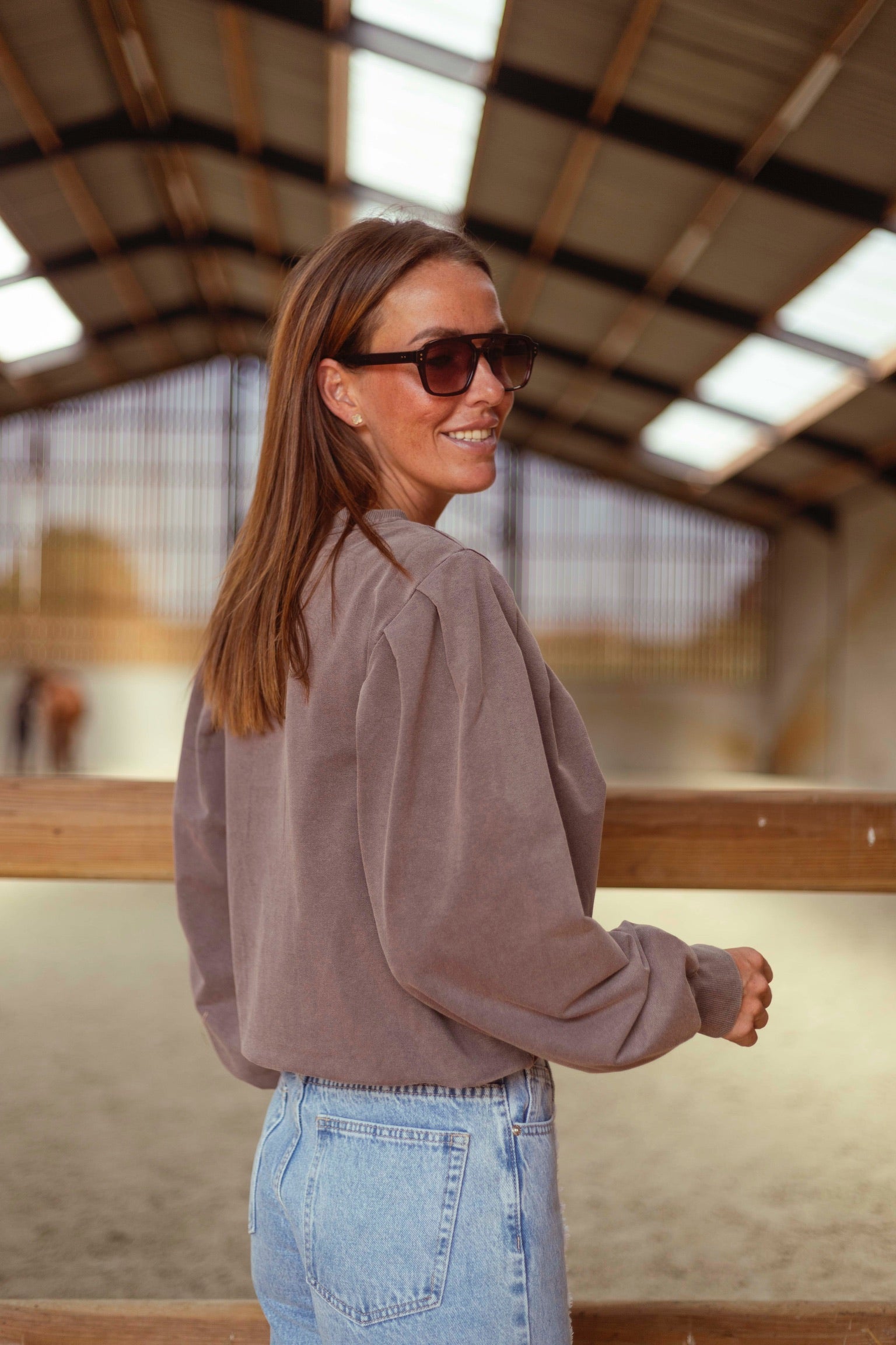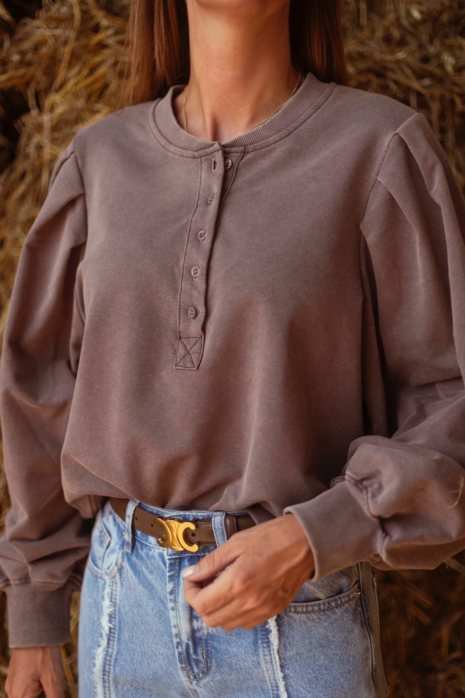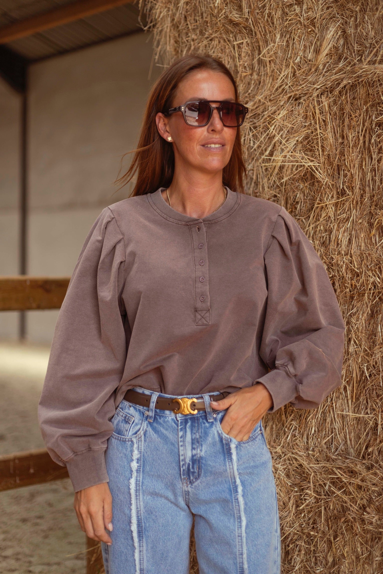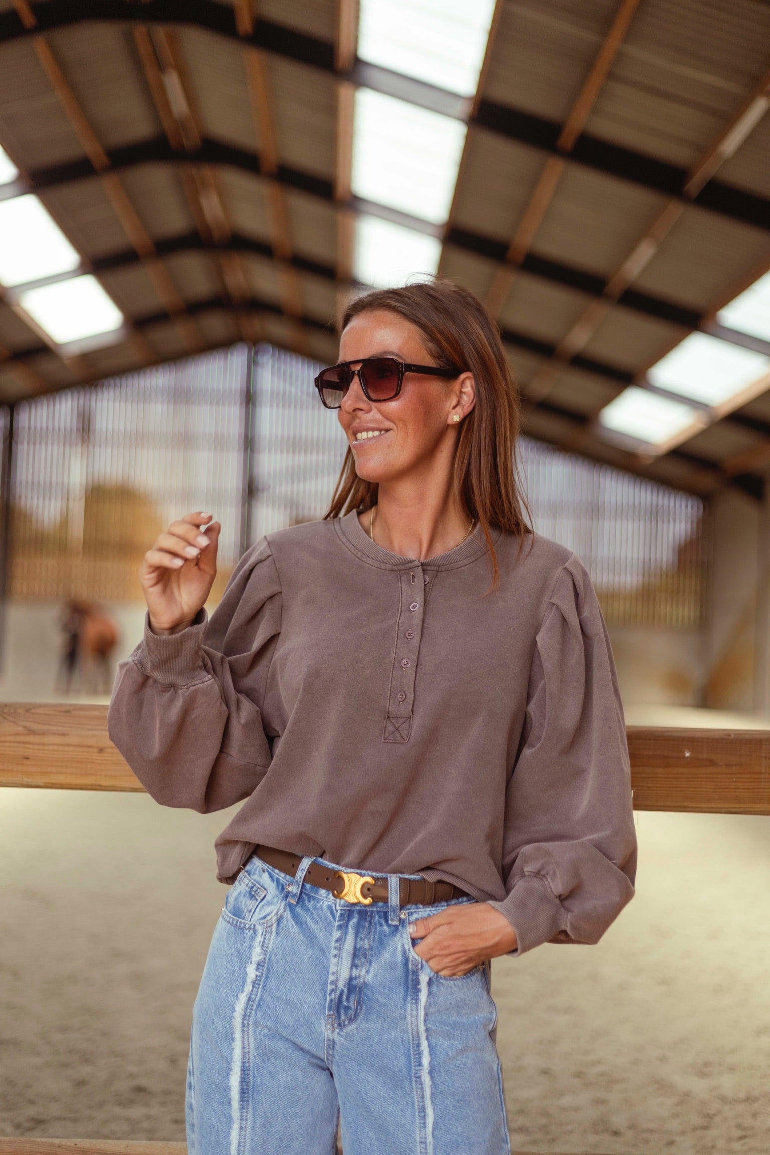 Een zachte sweater die warmte en stijl moeiteloos combineert voor frisse herfstdagen. De lichte pofmouwen en subtiele knoopdetails geven een charmante, speelse touch aan je outfit.