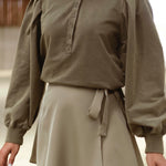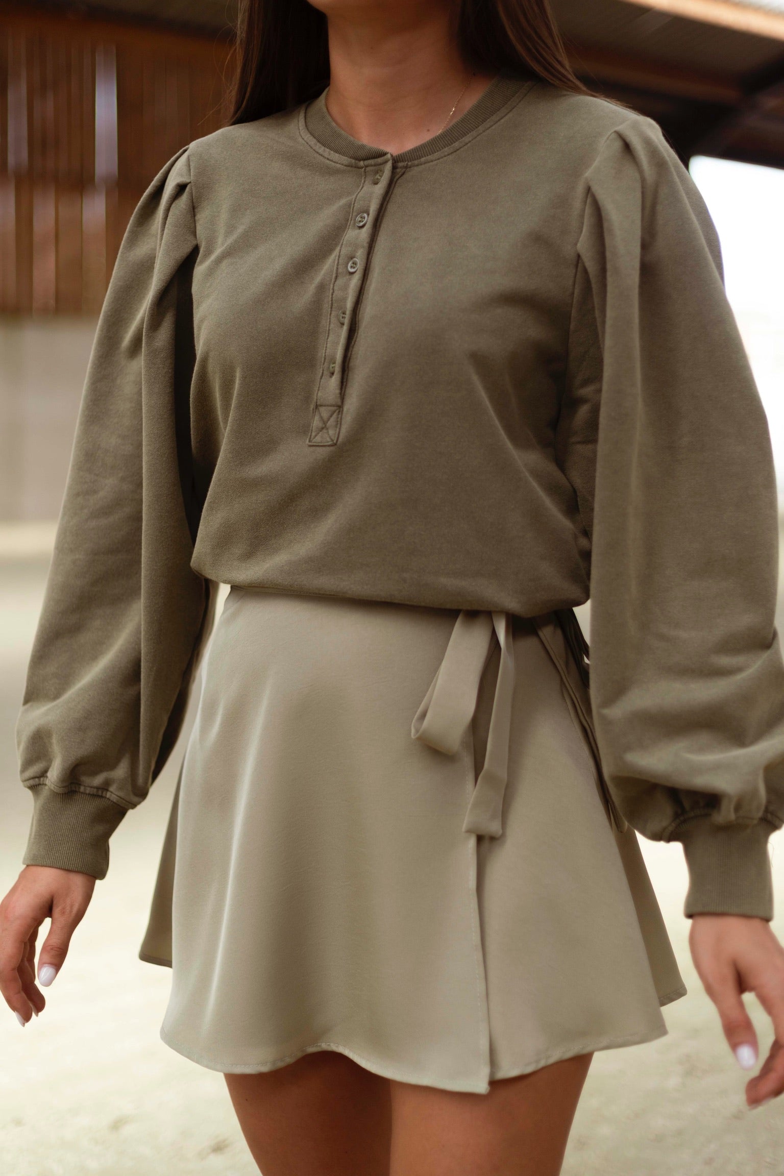Een zachte sweater die warmte en stijl moeiteloos combineert voor frisse herfstdagen. De lichte pofmouwen en subtiele knoopdetails geven een charmante, speelse touch aan je outfit.