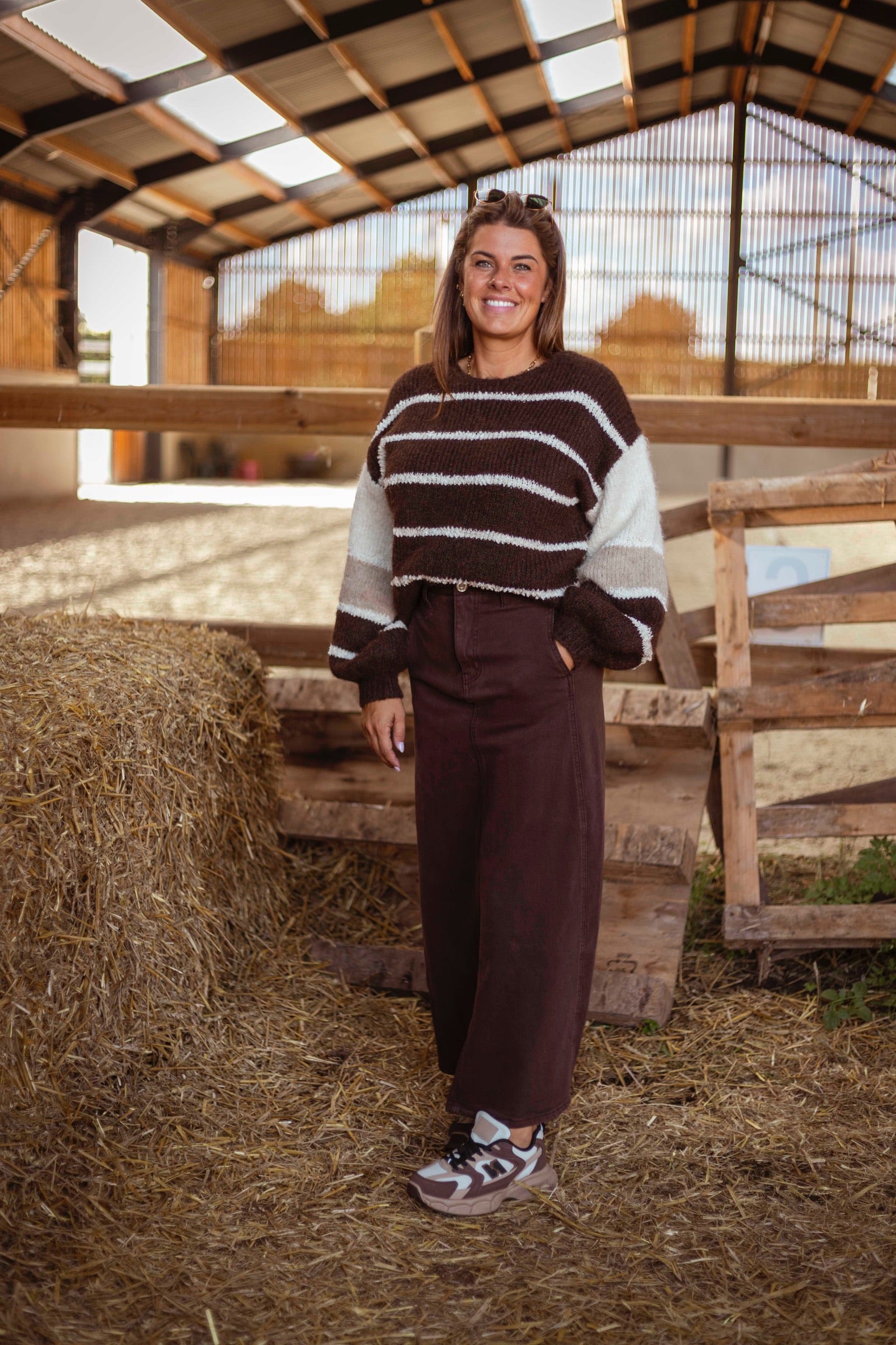 Met zijn rijke bruine tinten en speelse streepjespatroon voelt deze trui als een warme omhelzing op een koele herfstdag. Het comfortabele breisel en de tijdloze stijl maken hem de perfecte metgezel voor elke herfstwandeling, van de stad naar het platteland.