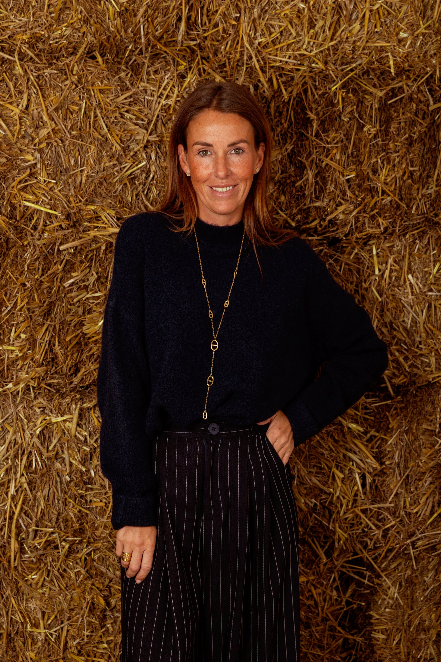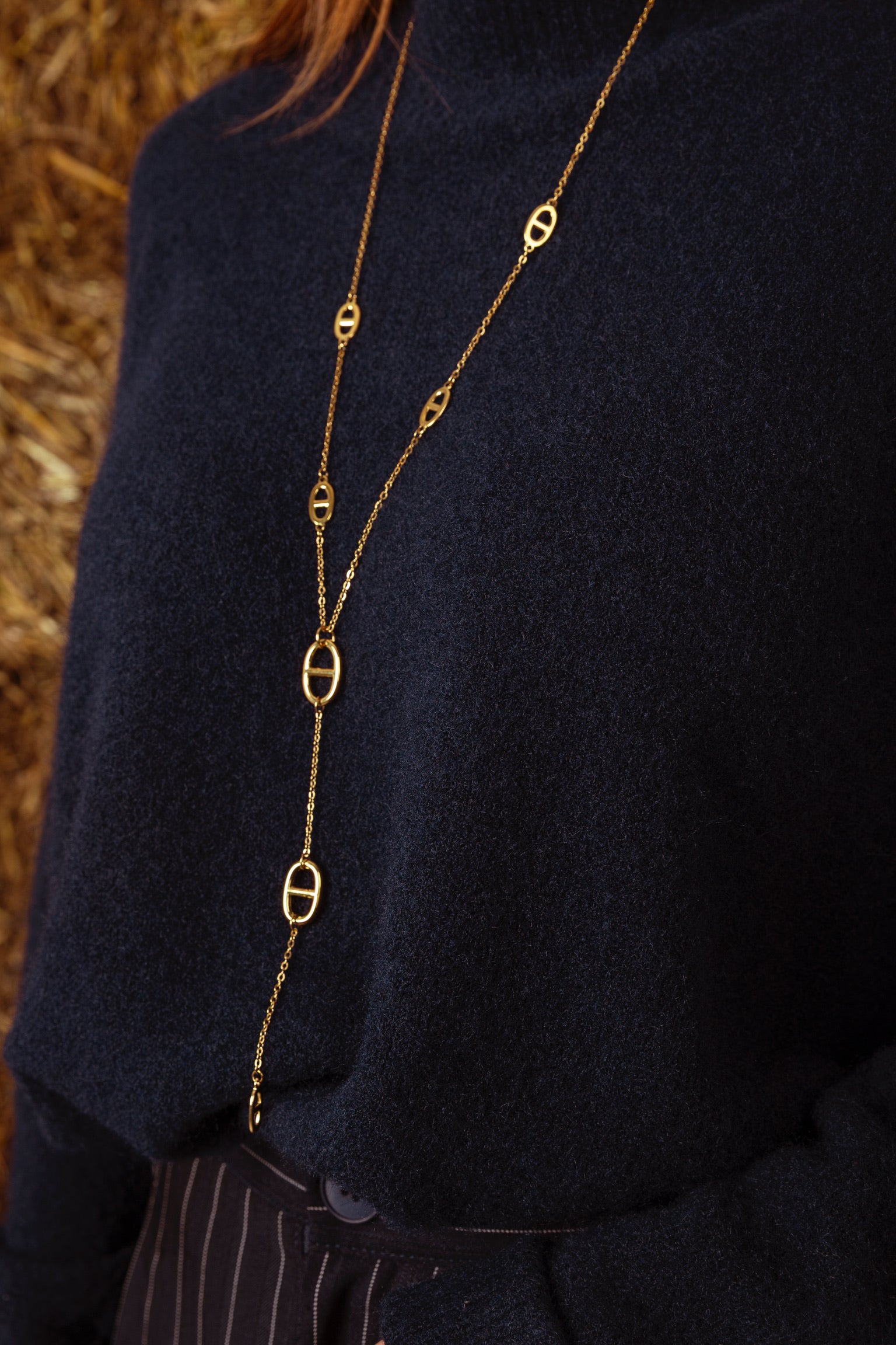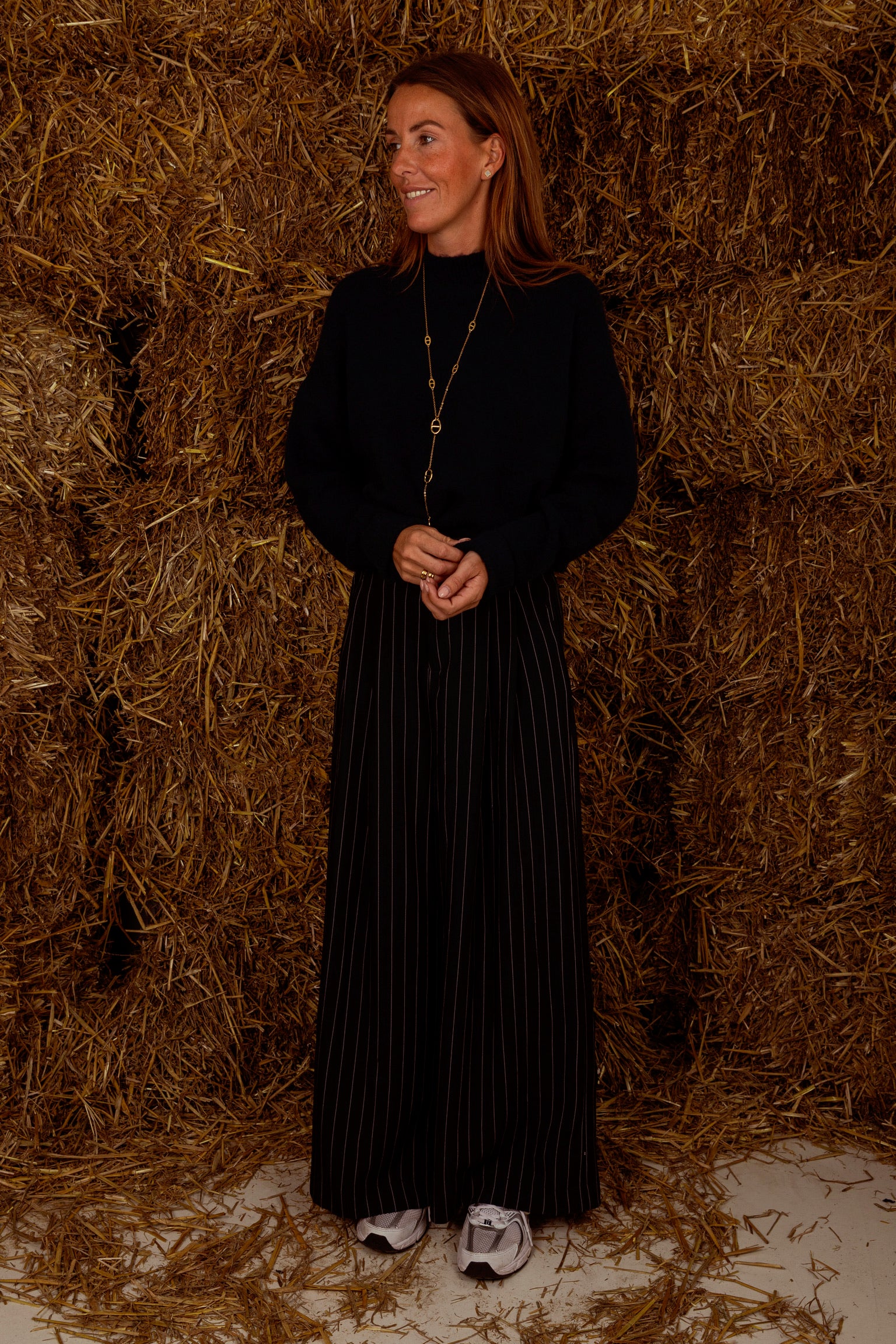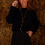 Een gebreide trui in diepblauw die de koele, heldere herfstlucht weerspiegelt. Het zachte materiaal biedt warmte zonder zwaar te voelen, perfect voor ontspannen dagen binnen of buiten. Een tijdloze toevoeging aan je herfstgarderobe.