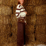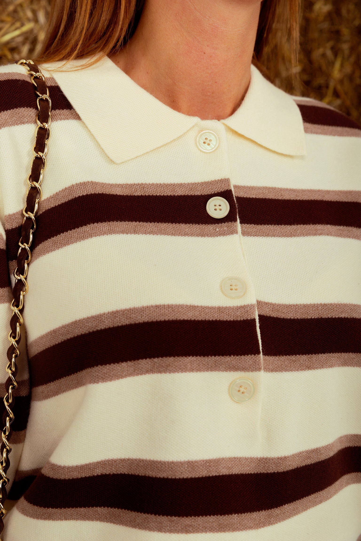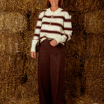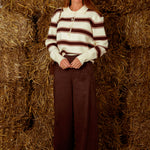 Een warme trui met zachte strepen die het rustige gevoel van mistige herfstochtenden oproept. De ecru tint zorgt voor een tijdloze uitstraling, ideaal om laagjes te creëren tijdens frisse dagen. Comfort en casual charme in één.