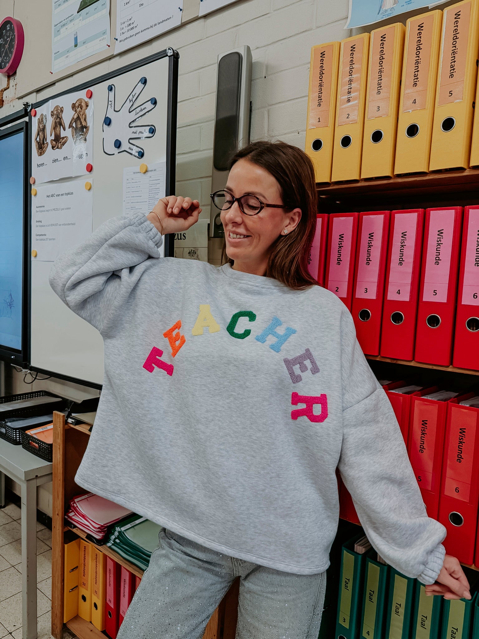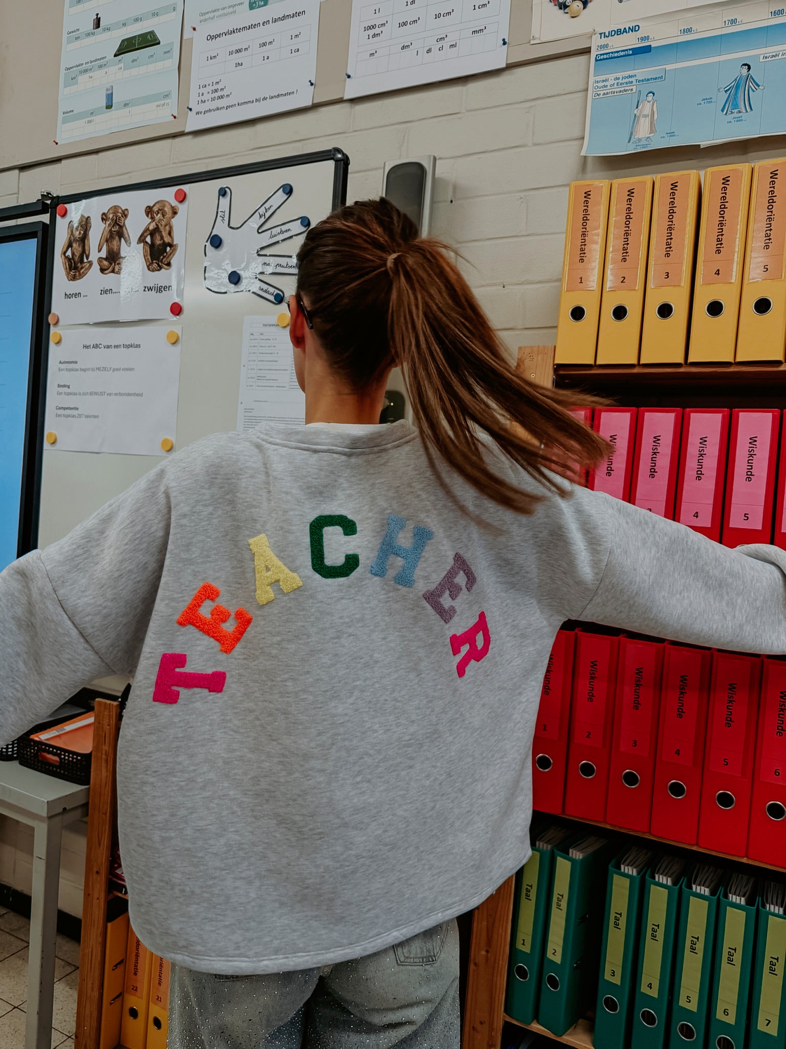 Een cozy sweater met grote, opvallende multi-color letters die TEACHER  achteraan dragen.  Perfect cadeautje voor onder de kerstboom !