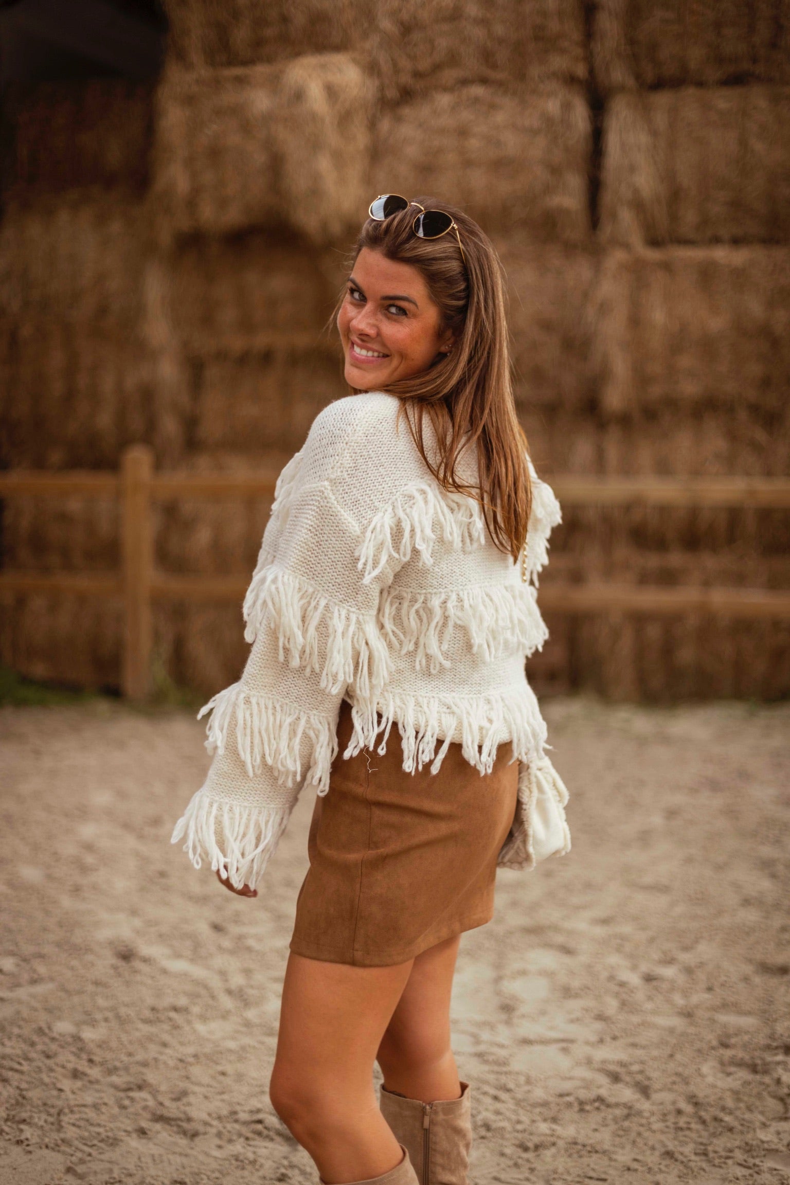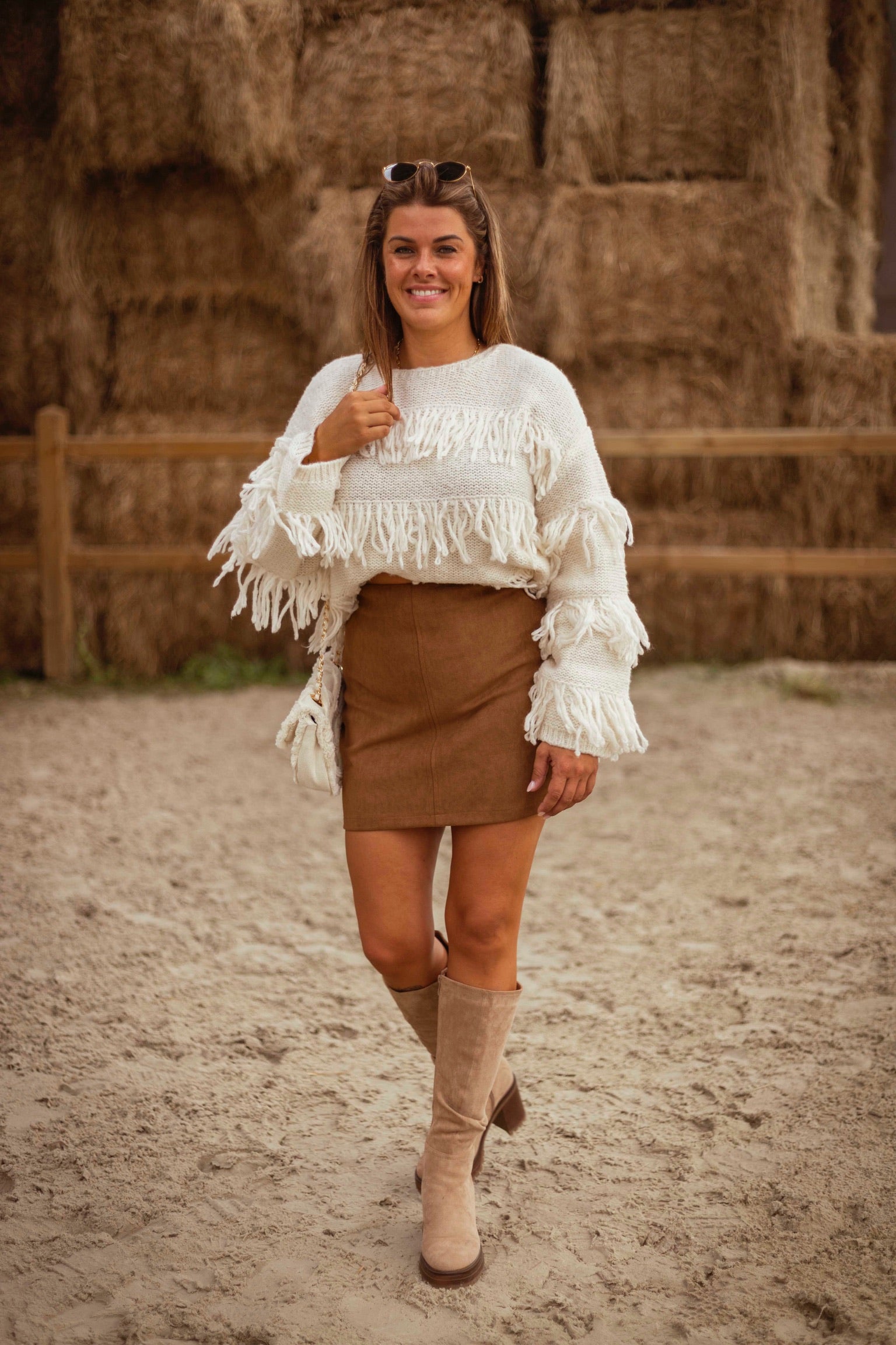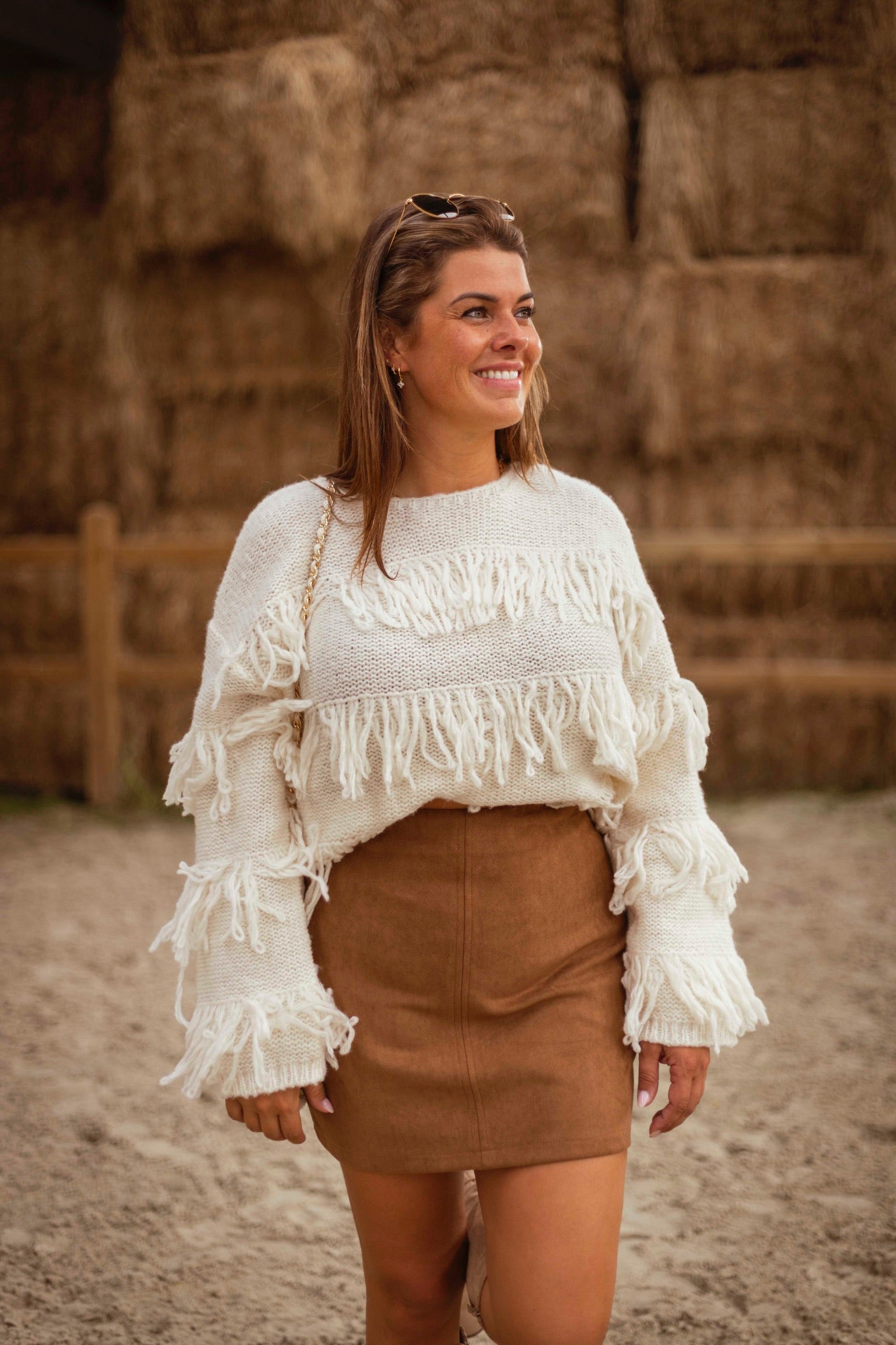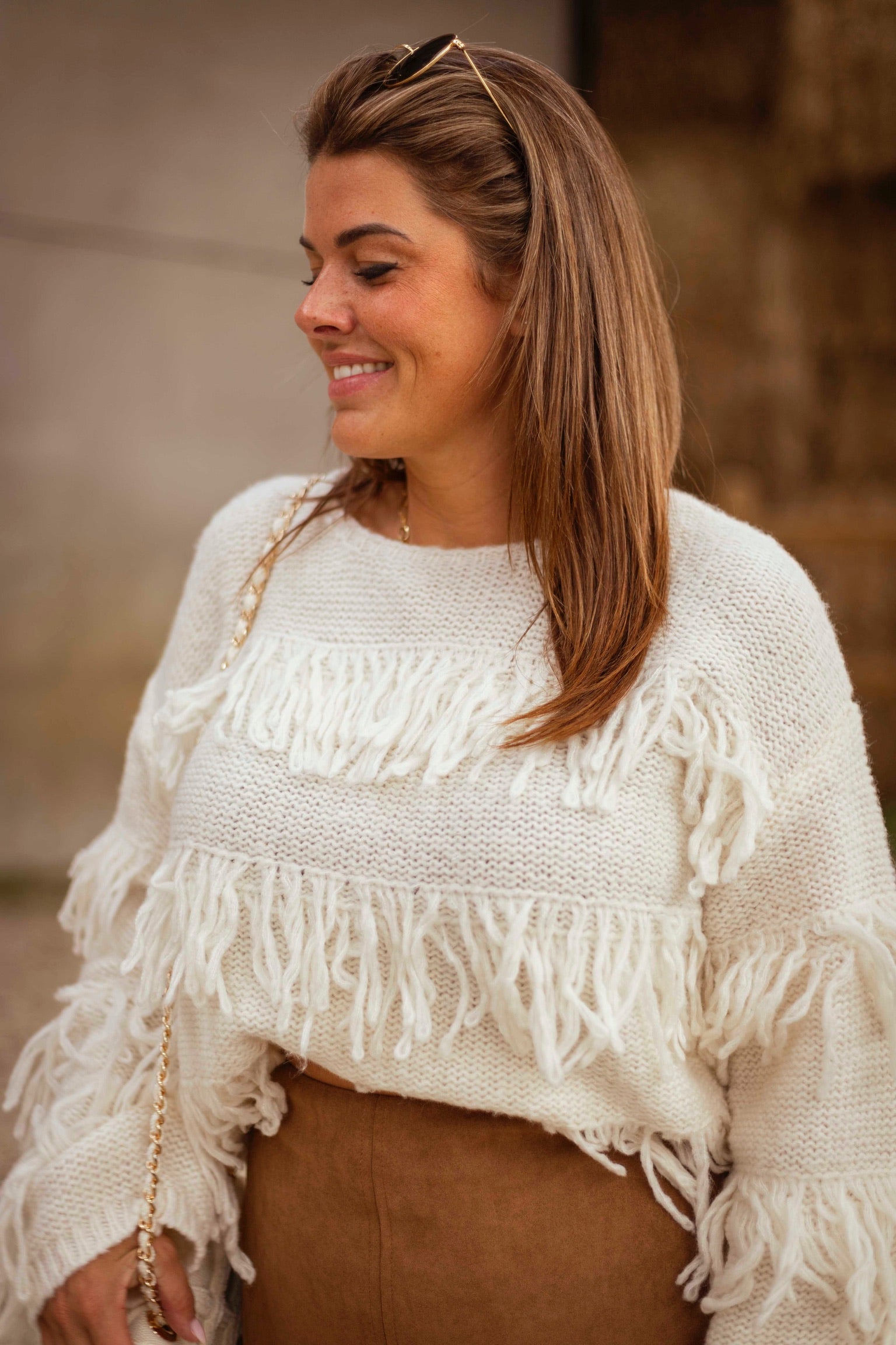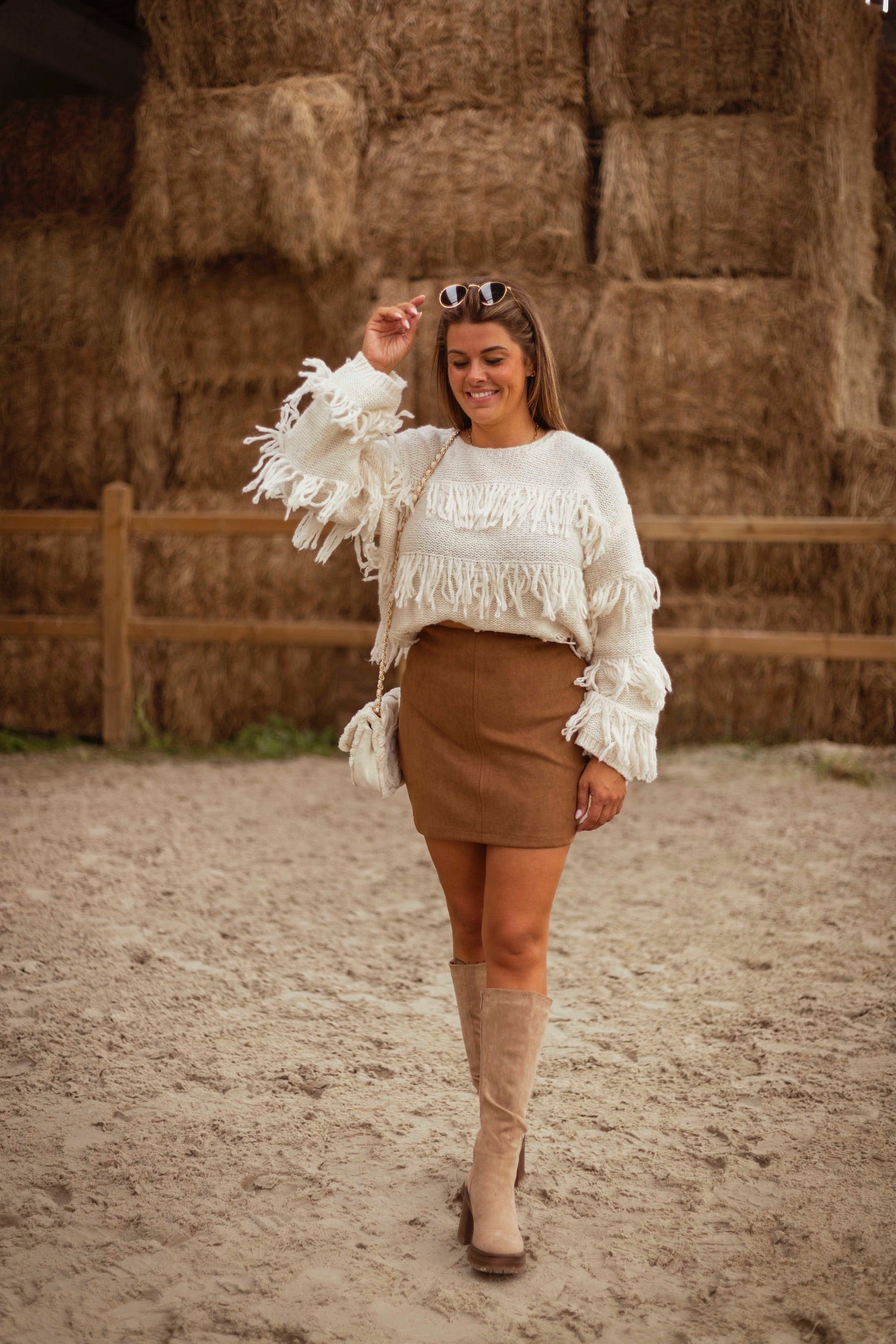 Deze ecru trui met speelse franjes brengt beweging en karakter in je herfstlook, zonder in te leveren op zachtheid en comfort. De losse pasvorm en warme tint maken het een opvallend maar draagbaar stuk dat moeiteloos de overgang van nazomer naar koelere dagen begeleidt.