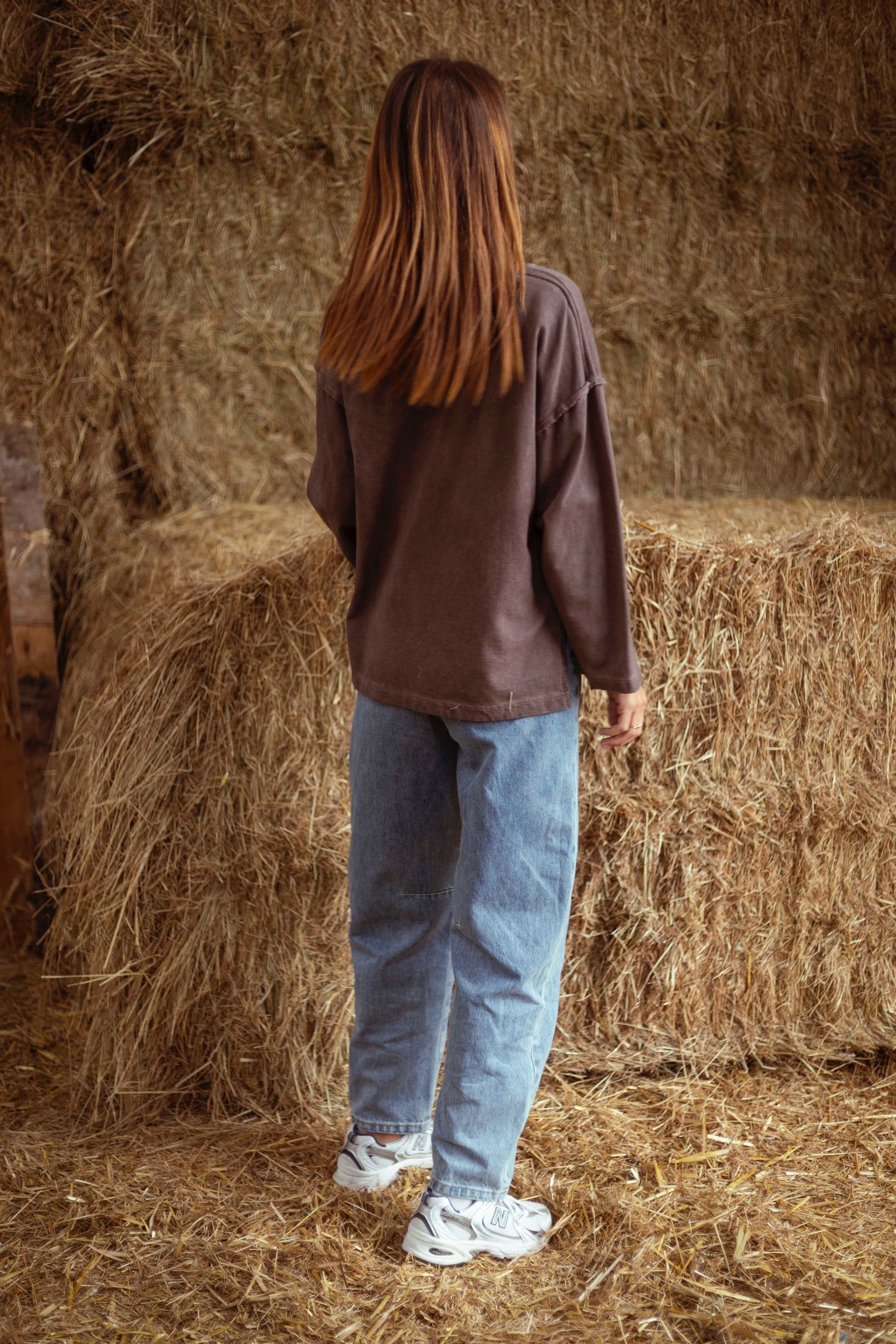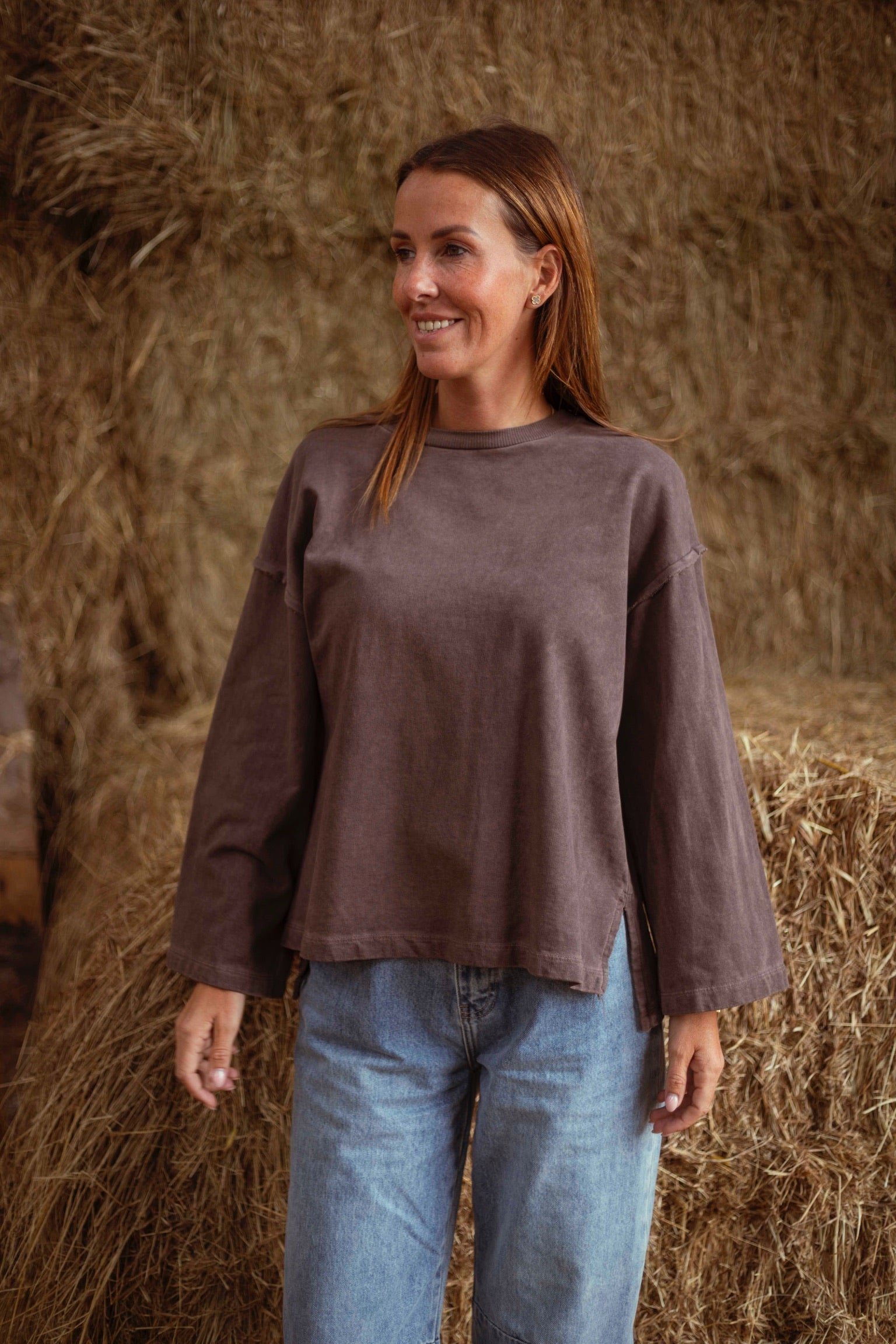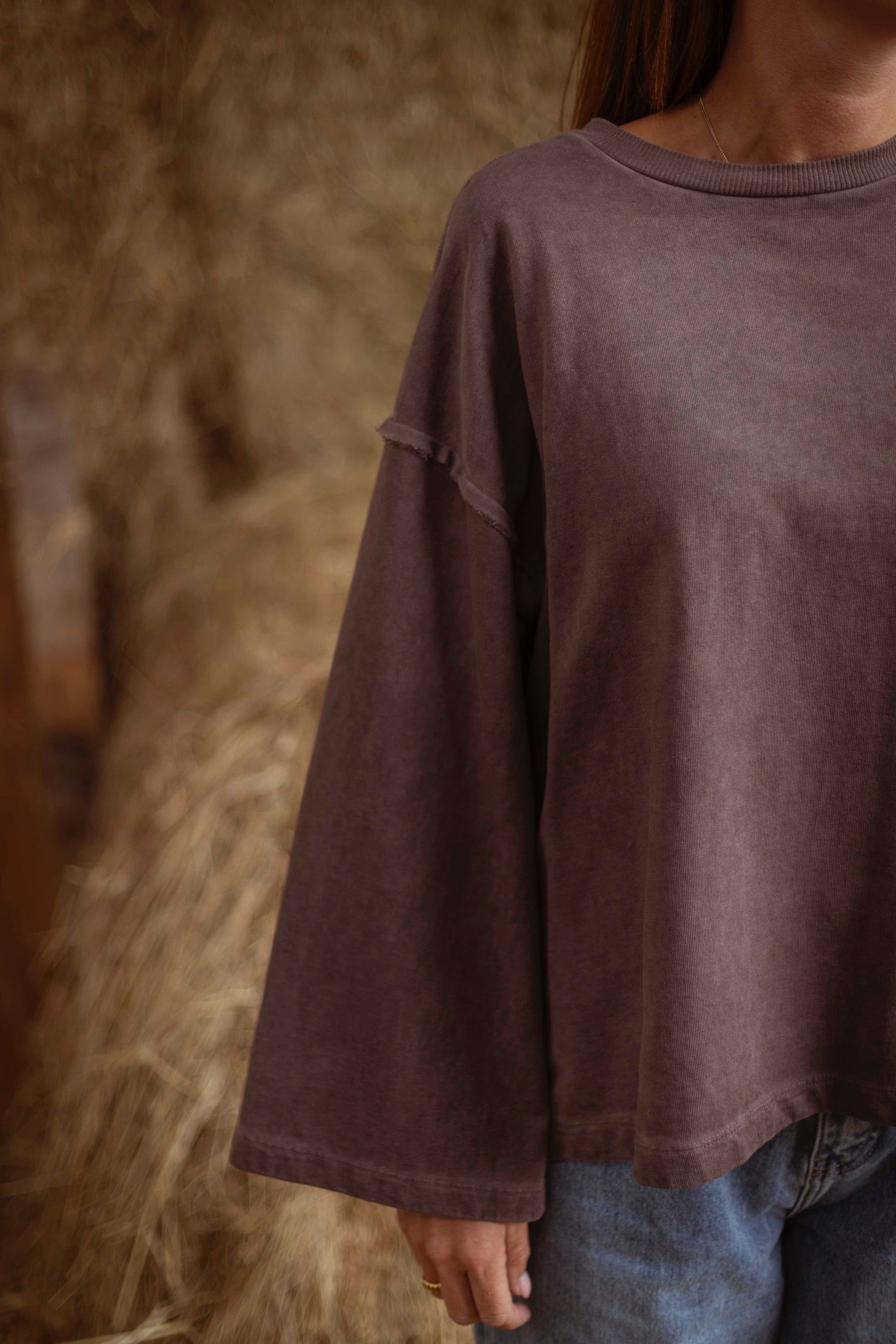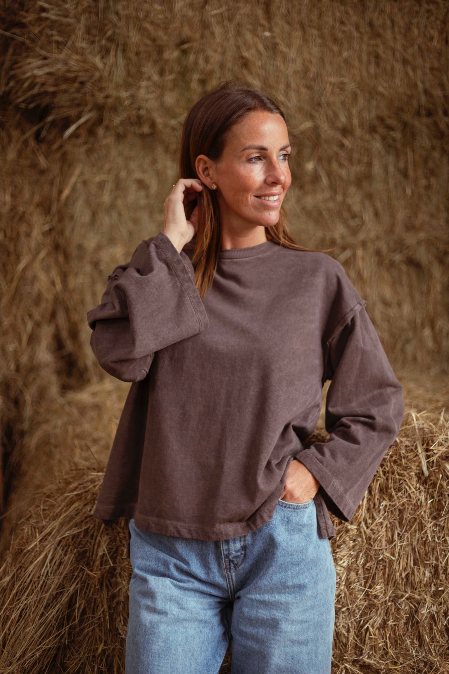 Deze bruine trui met iets wijdere mouwen geeft een eigentijdse draai aan een klassieker. Comfortabel en stijlvol tegelijk, perfect voor frisse herfstdagen waarop je net iets extra’s wilt.