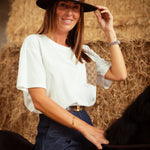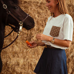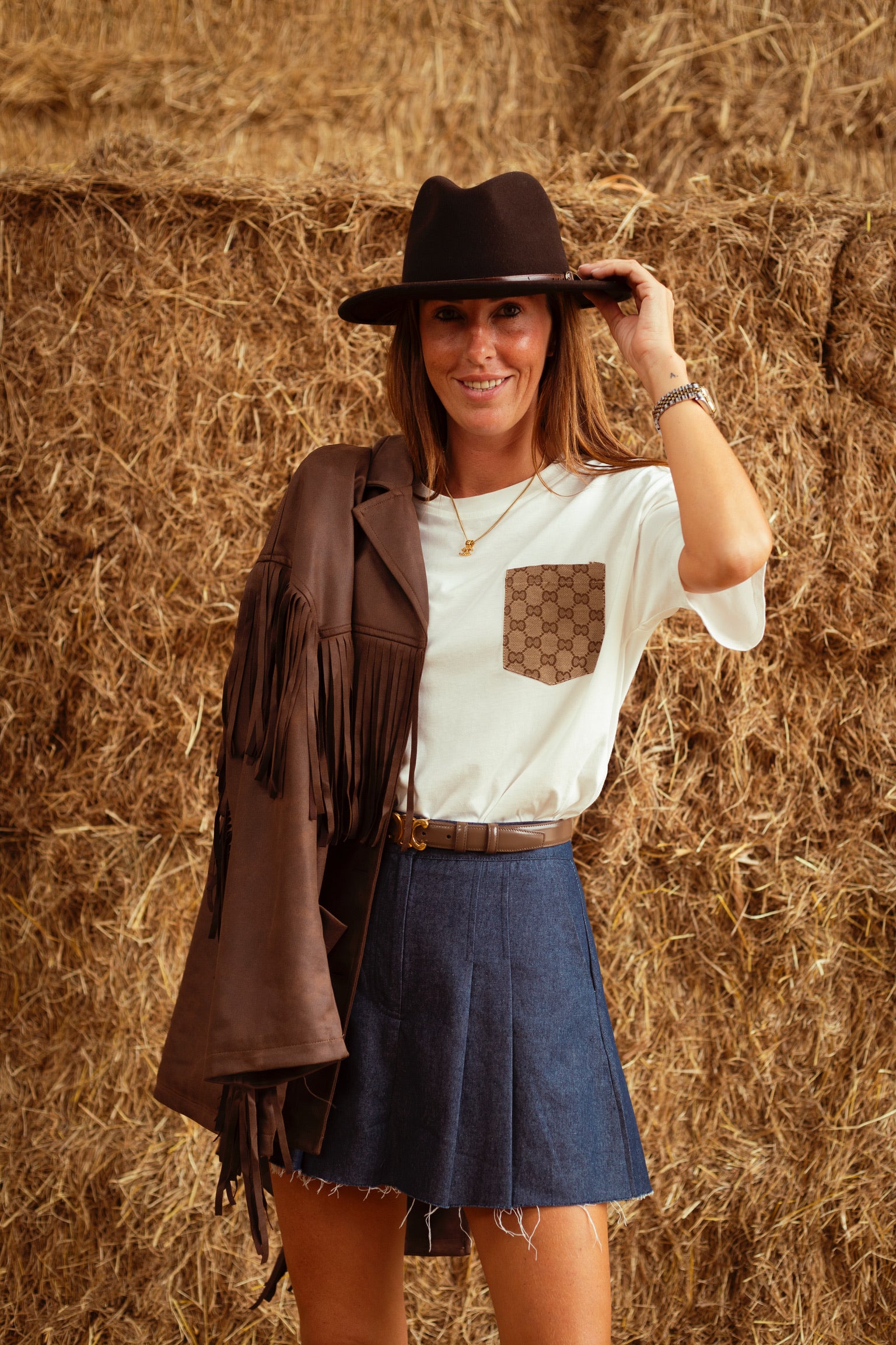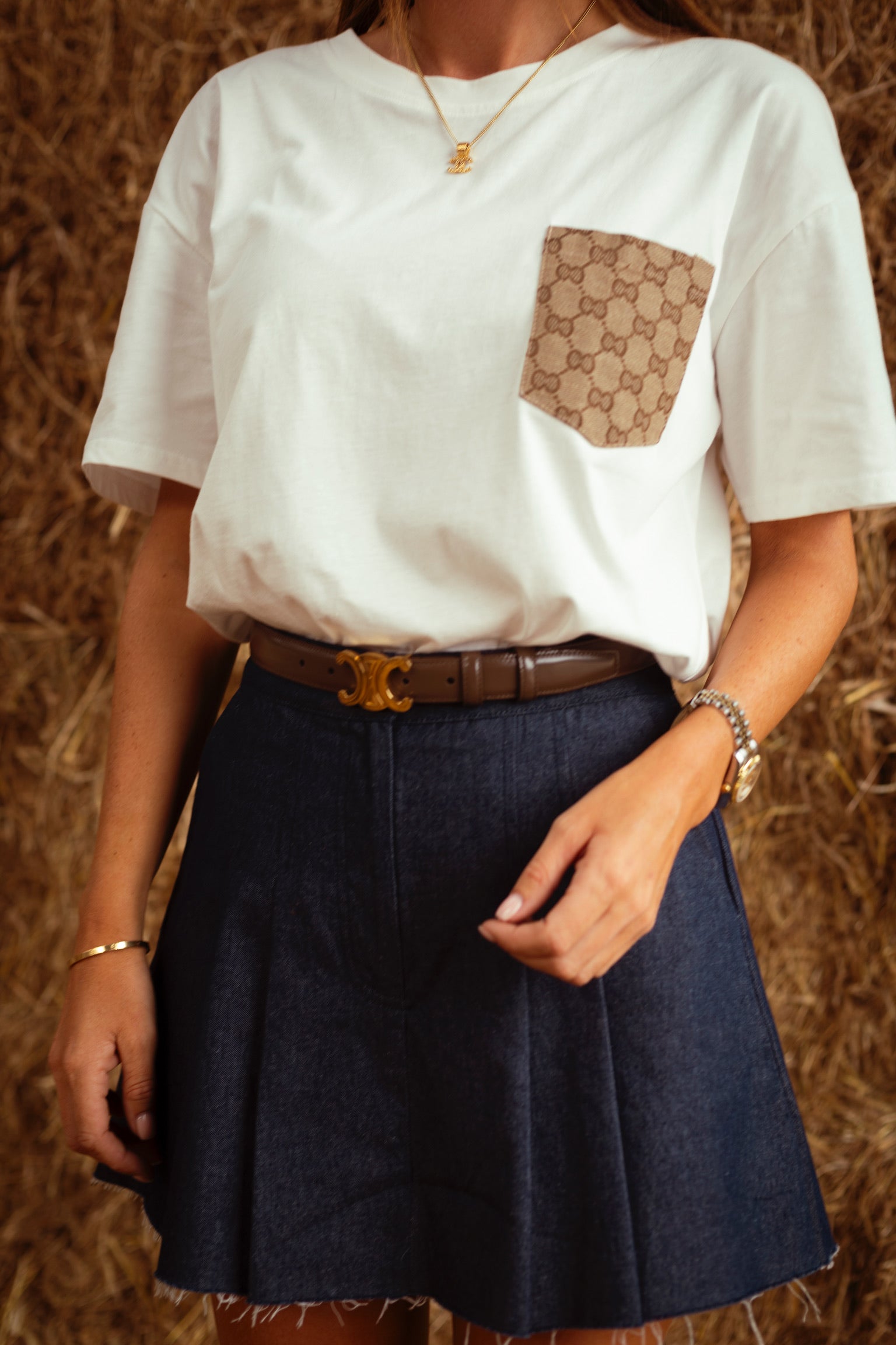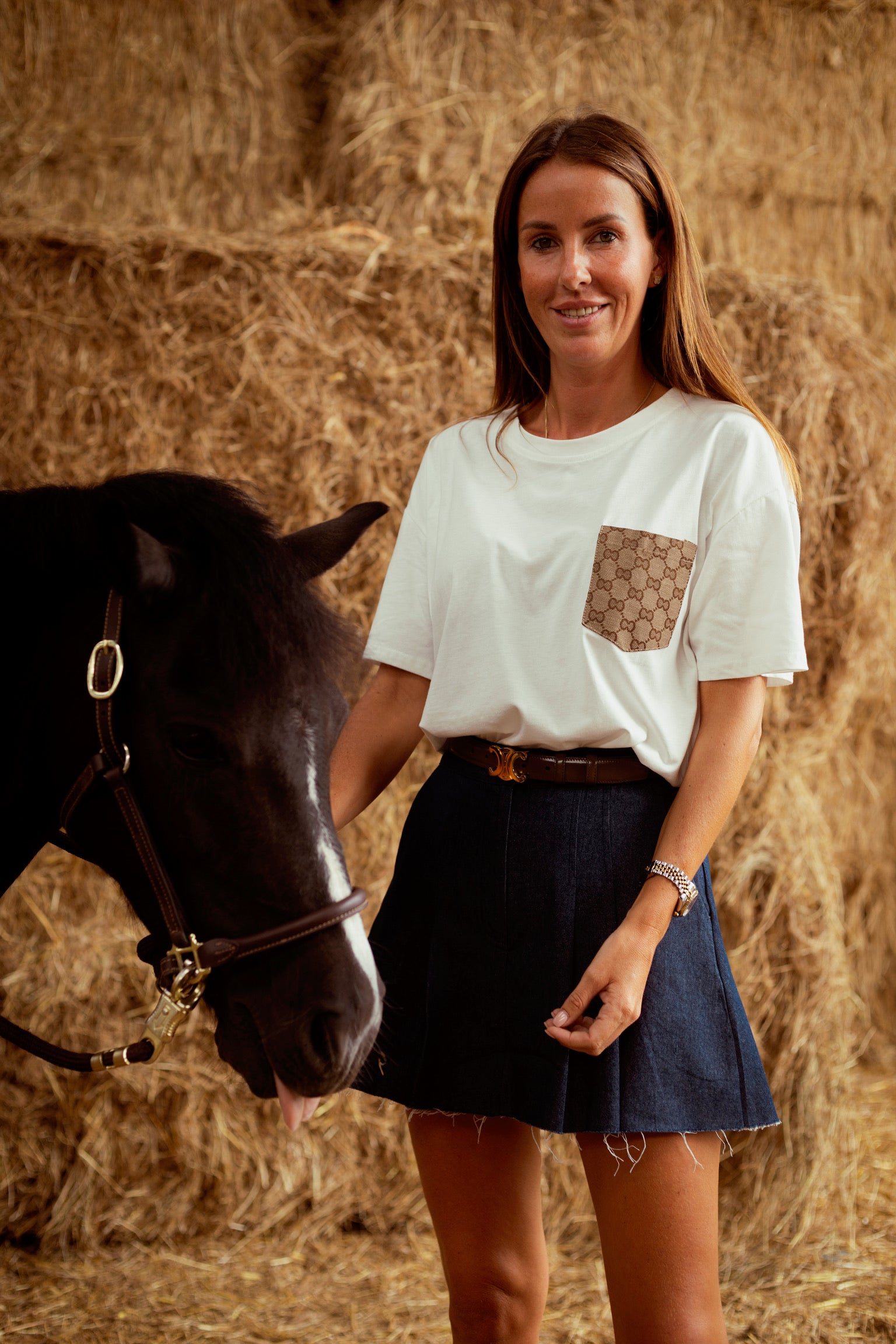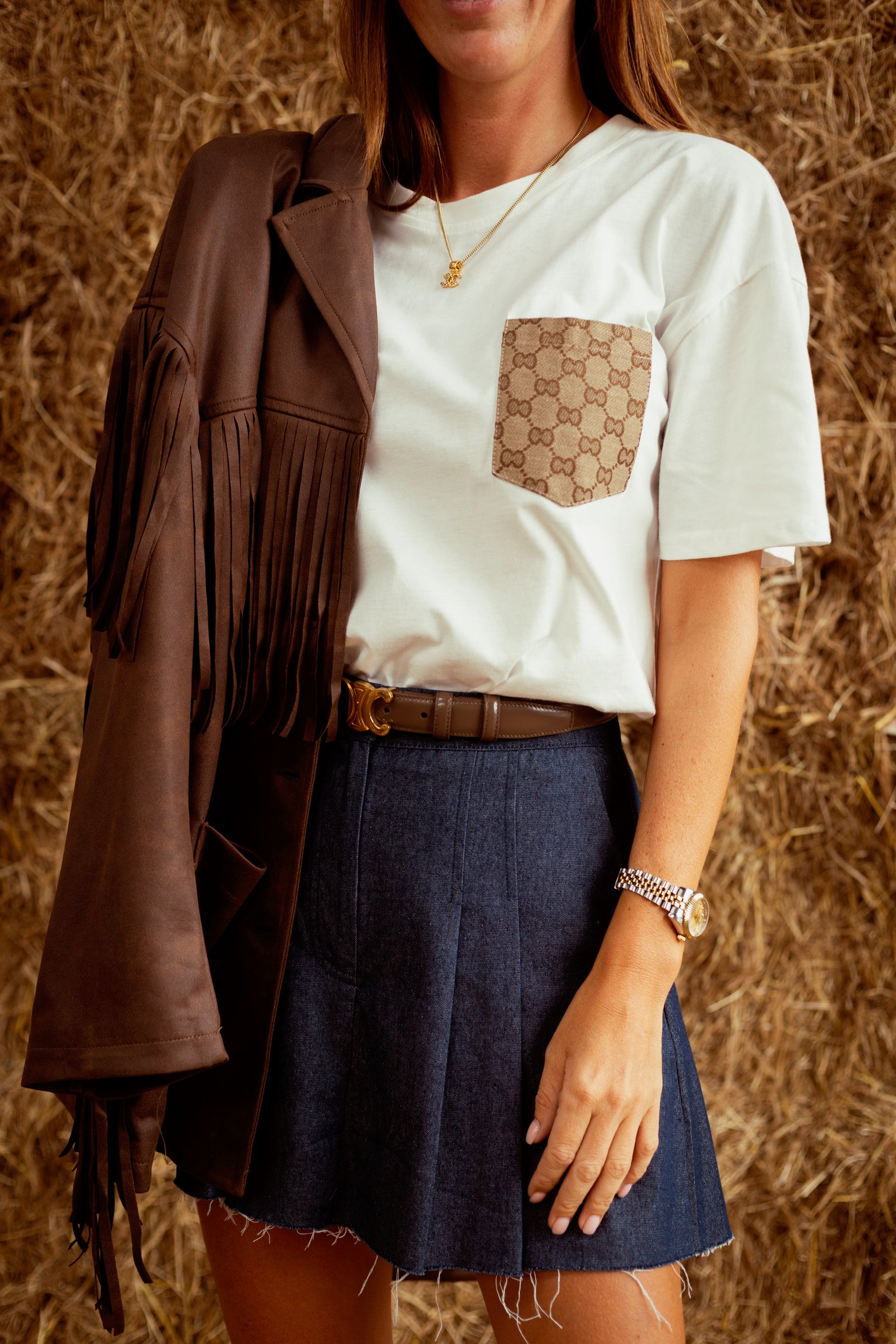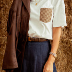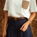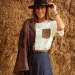 Deze witte t-shirt krijgt een leuke western twist dankzij het contrasterende borstzakje in bruin met subtiele print. Simpel van snit maar met nét dat tikkeltje extra. Perfect om te combineren met jeans of een rokje voor een casual cowgirl vibe.