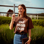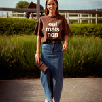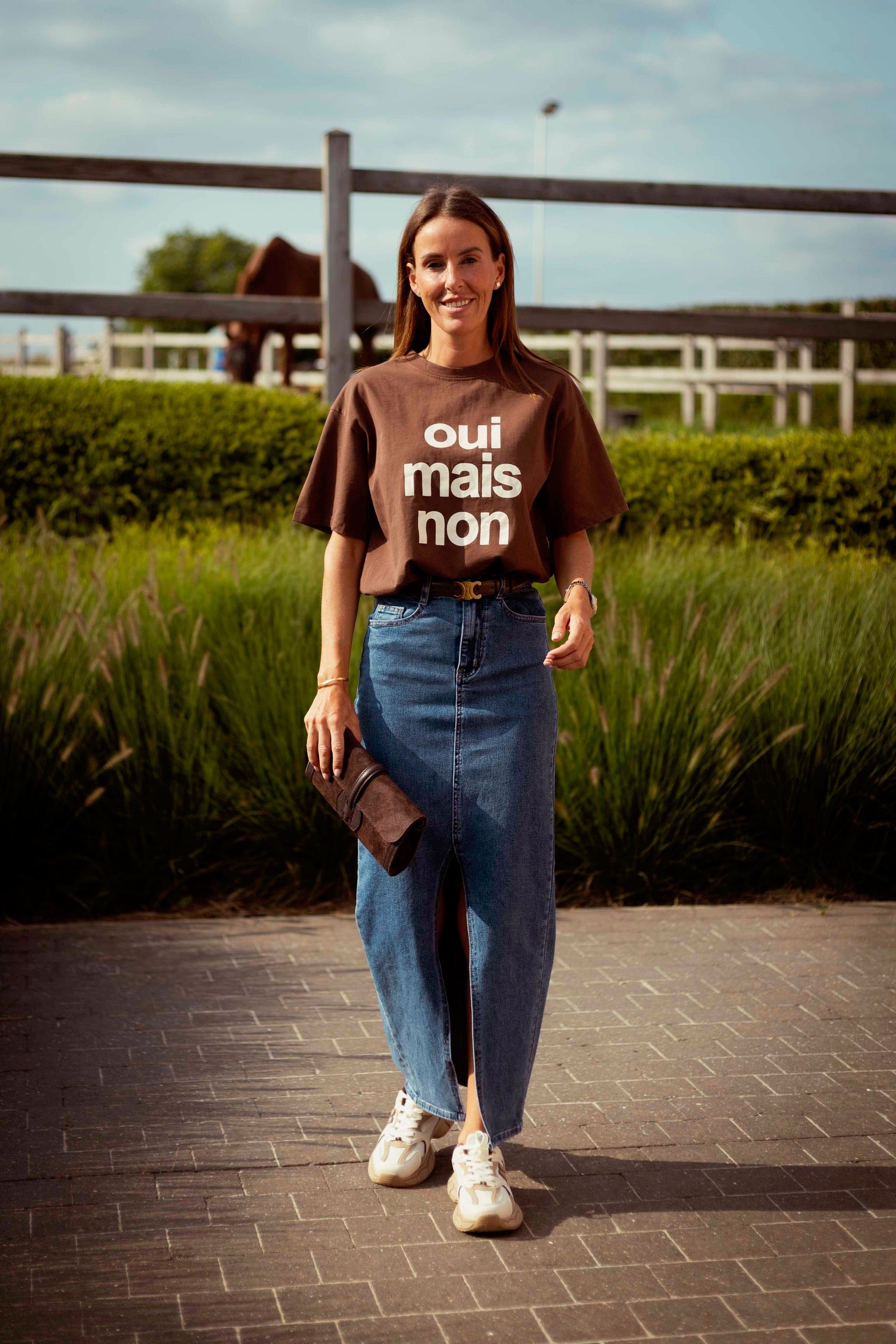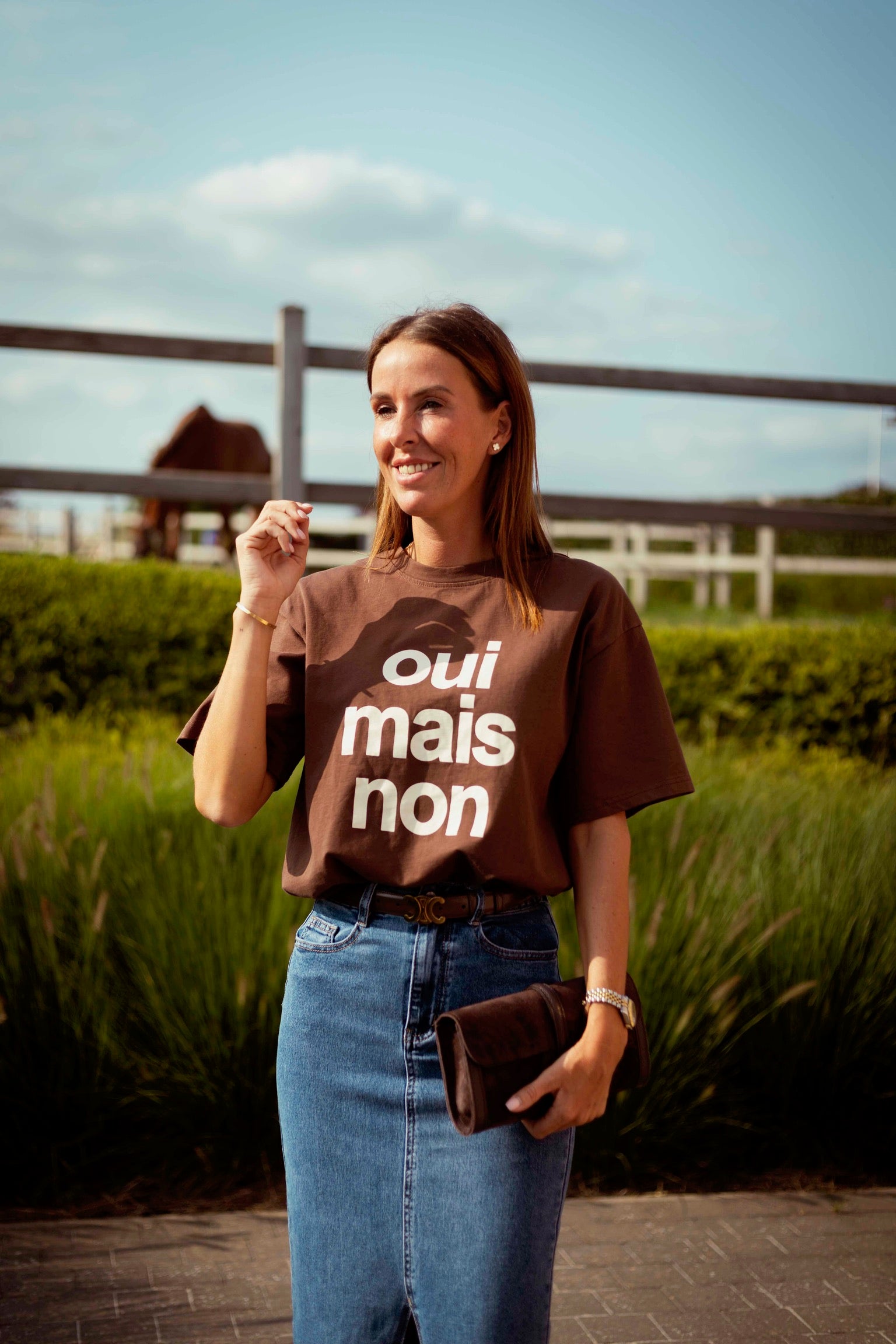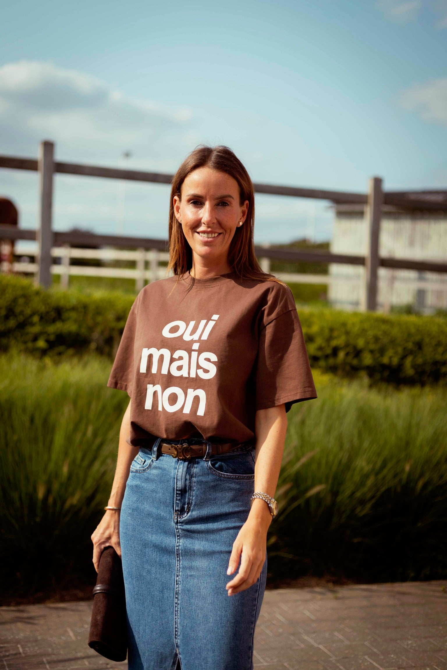 Dit bruine t-shirt met speelse *Oui mais non*-print brengt een vleugje humor in je herfstoutfit. De warme kleur past perfect bij het seizoen en laat zich moeiteloos combineren met jeans of een skort. Casual met karakter, ideaal voor elke dag.