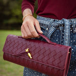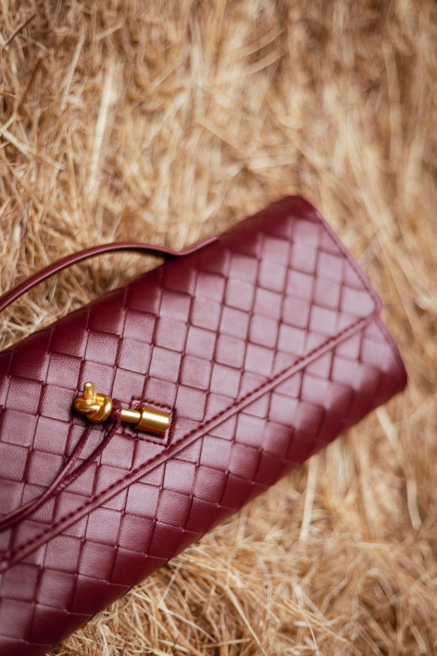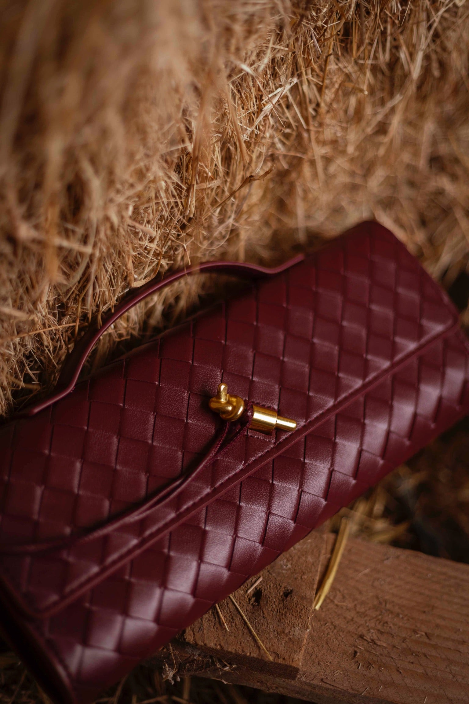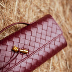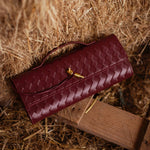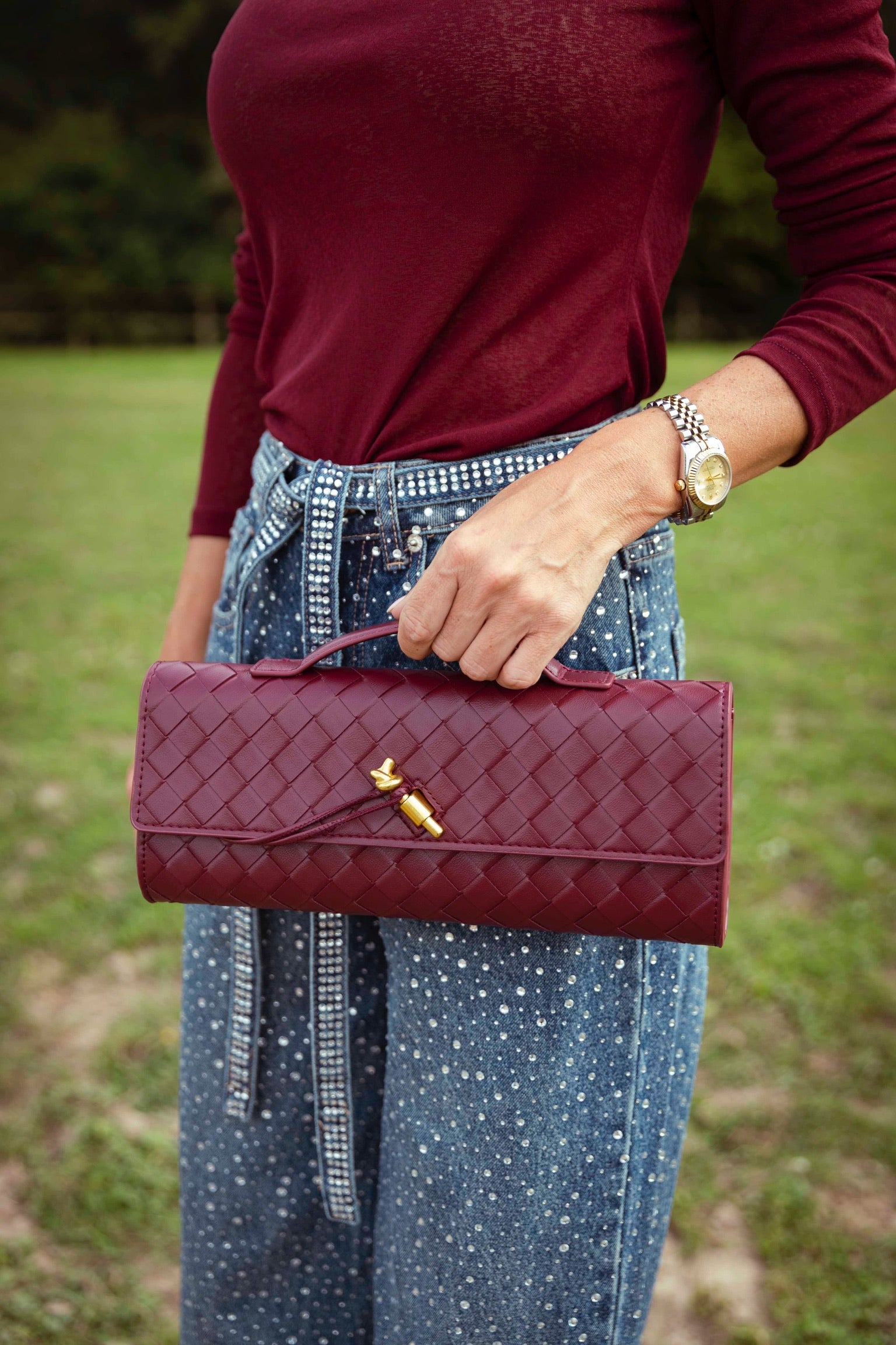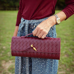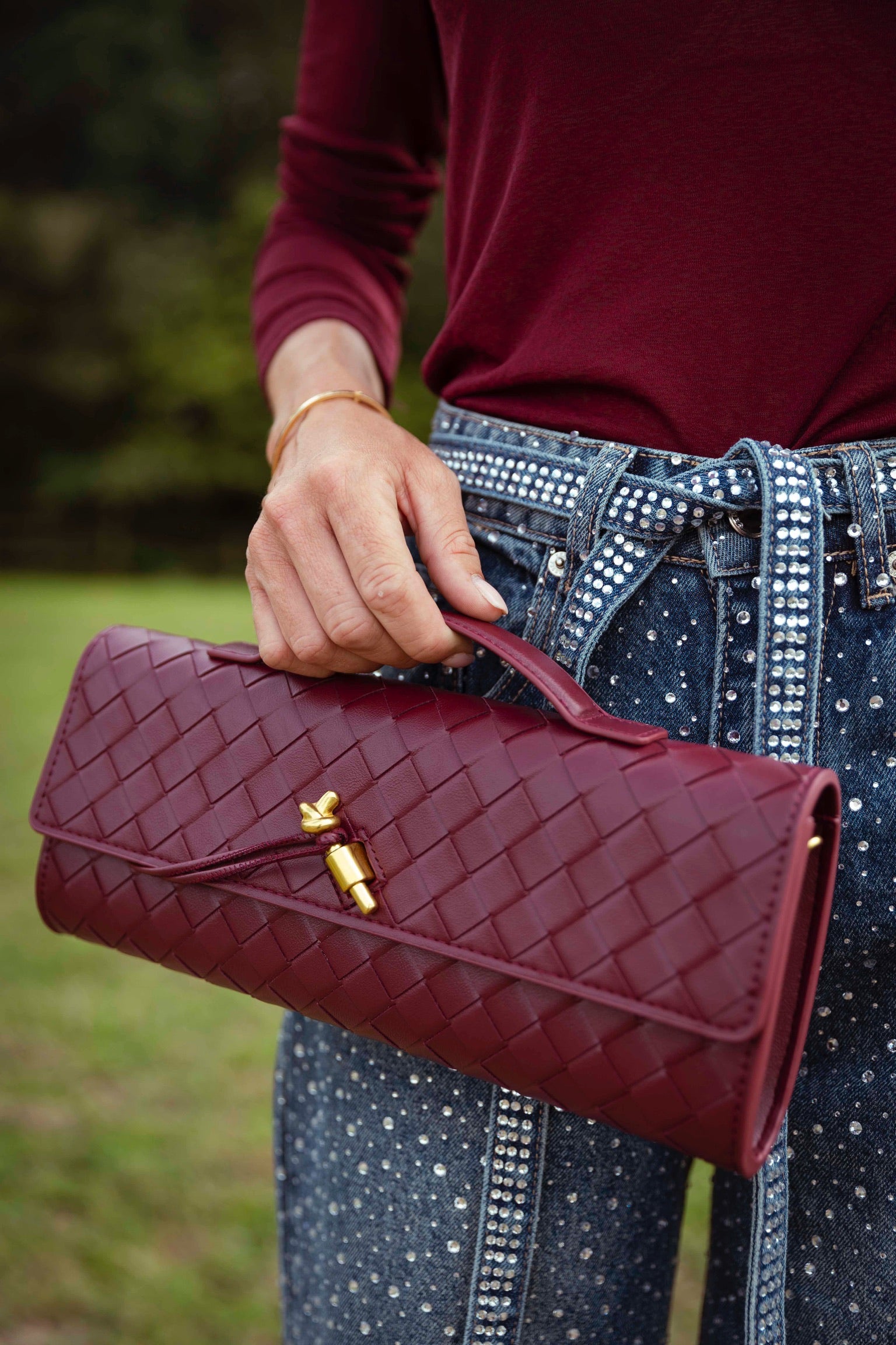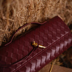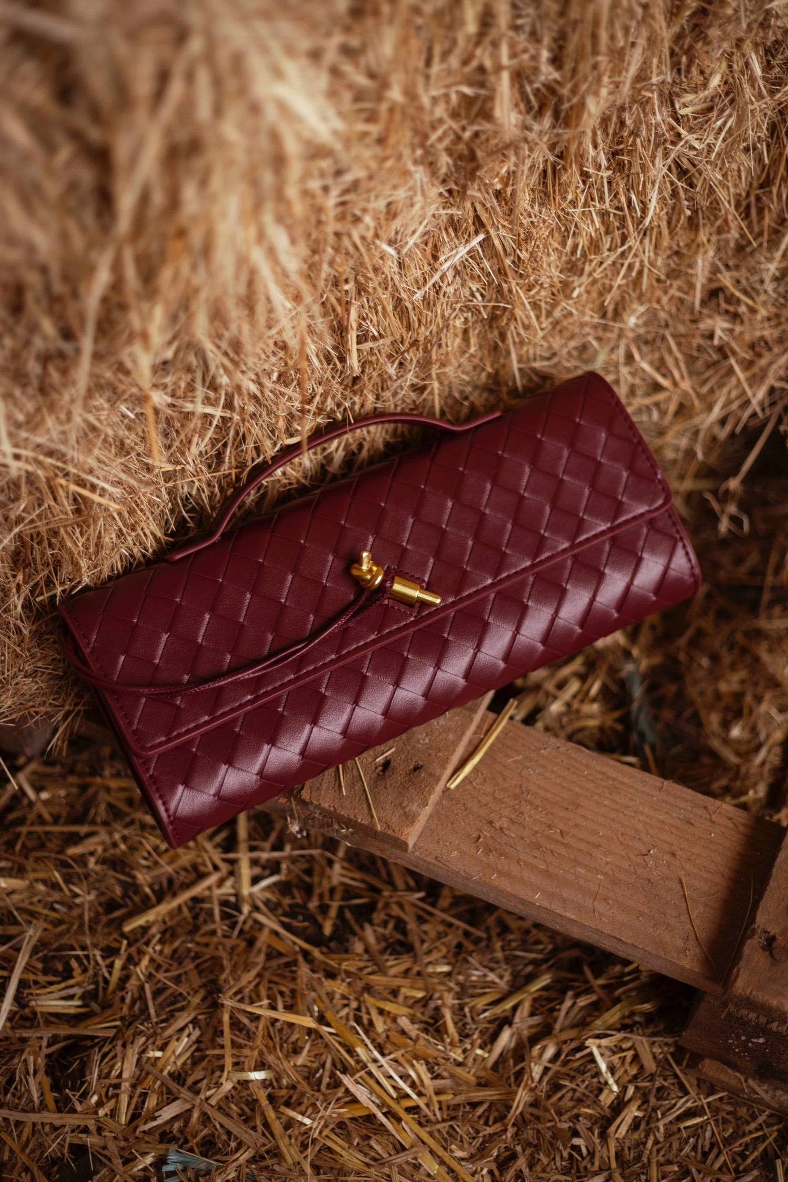 Deze lange pochette in diep bordeaux is geweven voor een rijke, luxueuze uitstraling. Het subtiele gouden detail geeft net dat beetje extra glans, ideaal voor zowel herfstige dagen als elegante avonden.