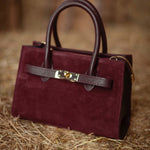Een stevige handtas van bordeaux suède die perfect is voor de herfst. Praktisch en stijlvol, ideaal om mee te nemen tijdens frisse dagen.
