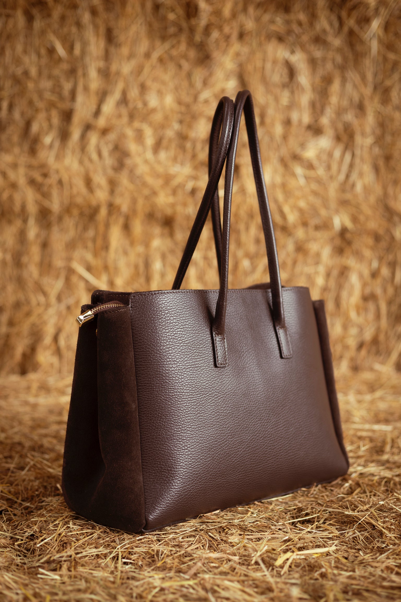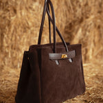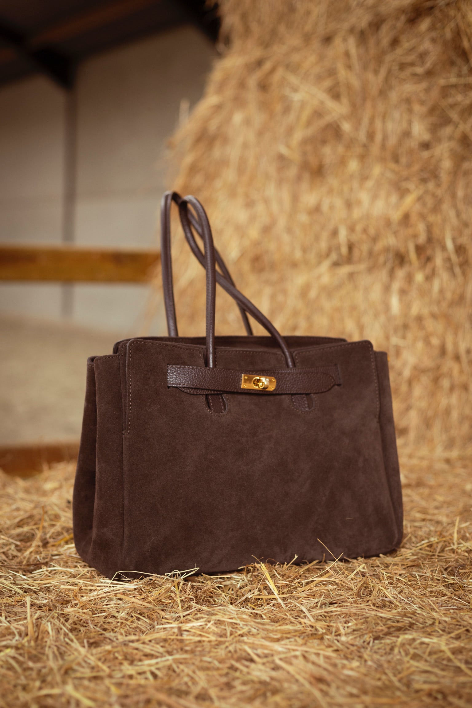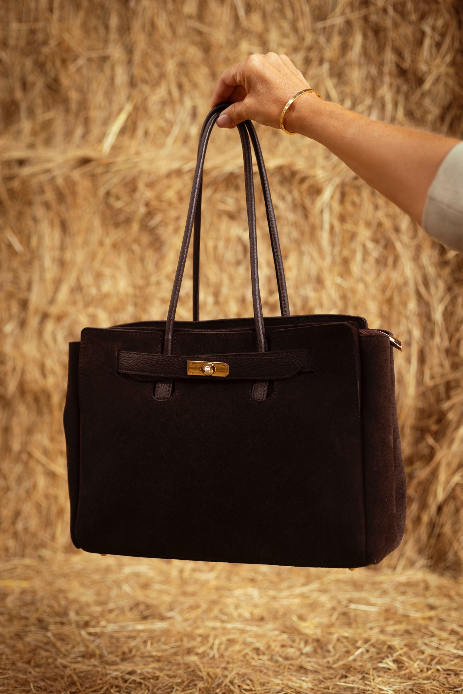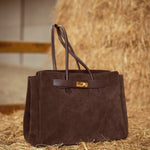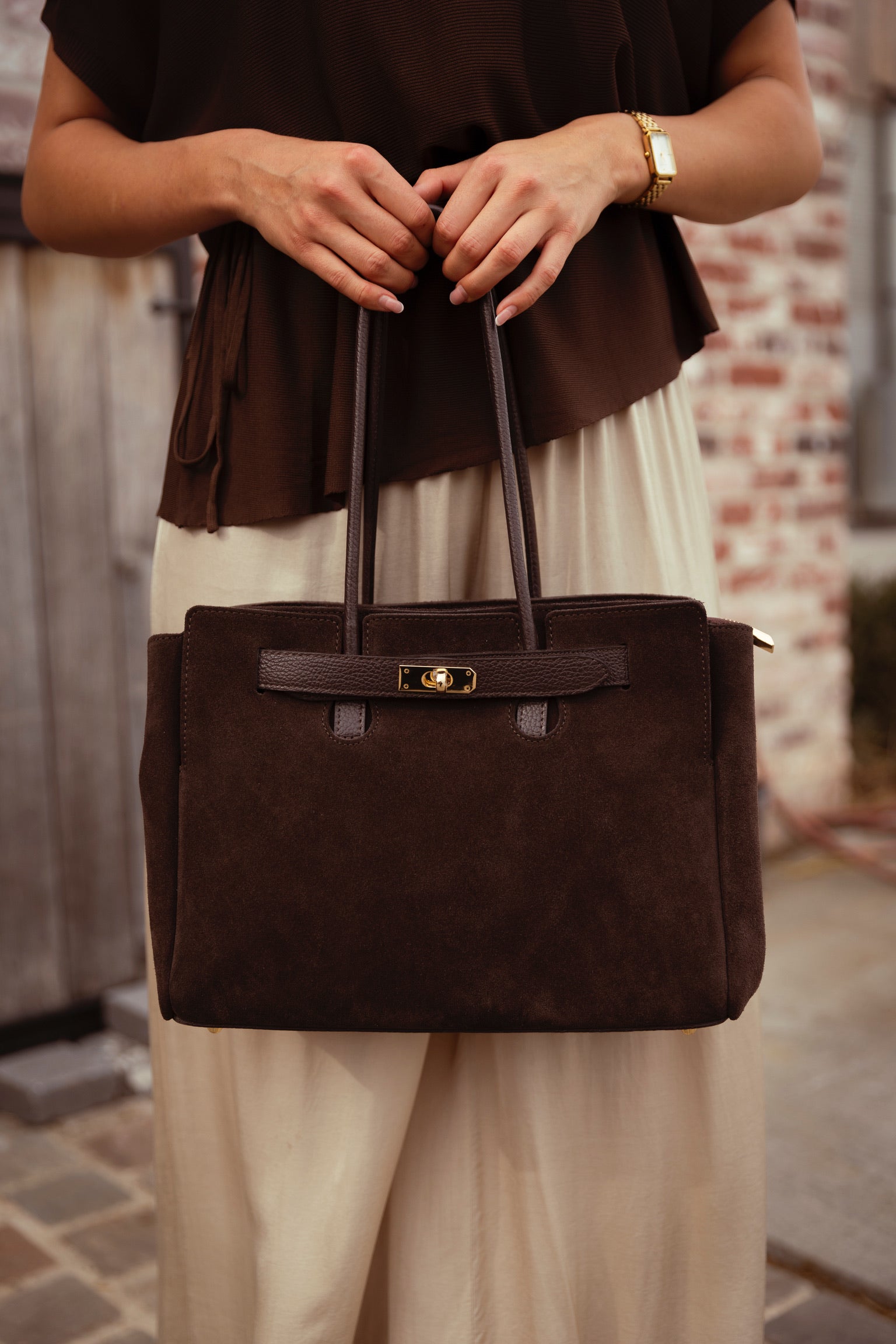 Een stijlvolle mix van suède en glad leder in warme bruintinten die meteen diepte en elegantie geeft. Het formaat is precies goed: ruim genoeg voor je essentials, compact genoeg om overal mee te nemen. Een verfijnde herfsttas met subtiele western flair.