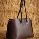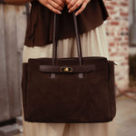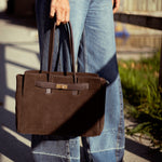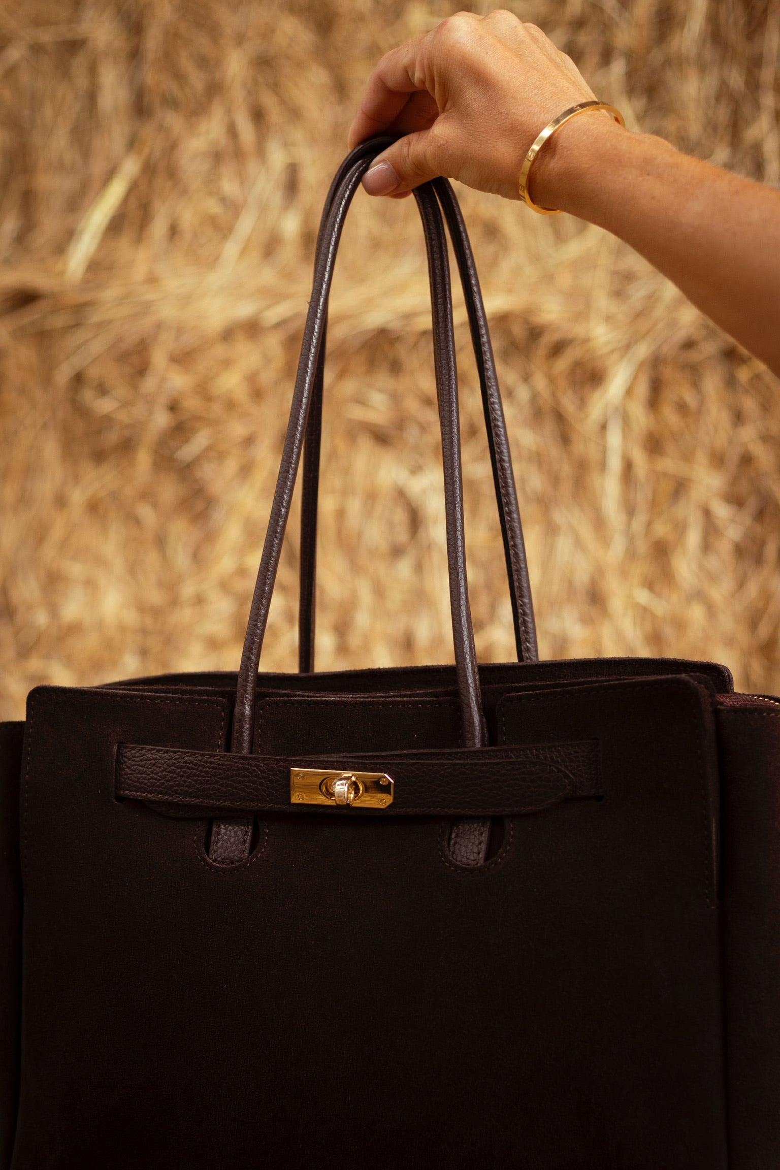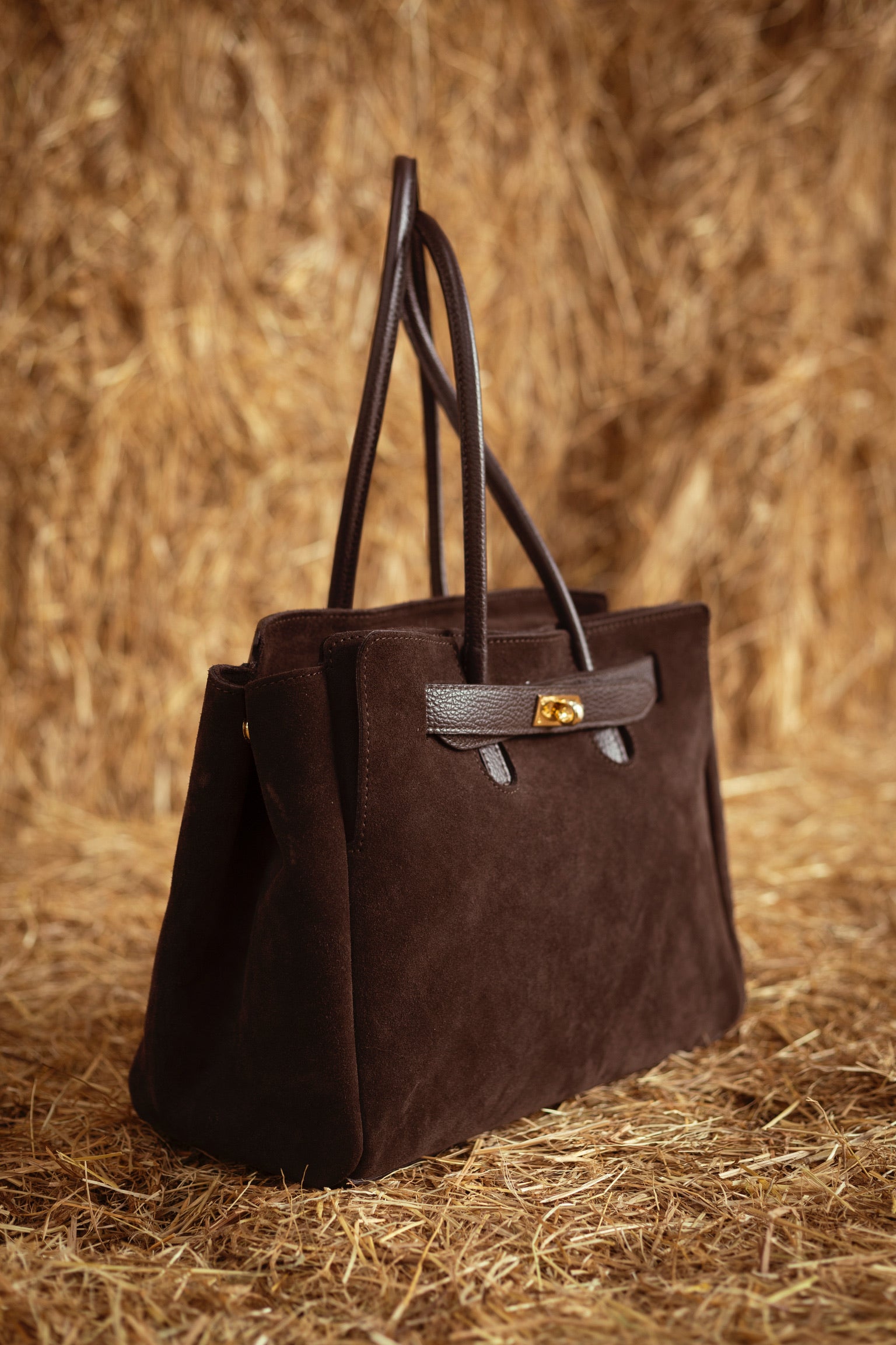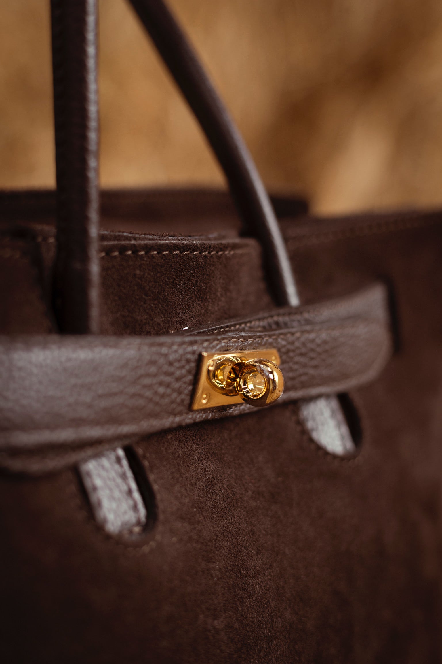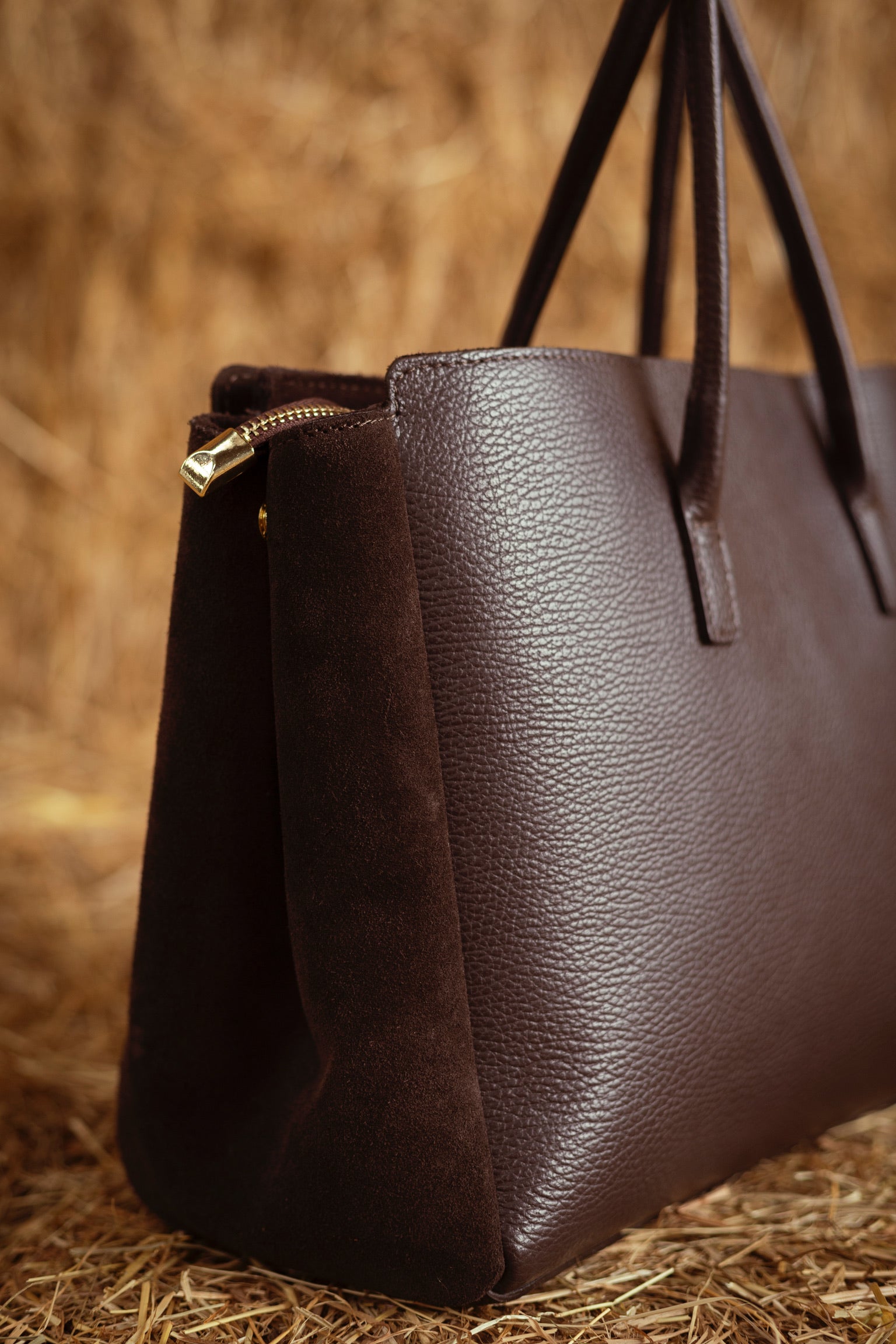 Een stijlvolle mix van suède en glad leder in warme bruintinten die meteen diepte en elegantie geeft. Het formaat is precies goed: ruim genoeg voor je essentials, compact genoeg om overal mee te nemen. Een verfijnde herfsttas met subtiele western flair.