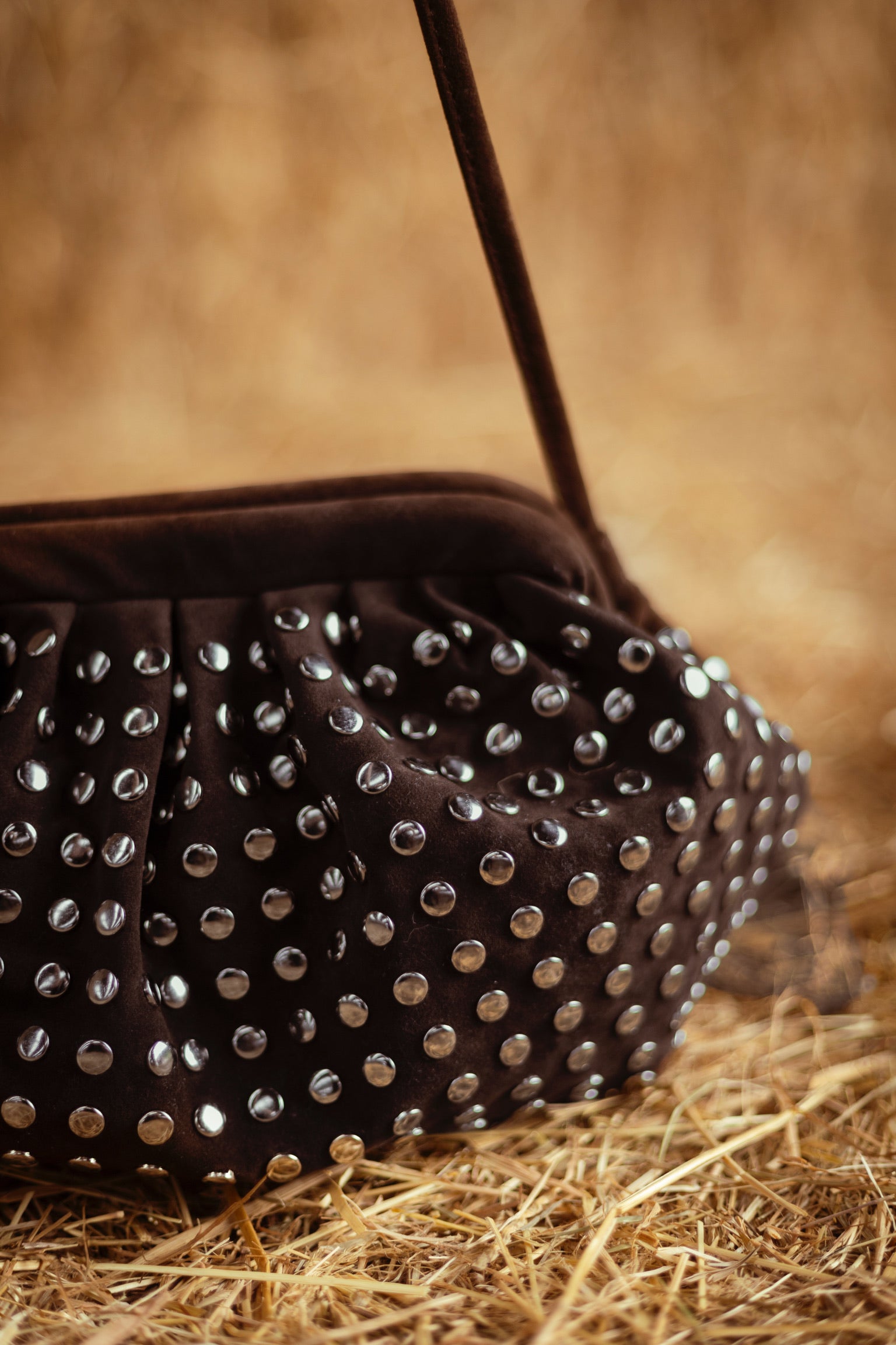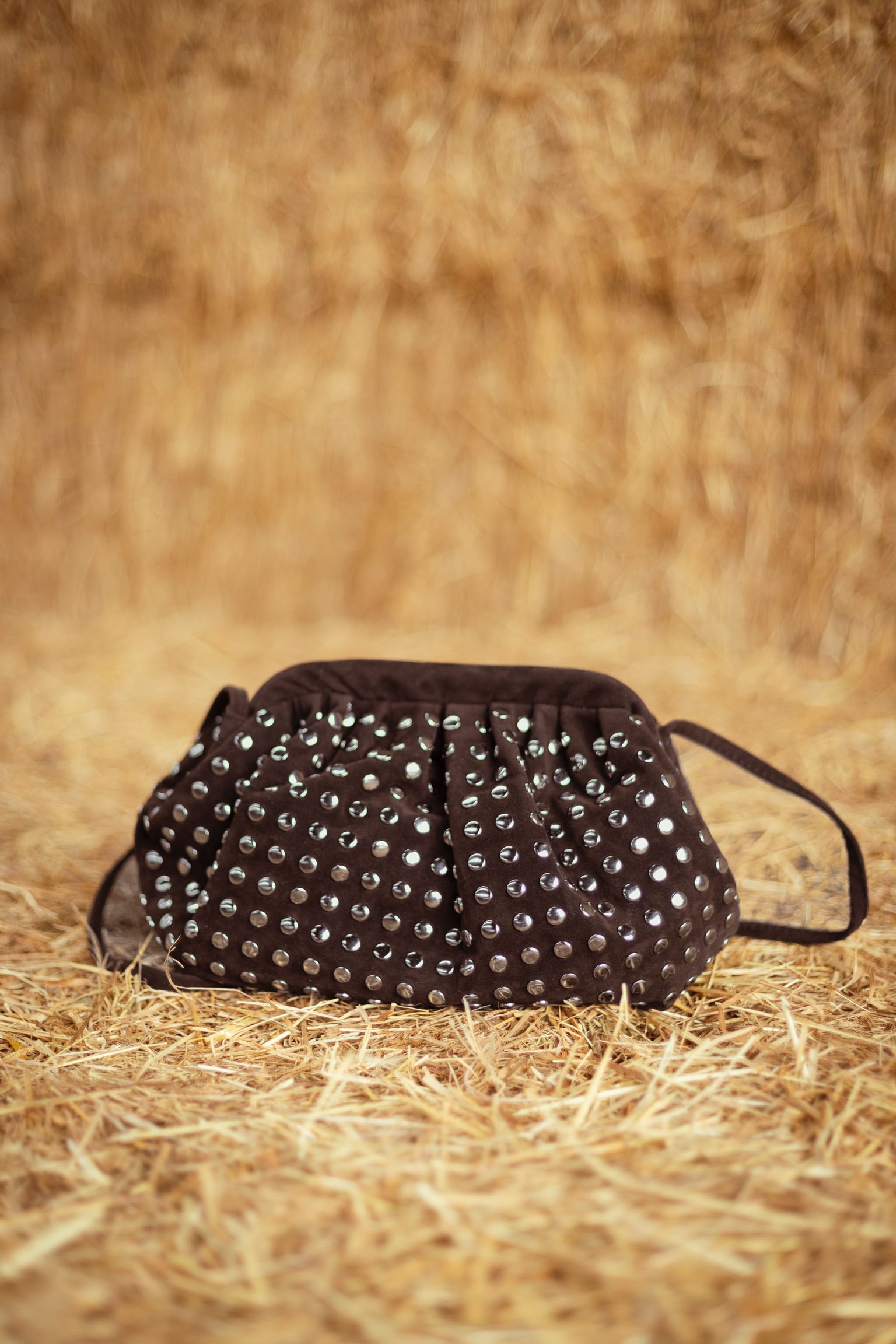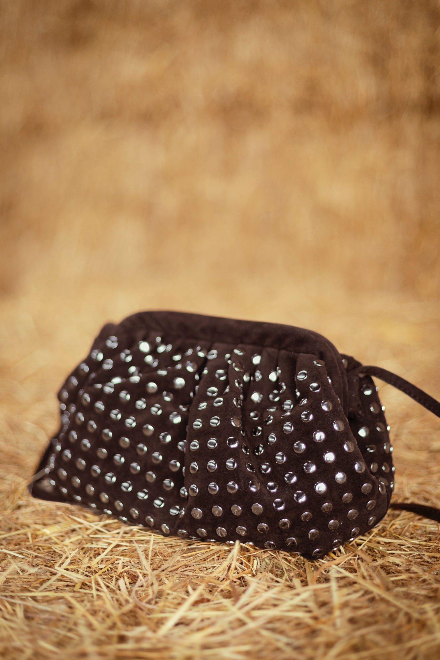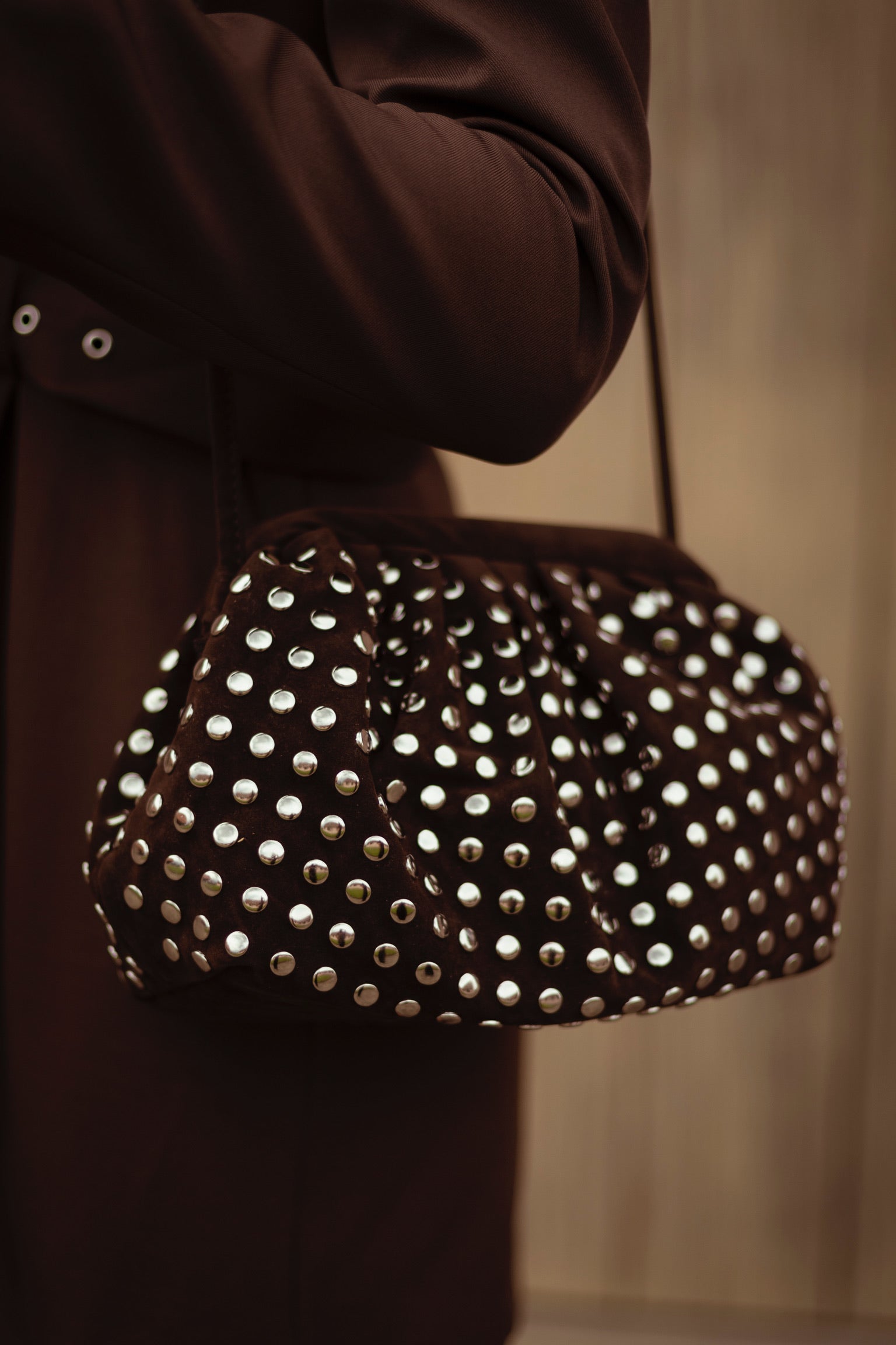 Deze tas in warm bruin is afgewerkt met stoere studs en geeft elke outfit een edgy twist. Draag hem als elegante pochette of gooi de band over je schouder voor een moeiteloze crossbody look. Een perfecte mix van rebels en verfijnd, klaar voor elke herfstdag.