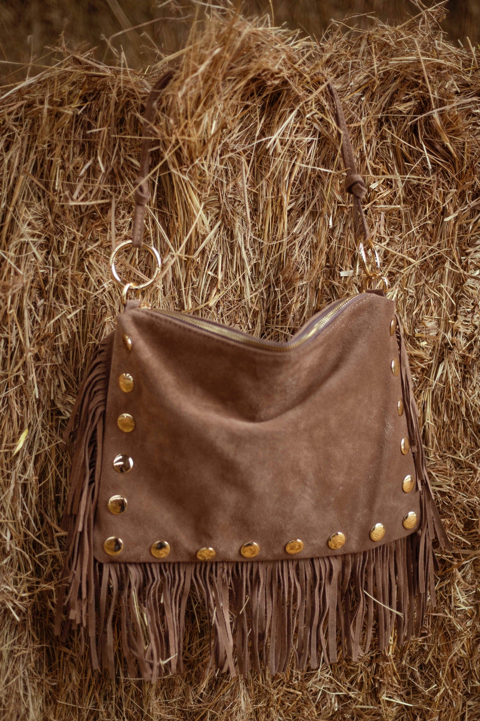 Deze taupe tas met franjes en studs brengt een perfecte mix van boho en rock in je herfstgarderobe. Een echte eyecatcher die elke outfit karakter geeft, van casual tot festival-ready.