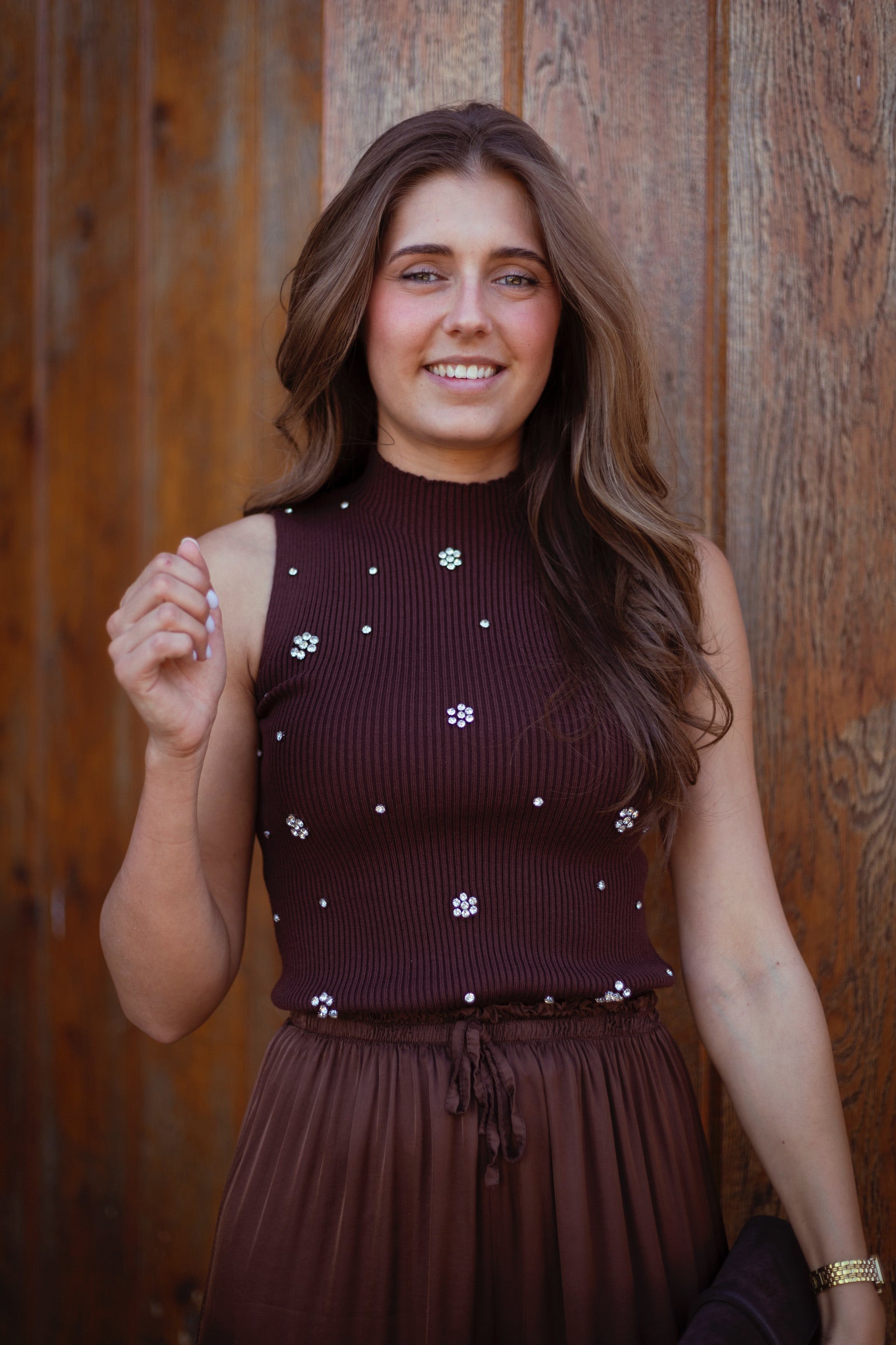 Een fijne geribde top met een elegante pasvorm, afgewerkt met fonkelende steentjes in diamantvorm voor een subtiel glamaccent. Combineert moeiteloos met een jeans of rok en geeft elke herfstlook een vleugje sparkle.