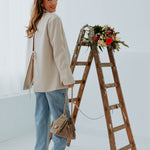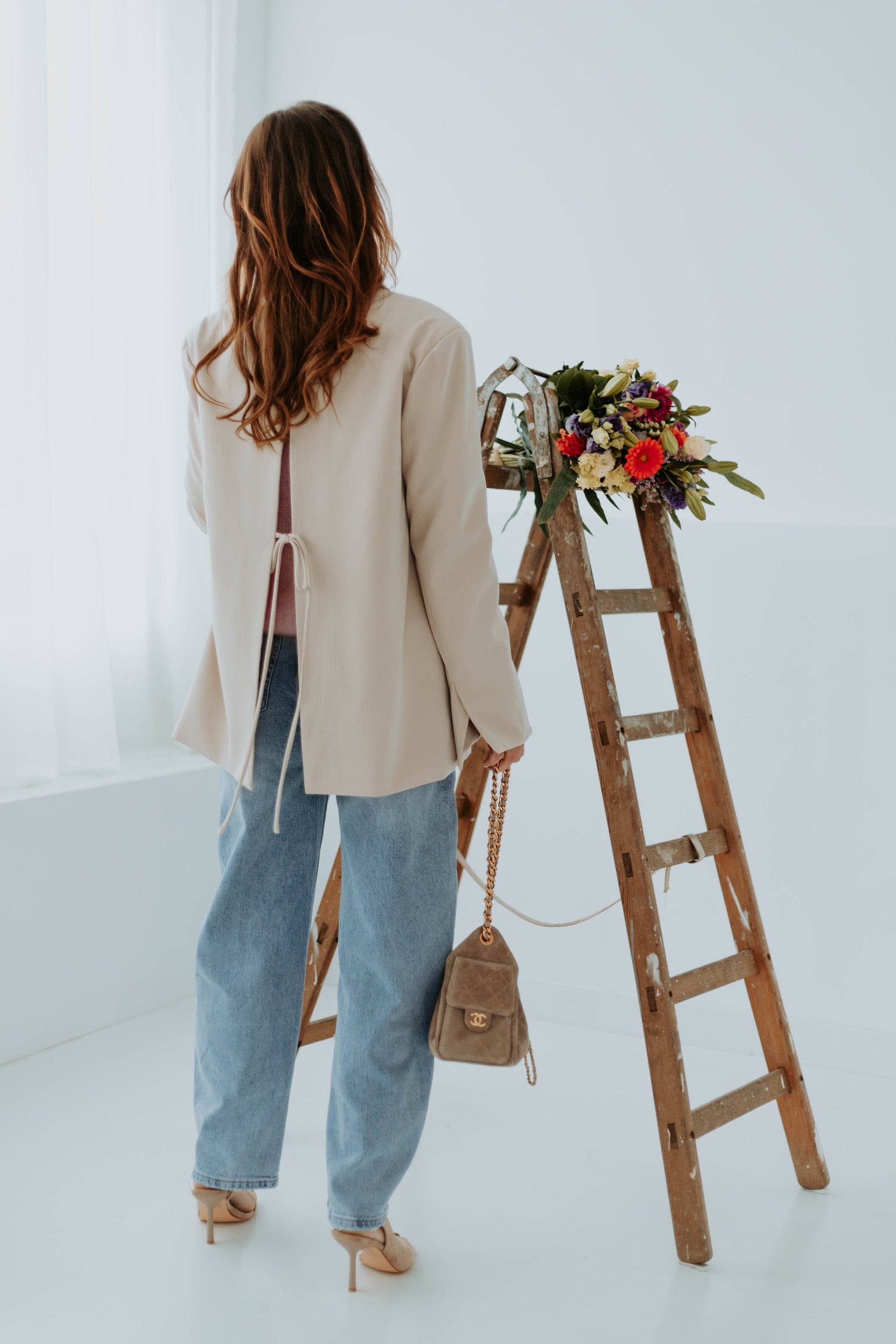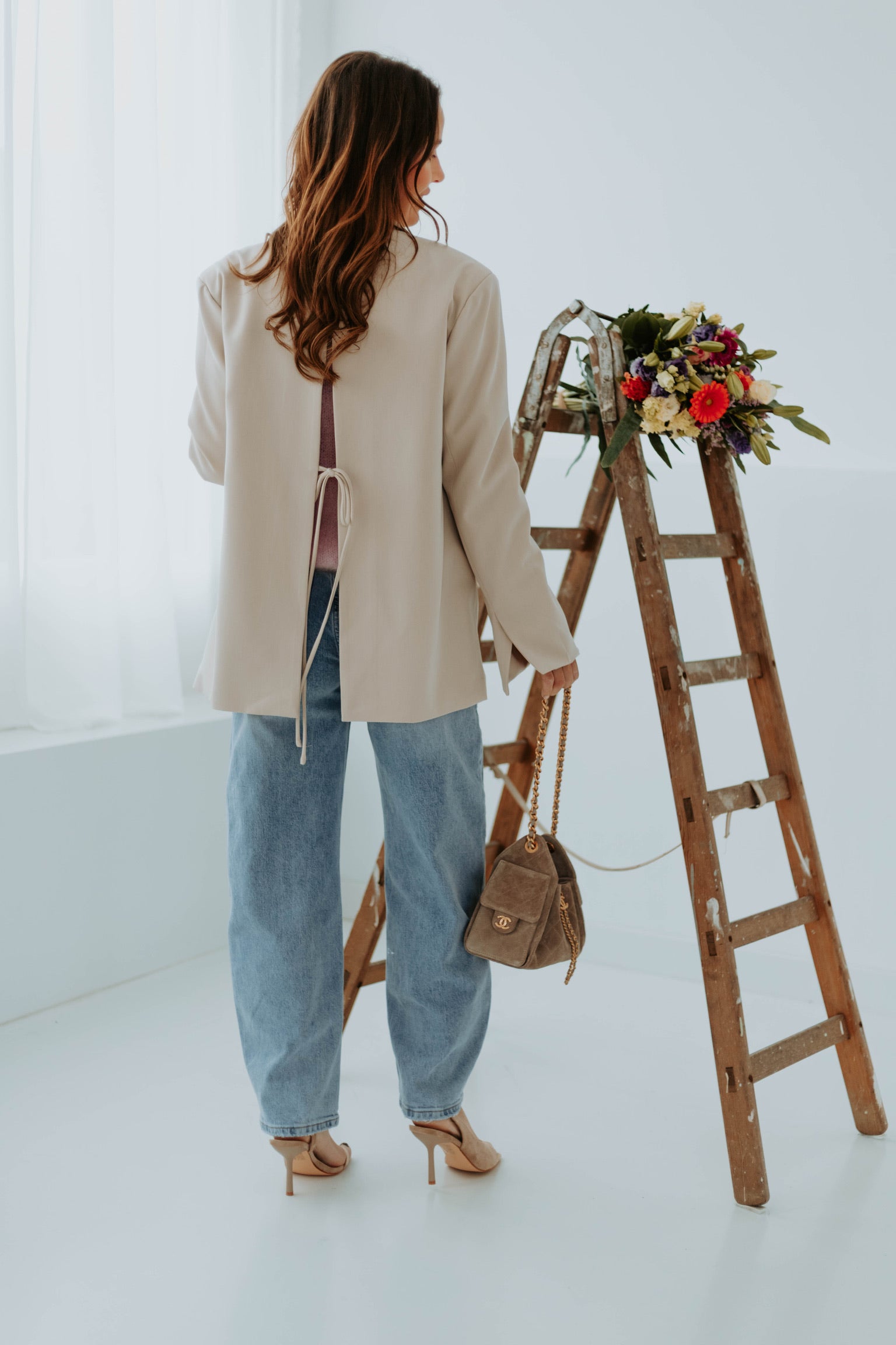 De zachte beige tint zorgt voor een lichte en verfijnde uitstraling. De open rug geeft een verrassend en elegant detail dat de look net dat beetje extra karakter geeft. Perfect om klassiek en modern moeiteloos met elkaar te combineren.