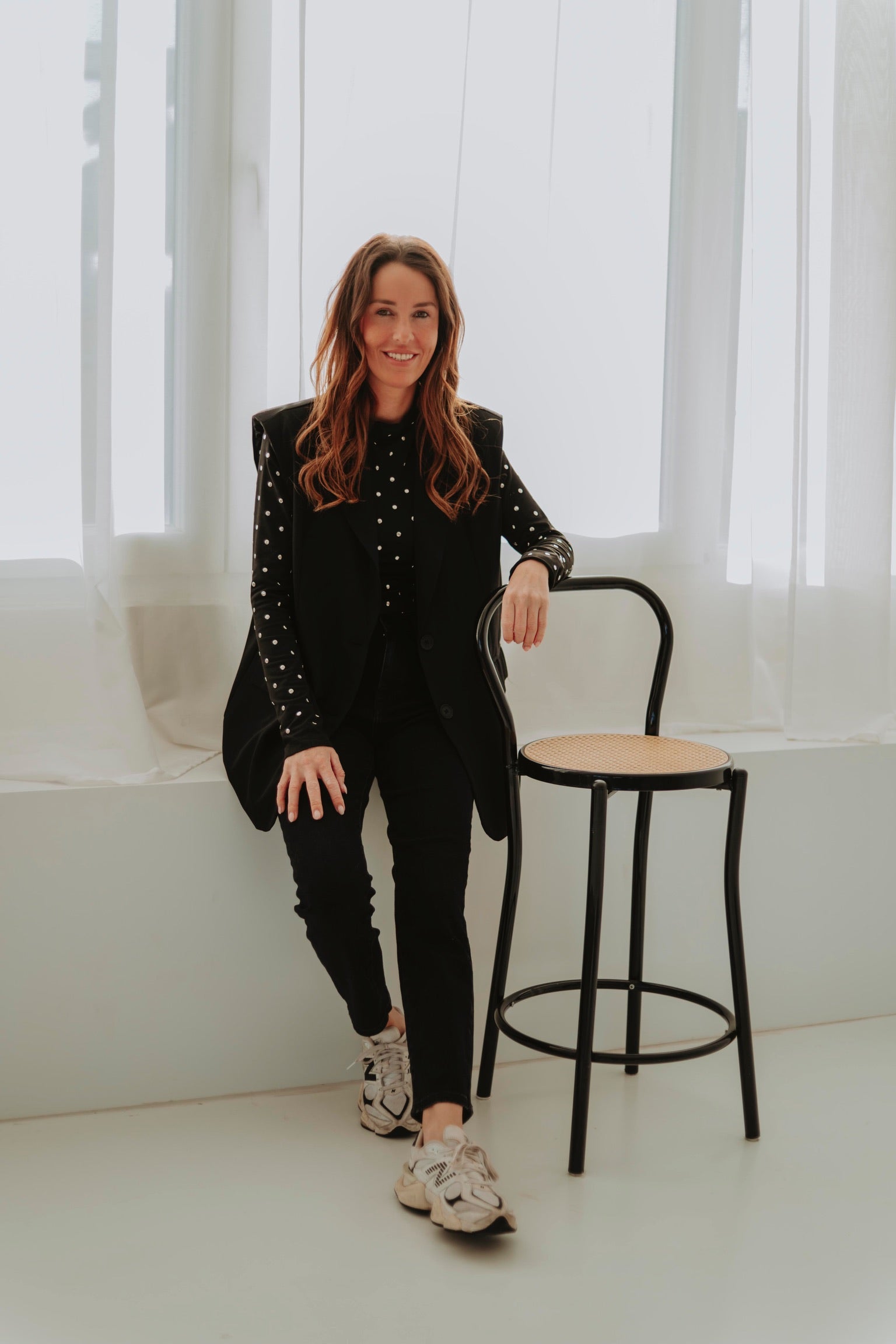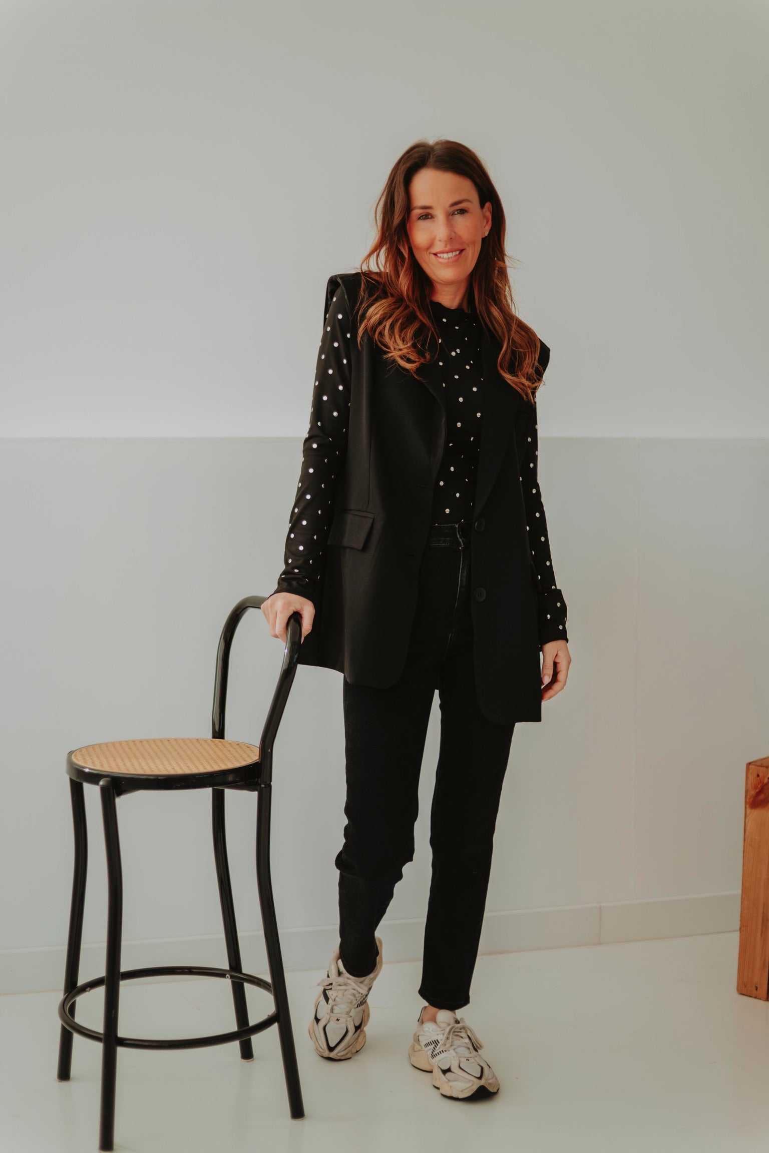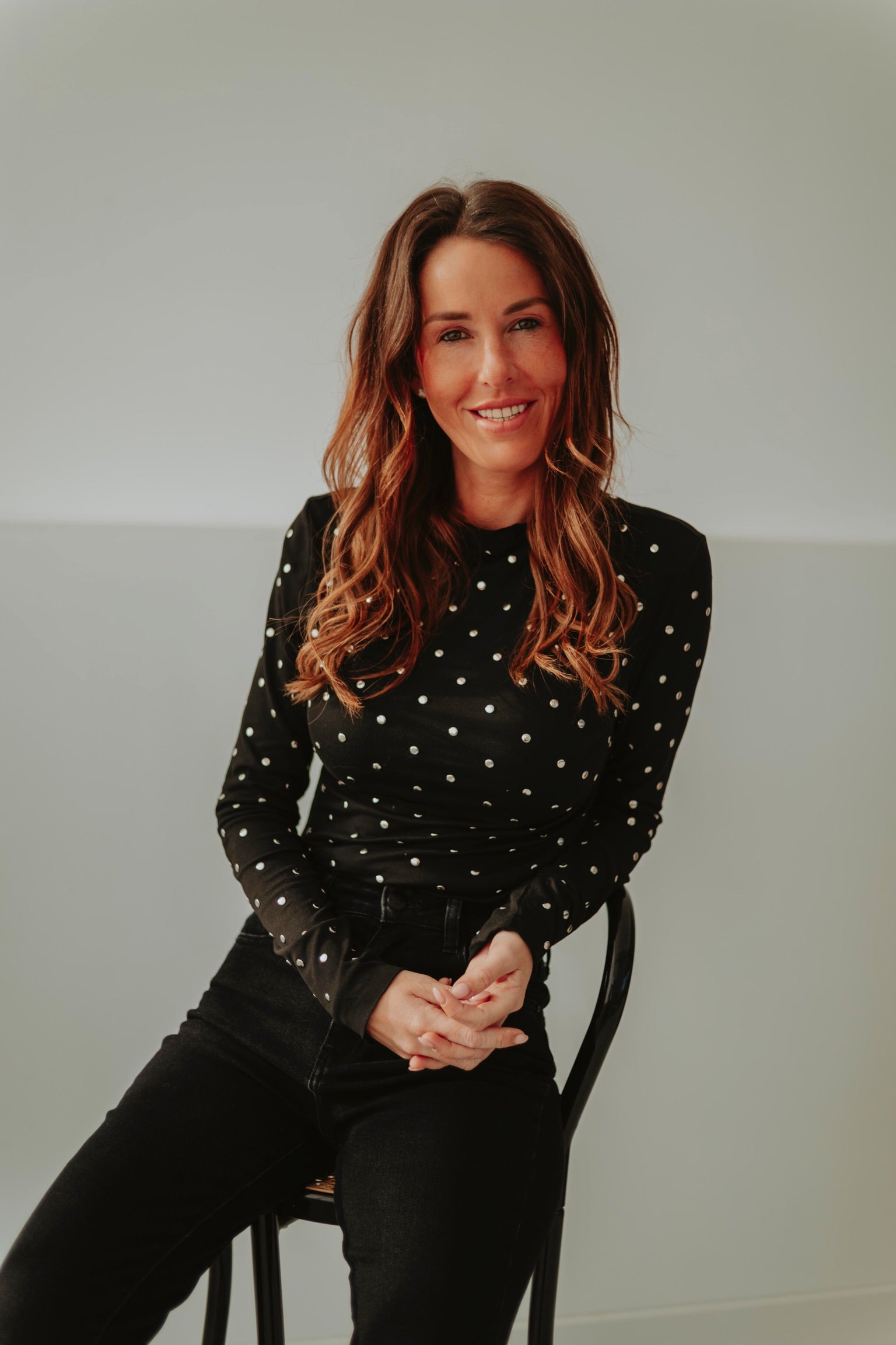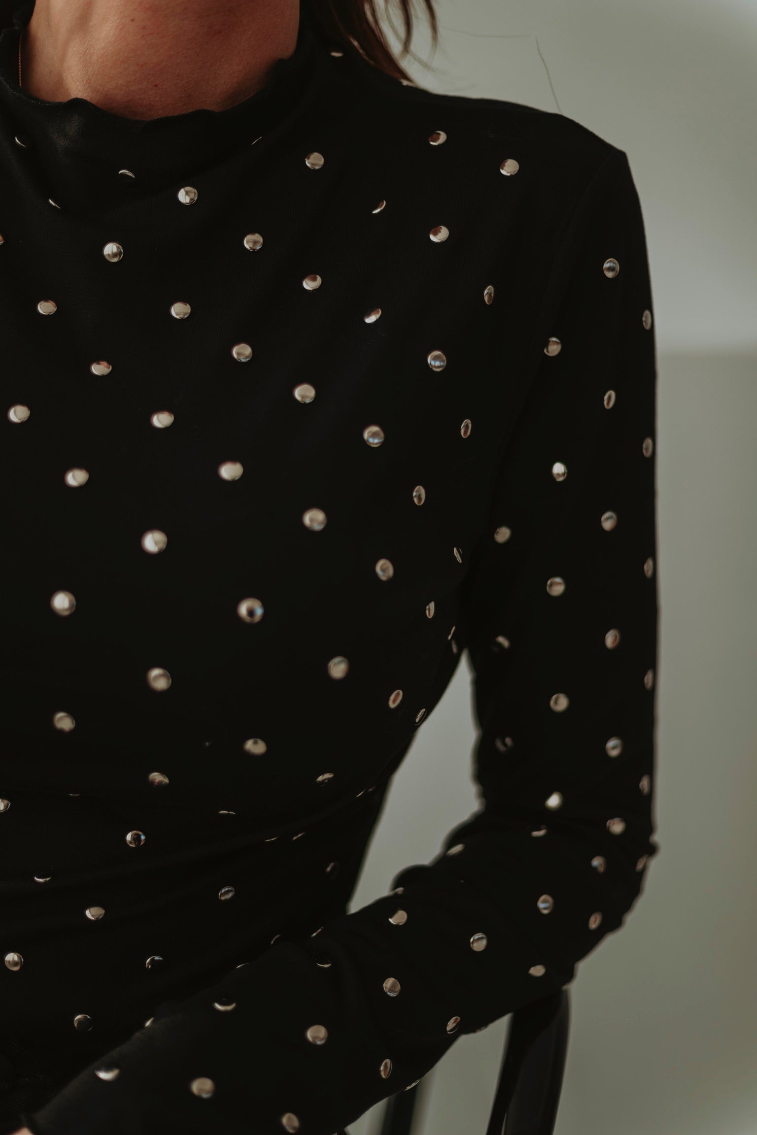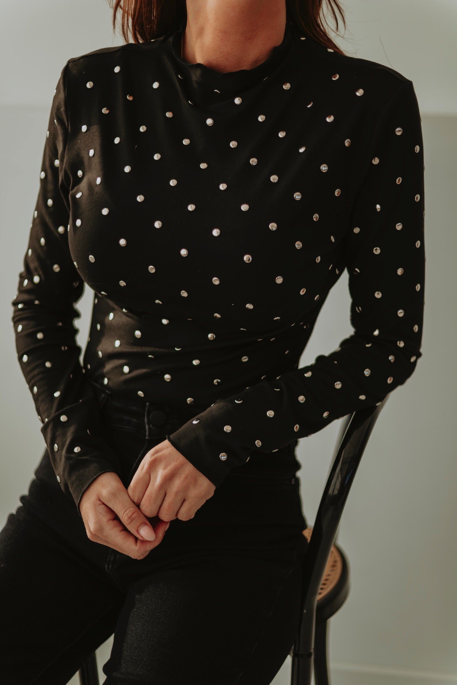 Een zwart longsleeve shirt met opvallende studs die meteen een stoere en edgy uitstraling geven. Licht van stof en perfect voor frisse lentedagen, alleen of als opvallend laagje onder een blazer. Speels, krachtig en een echte statement-piece voor je outfit.