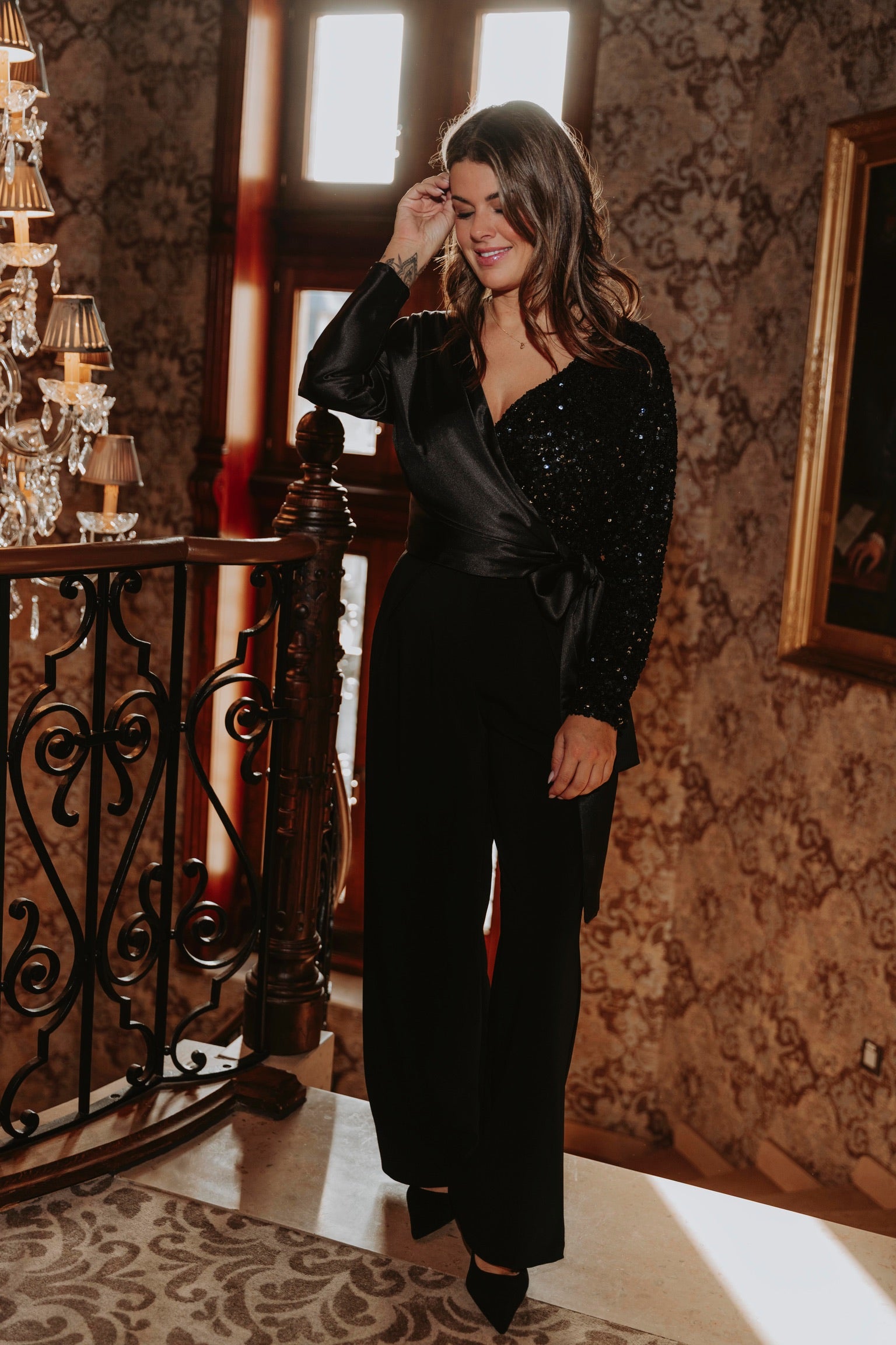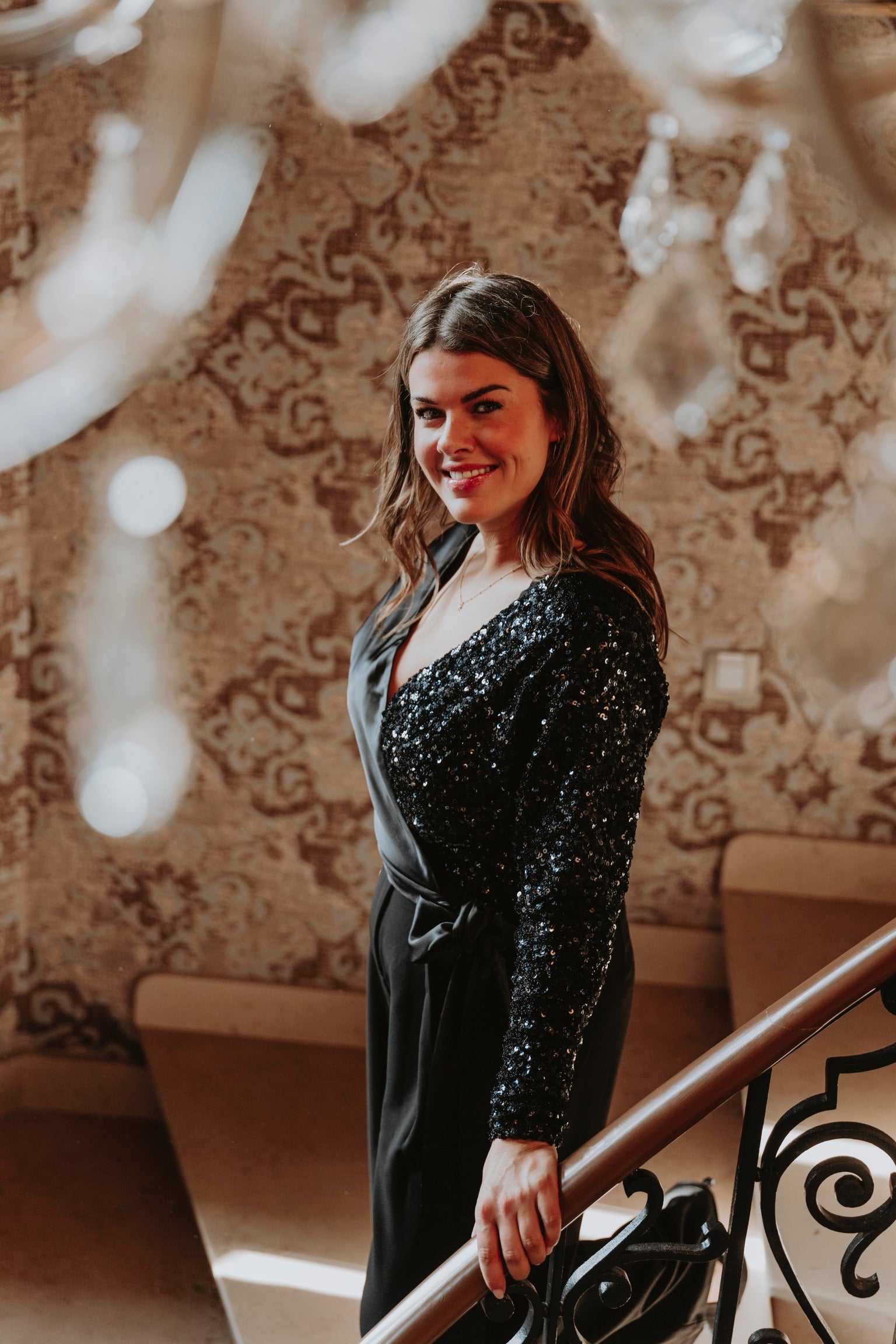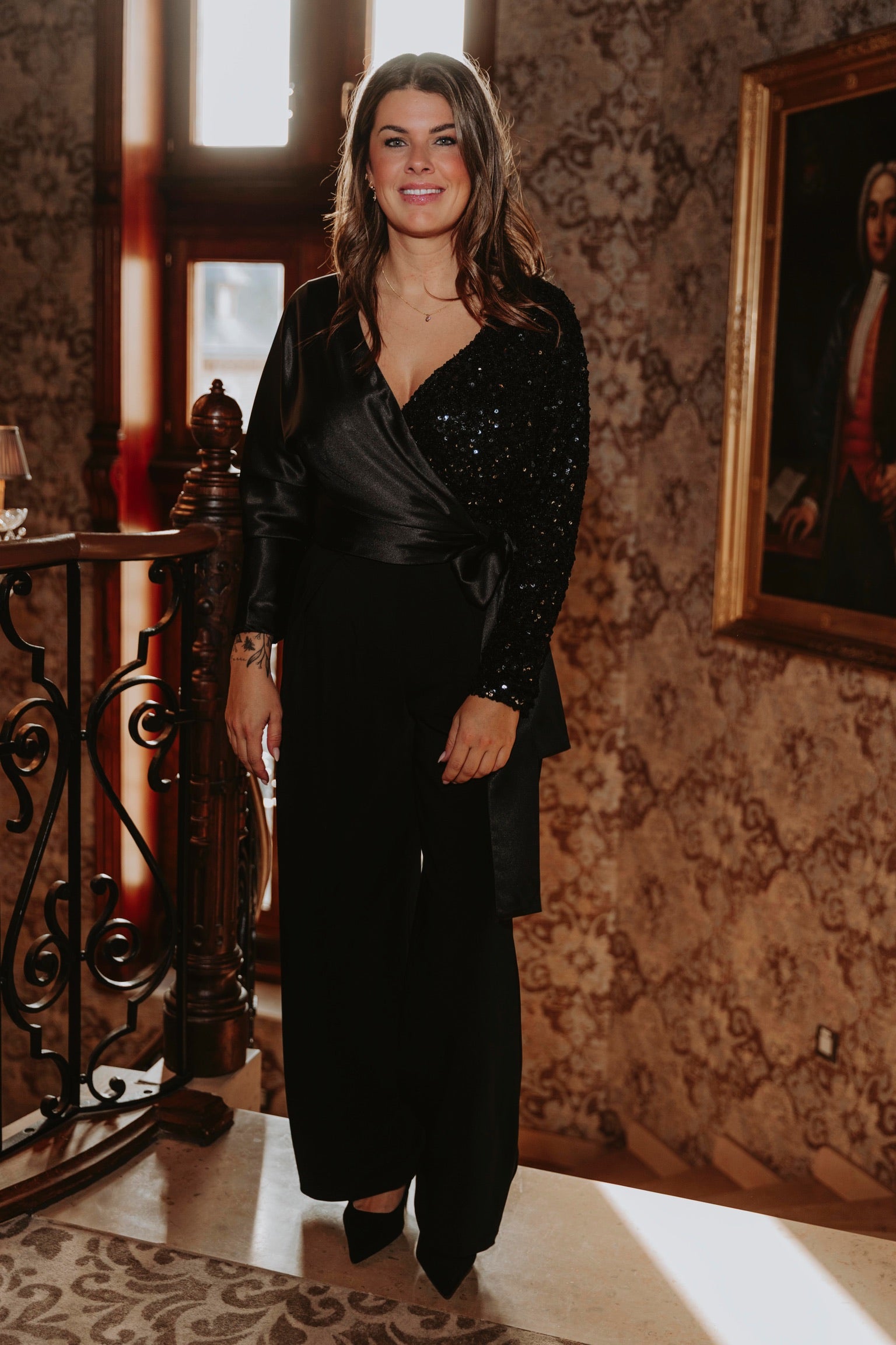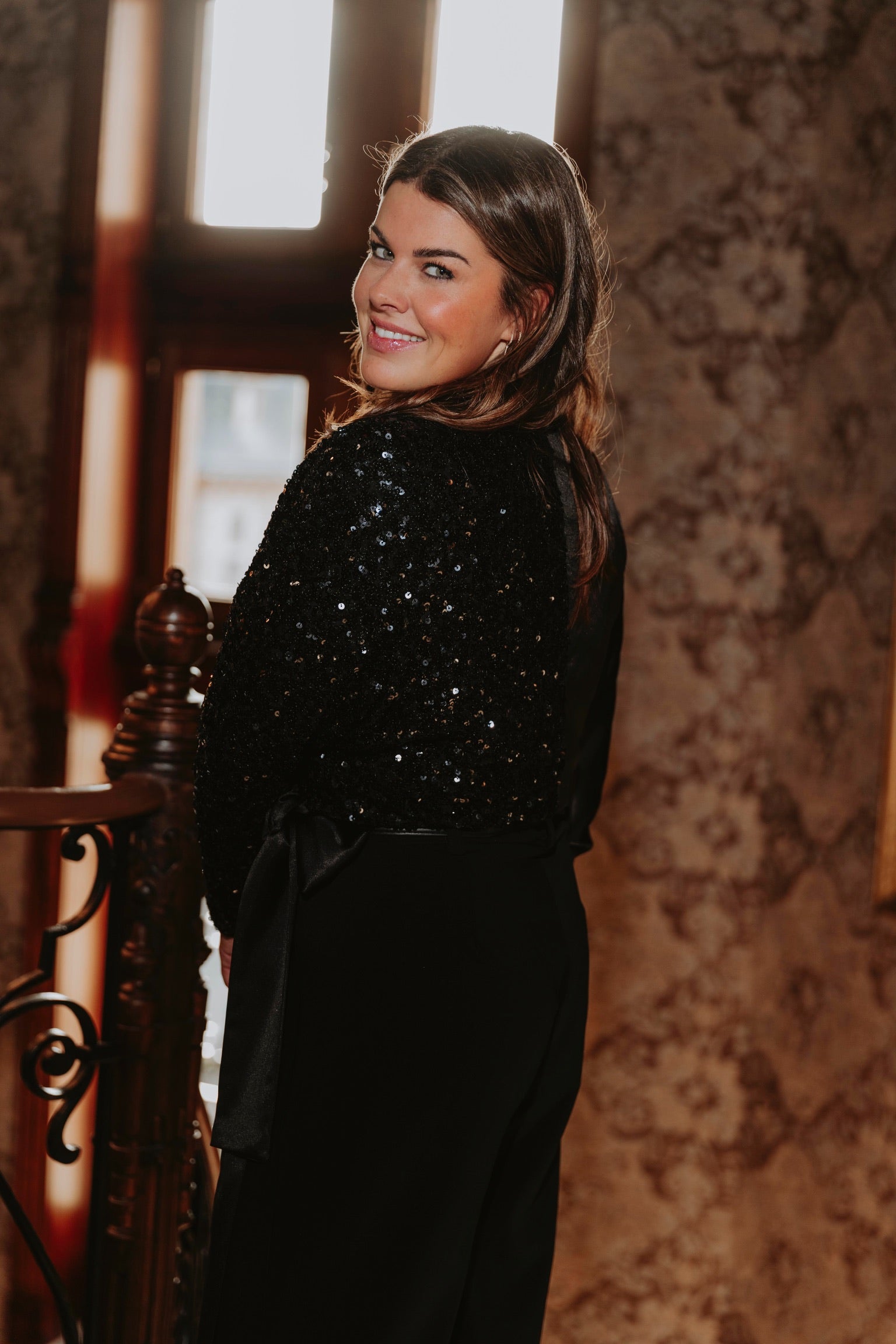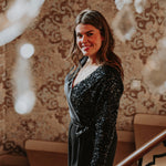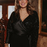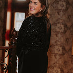 Een elegante blouse van zwart satijn die schittert dankzij de sprankelende sequins. Het glanzende materiaal geeft een chique en feestelijke uitstraling bij elke beweging. Perfect om tijdens de feestdagen op te vallen met een verfijnde en sprankelende touch.